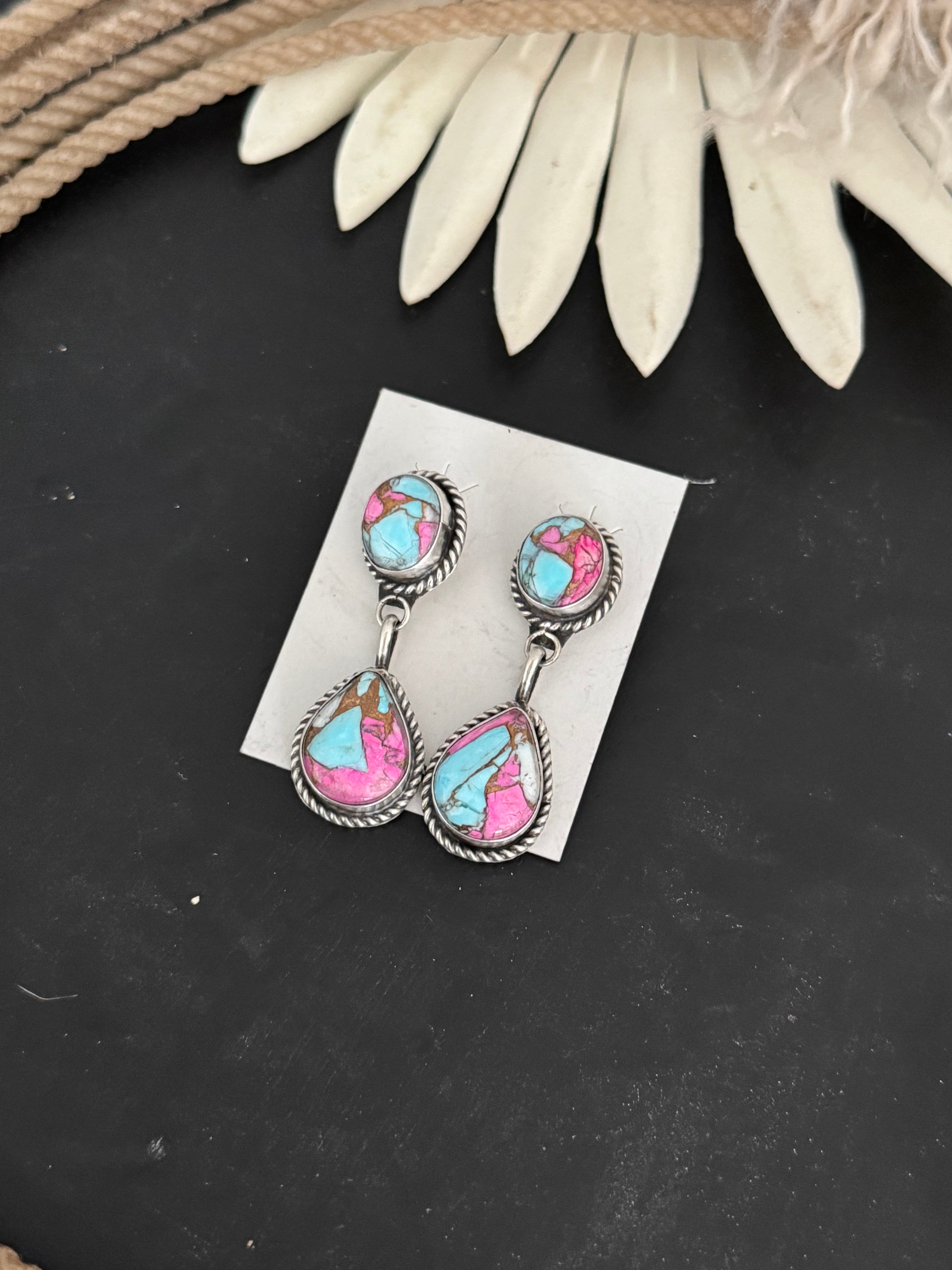 The most stunning colorful earrings. Freda Martinez Cotton Candy Composite & Sterling Silver Post Dangle Earrings. It measures 1 7/8 inches long and just over 5/8 of an inch wide. Stamped and signed.