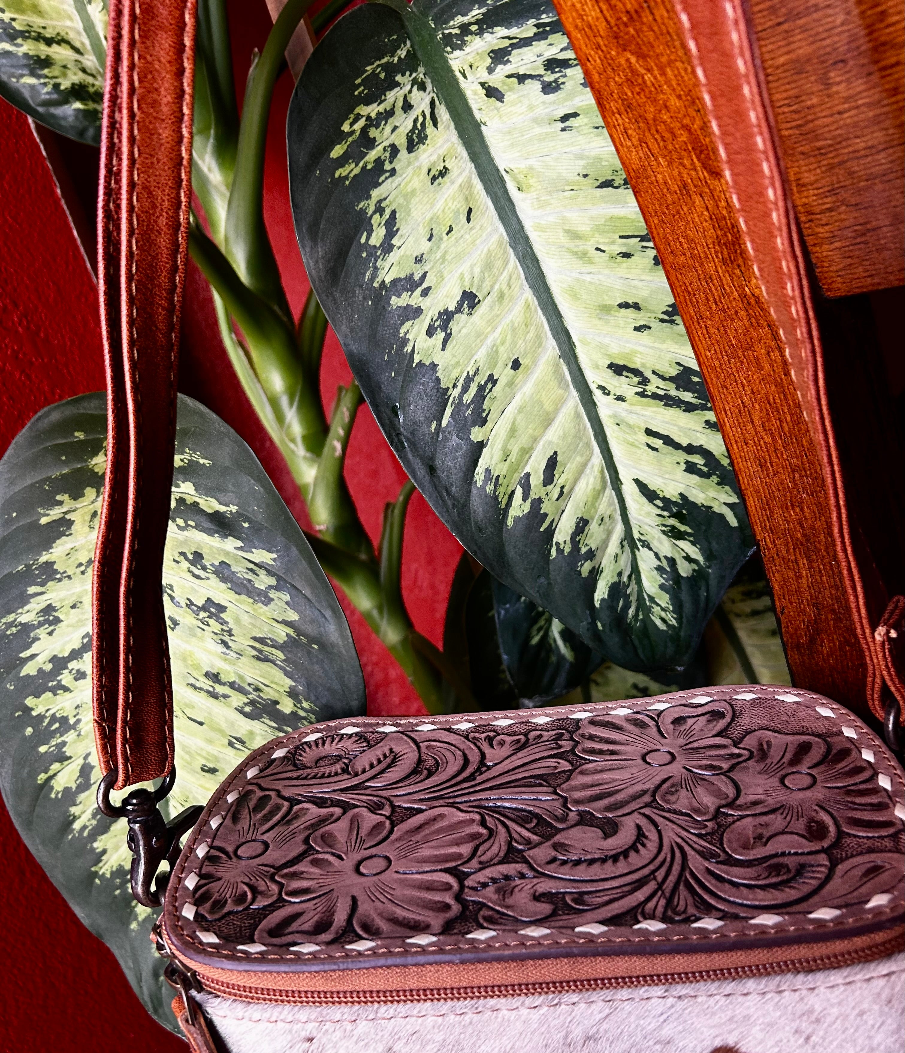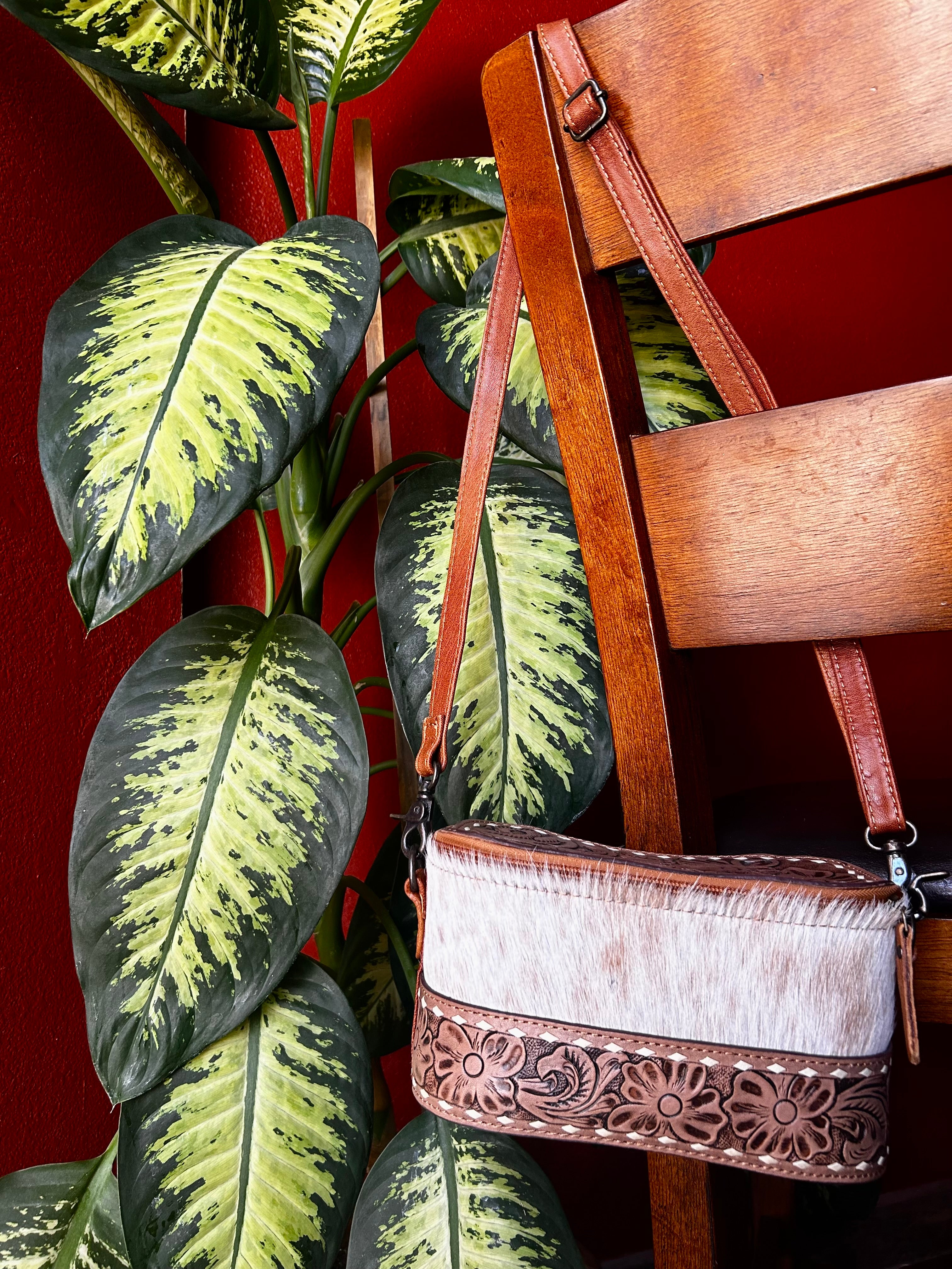 It measures 9 inches across and 5 inches in depth. Strap measures 40 inches long