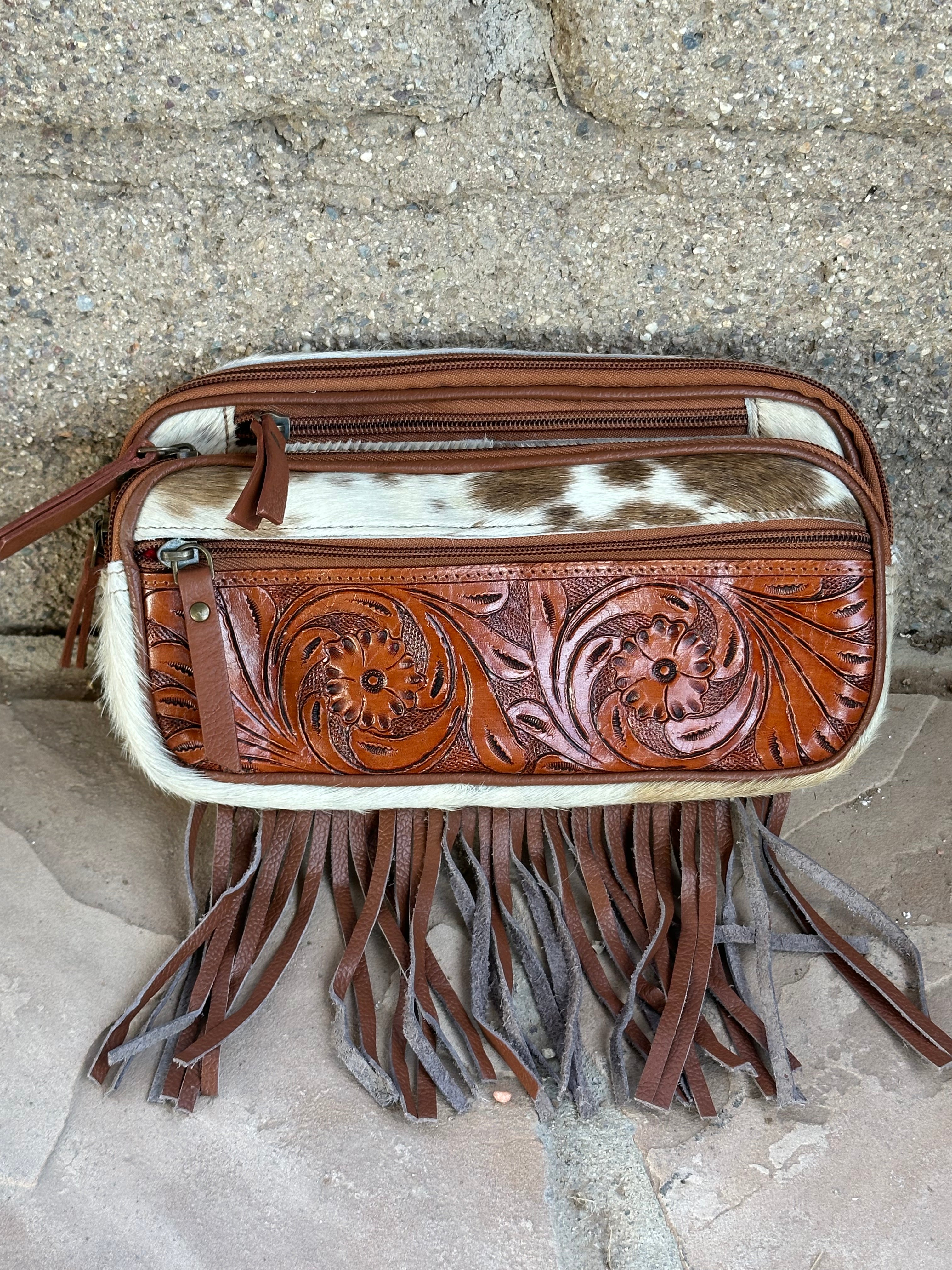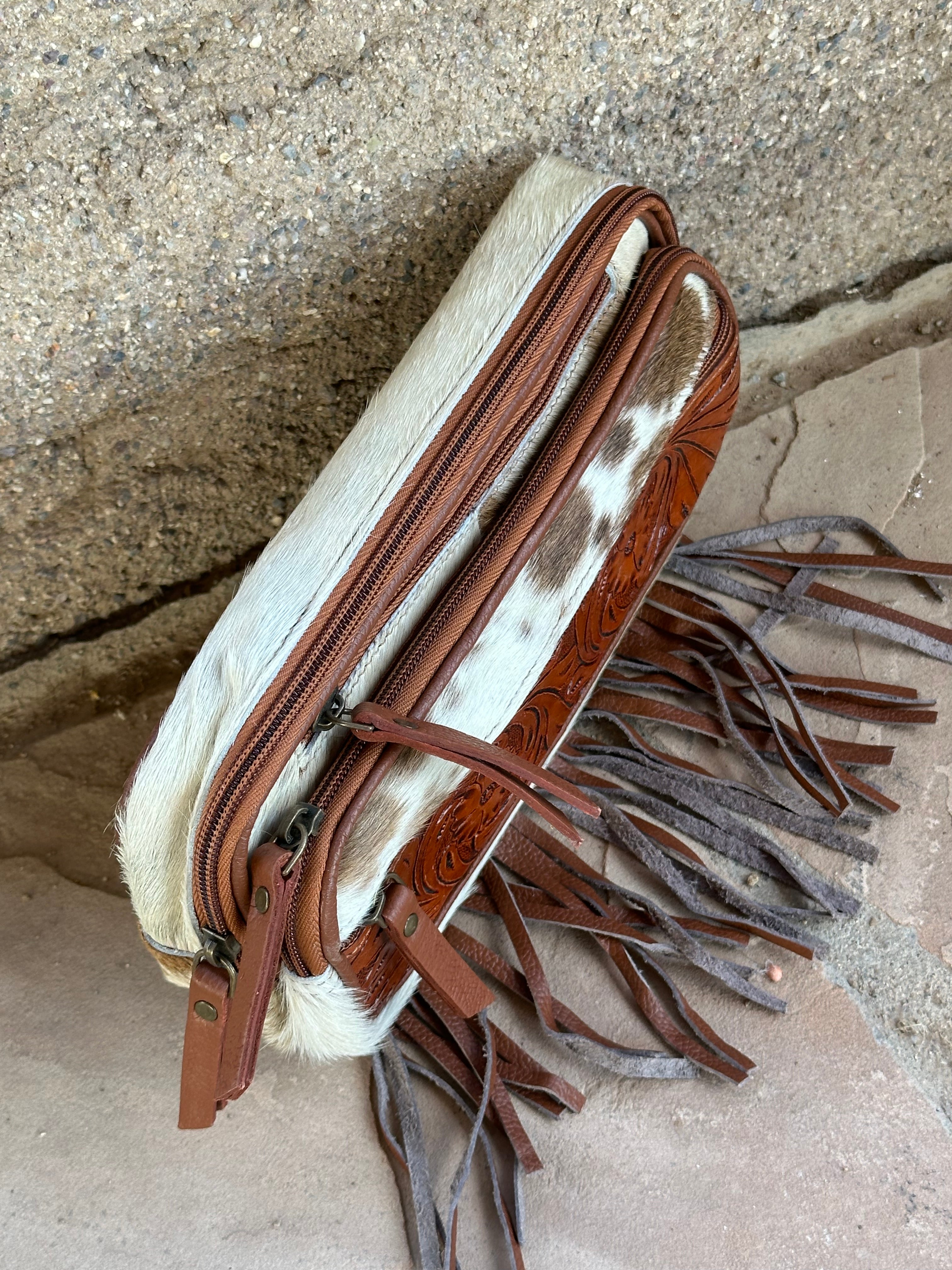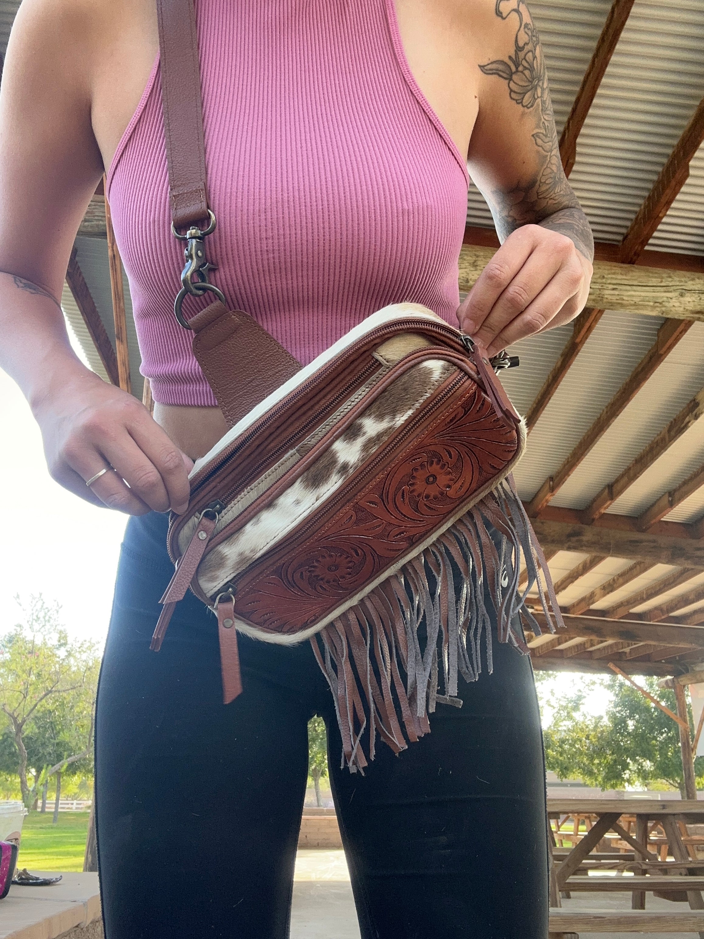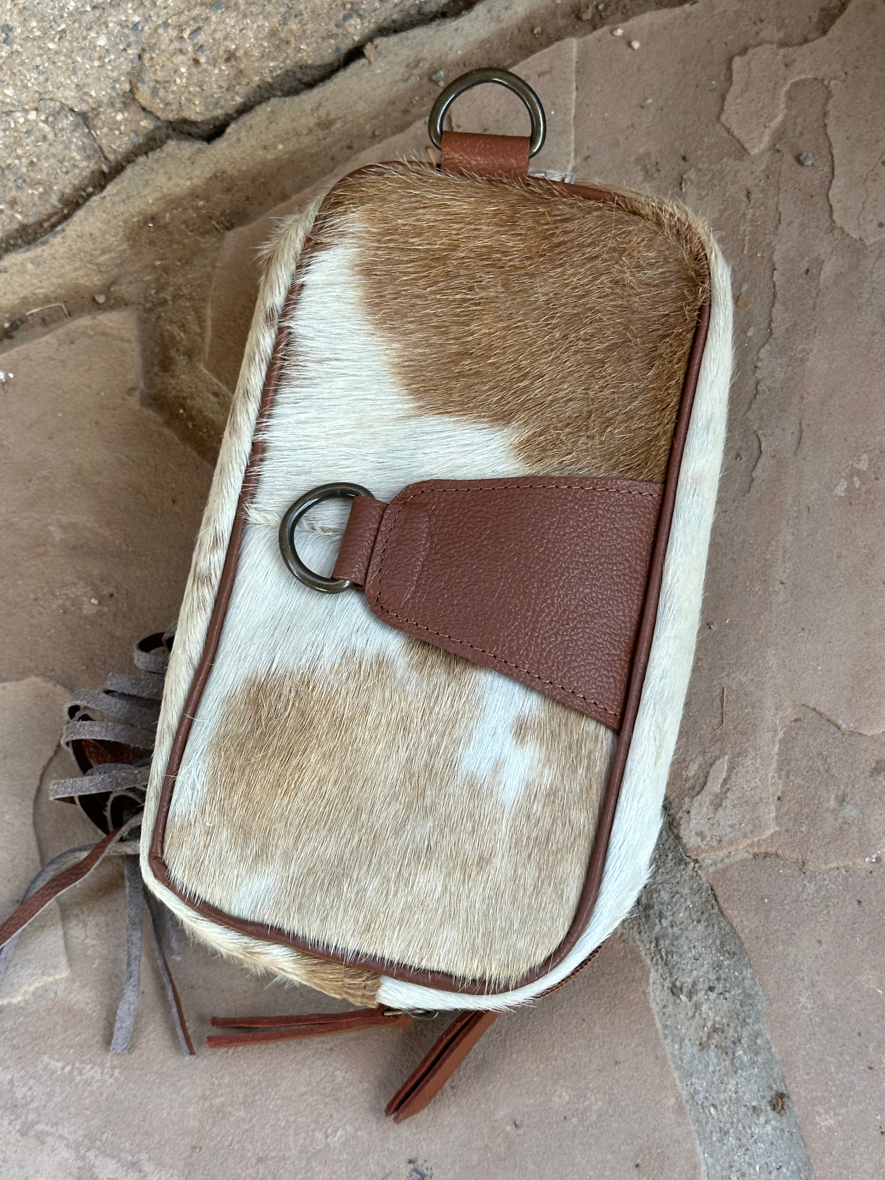 Genuine Leather Cowhide Duffle Bag. It measures 9 1/2 inches long and 5 1/2 inches in depth. Strap measures 55 inches long and can be adjusted smaller.