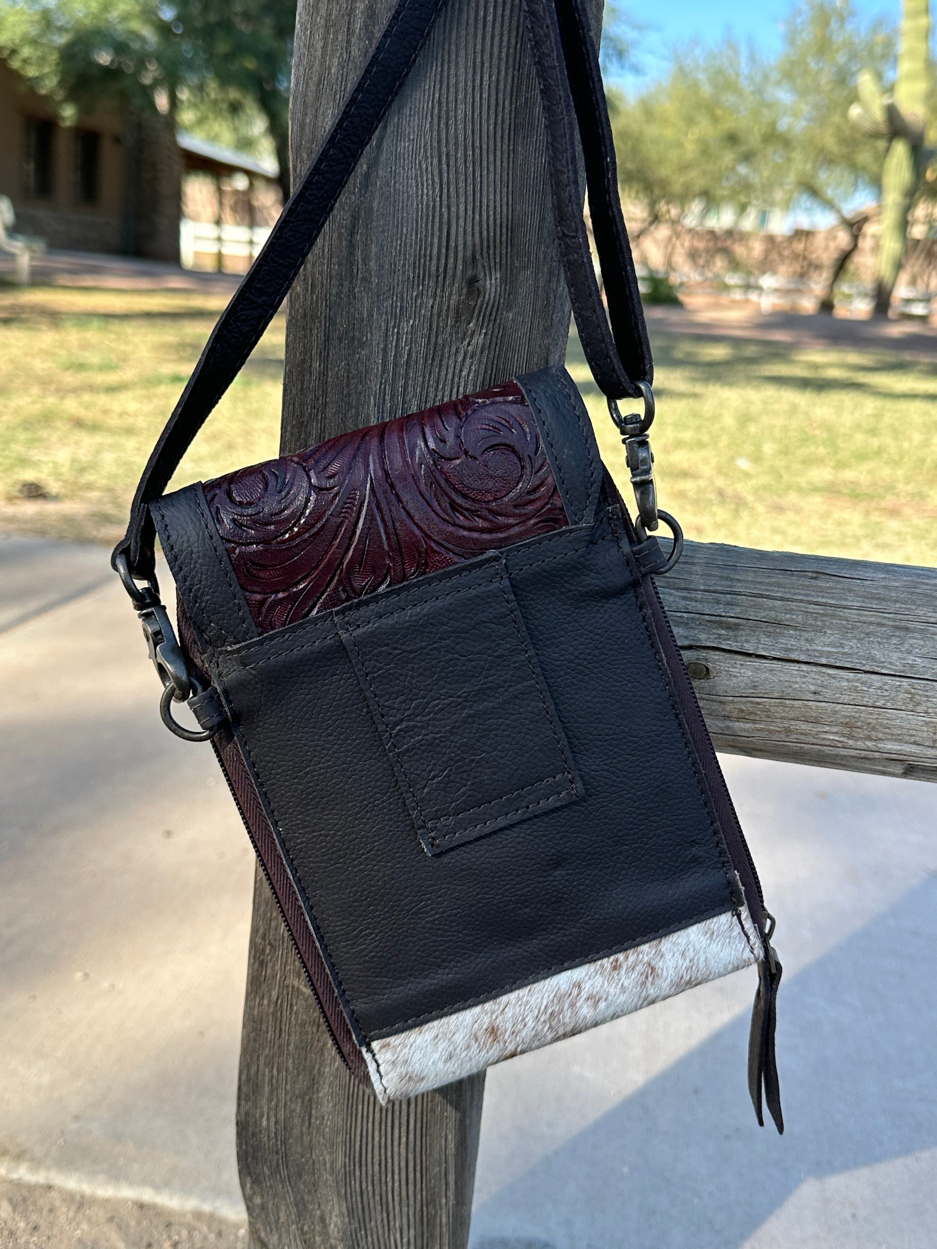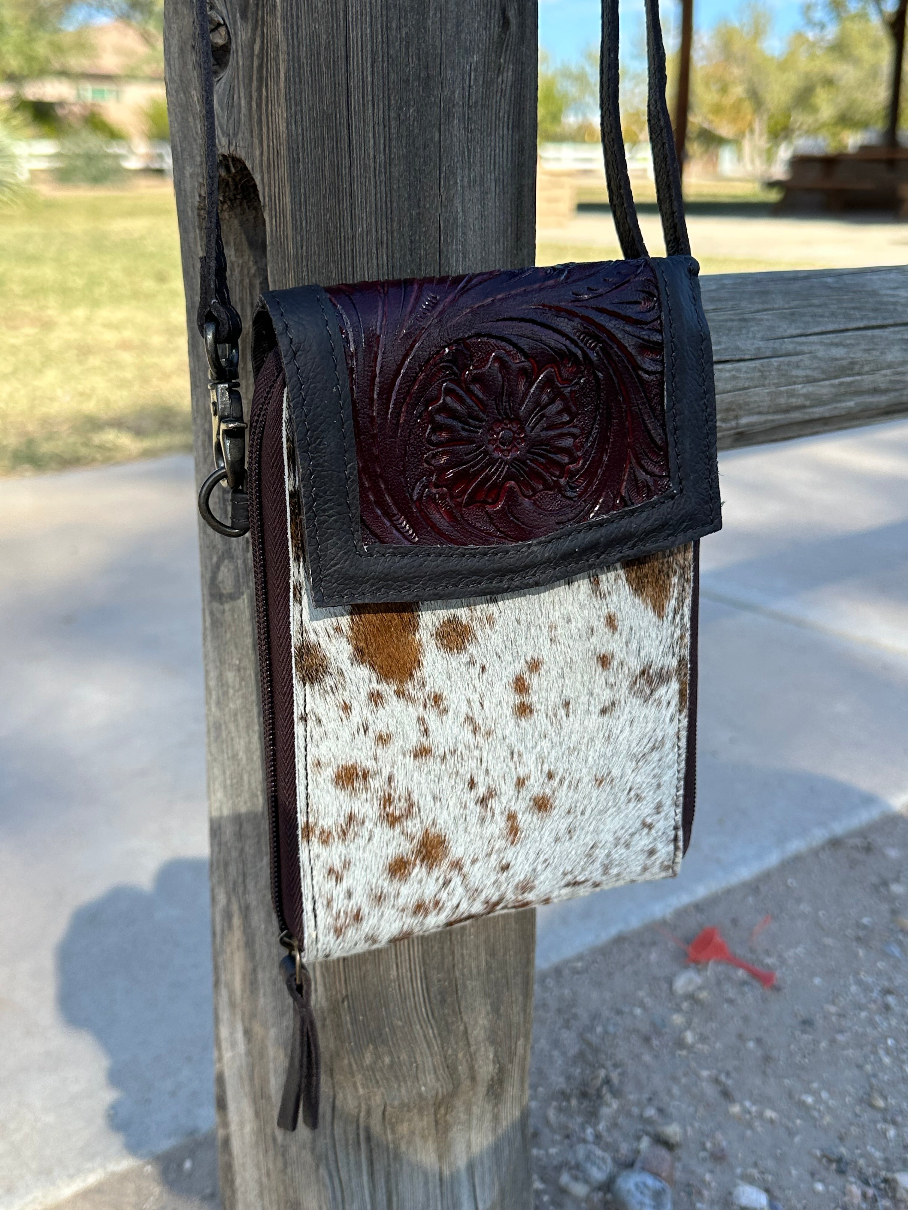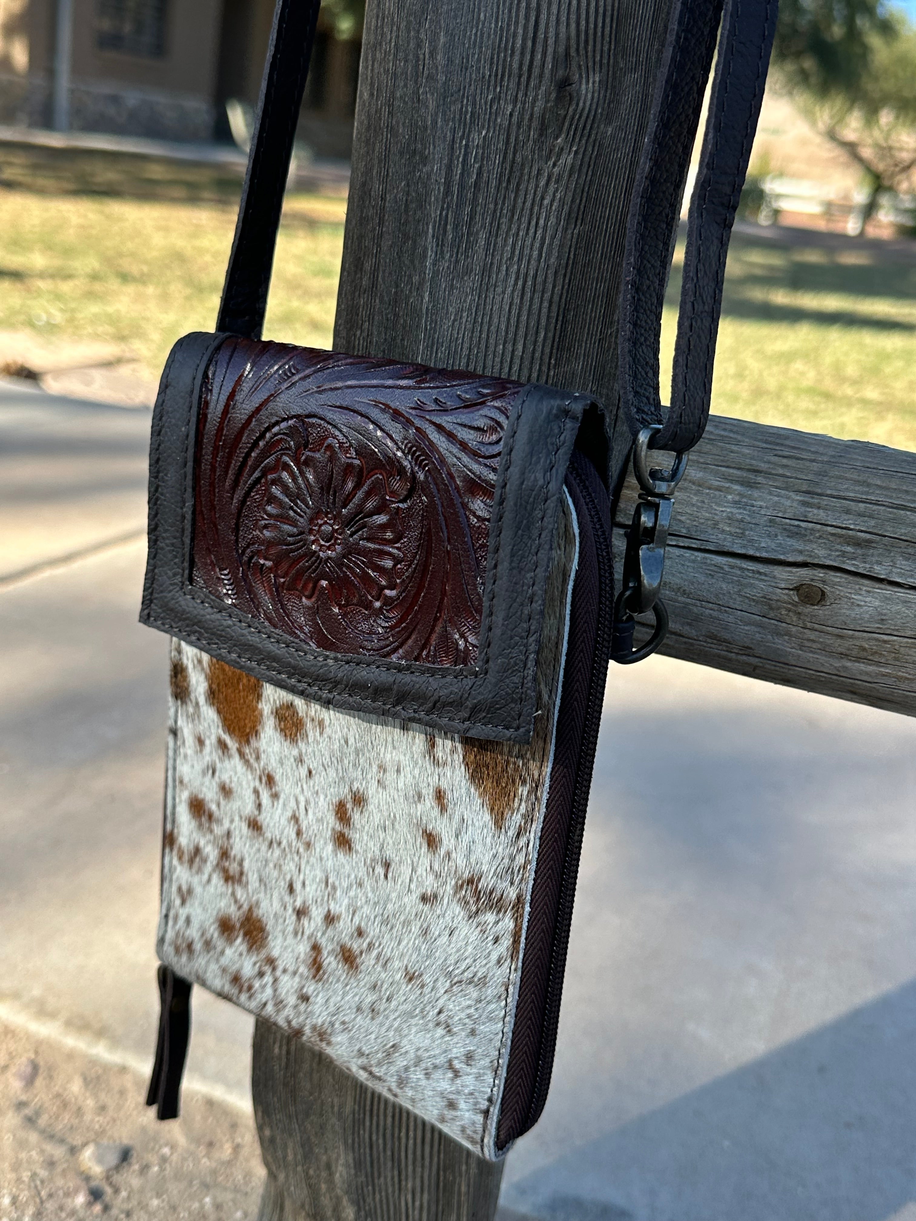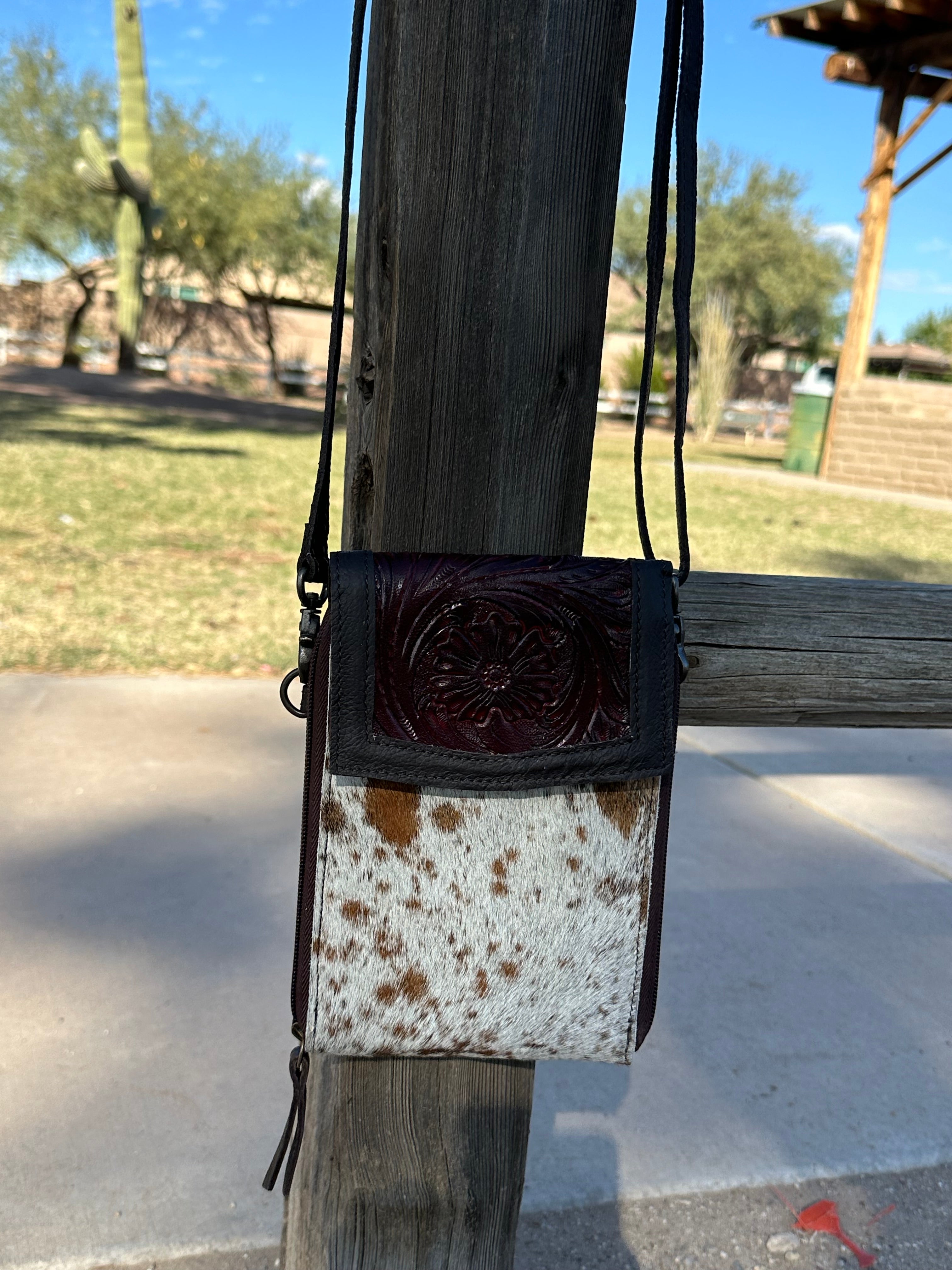 It measures 5 3/4 inches long and 8 inches in depth. Strap measures 44 inches long and can be adjusted smaller or bigger.