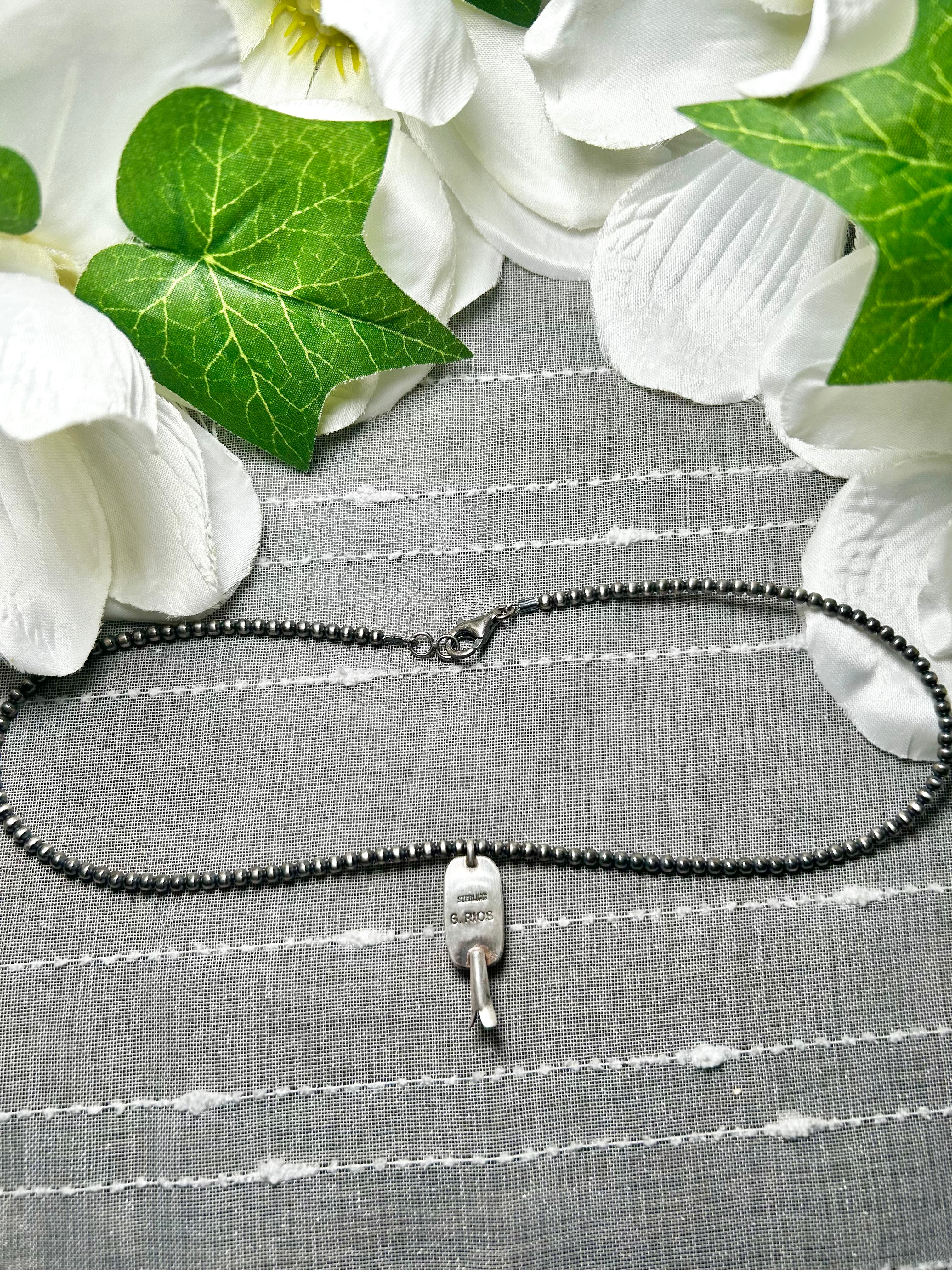 George Rios Spiny Oyster & Sterling Silver Necklace. It measures 17 inches long with hang while the chain measures 15 inches long. Signed by the artist and stamped sterling silver.