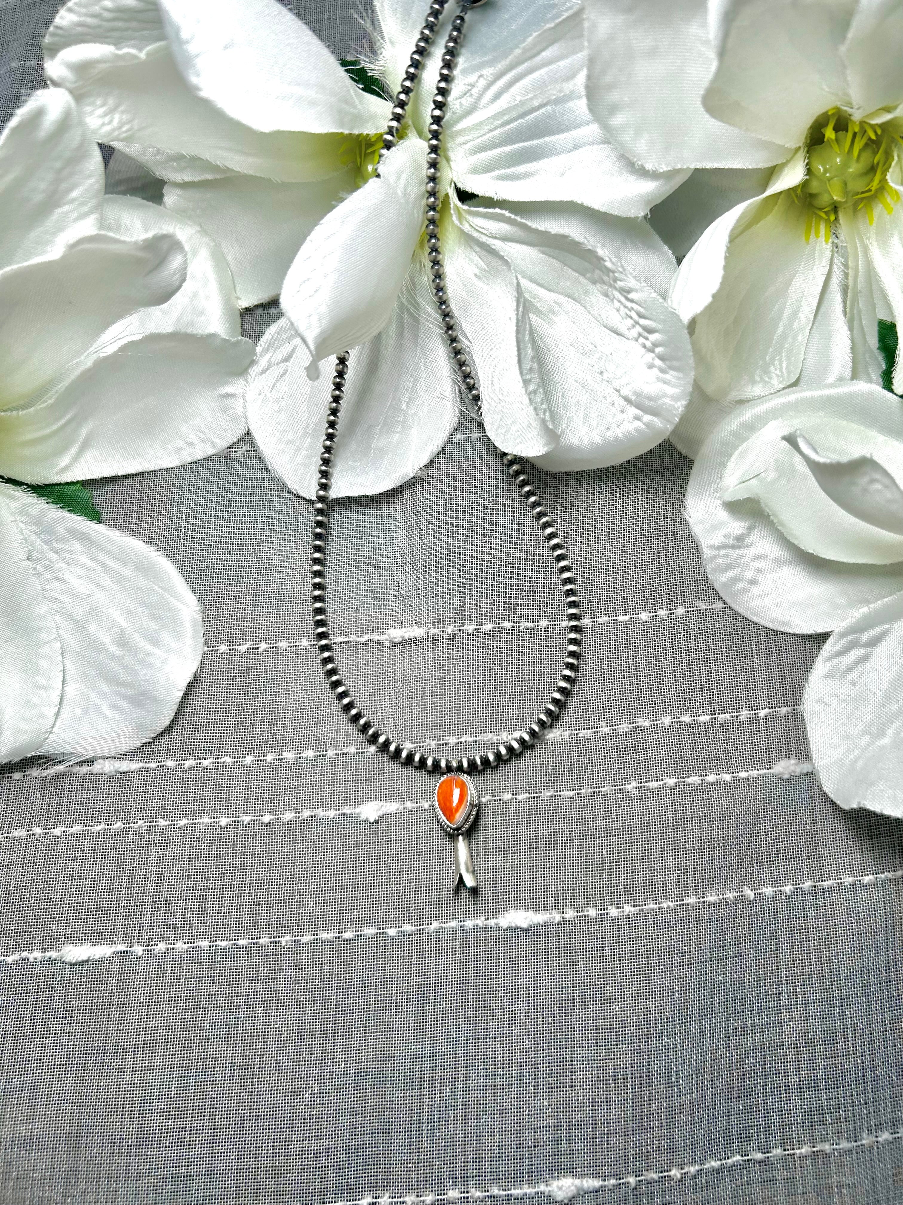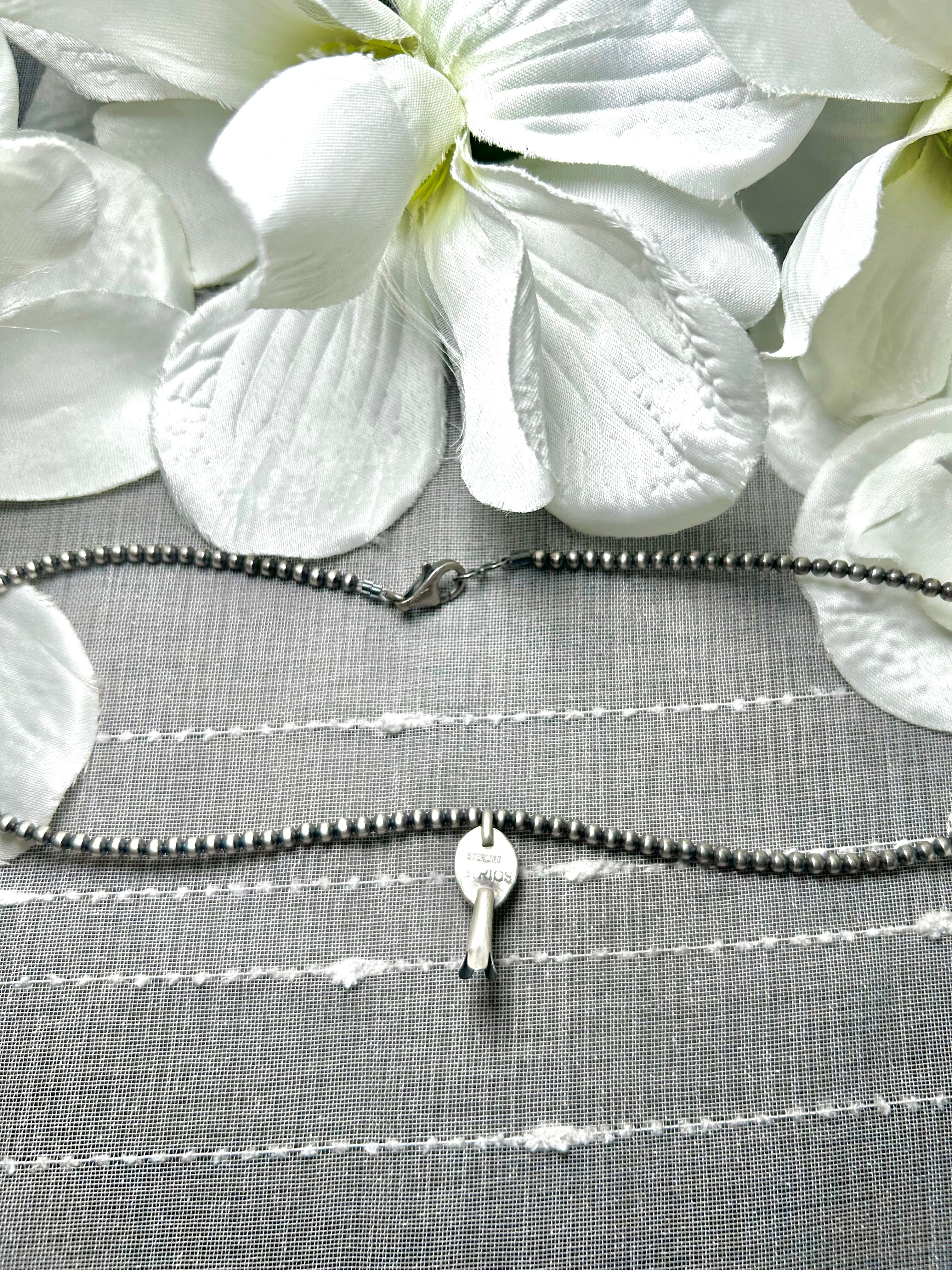 George Rios Spiny Oyster & Sterling Silver Necklace. It measures 17 inches long with hang while the chain measures 15 inches long. Signed by the artist and stamped sterling silver.