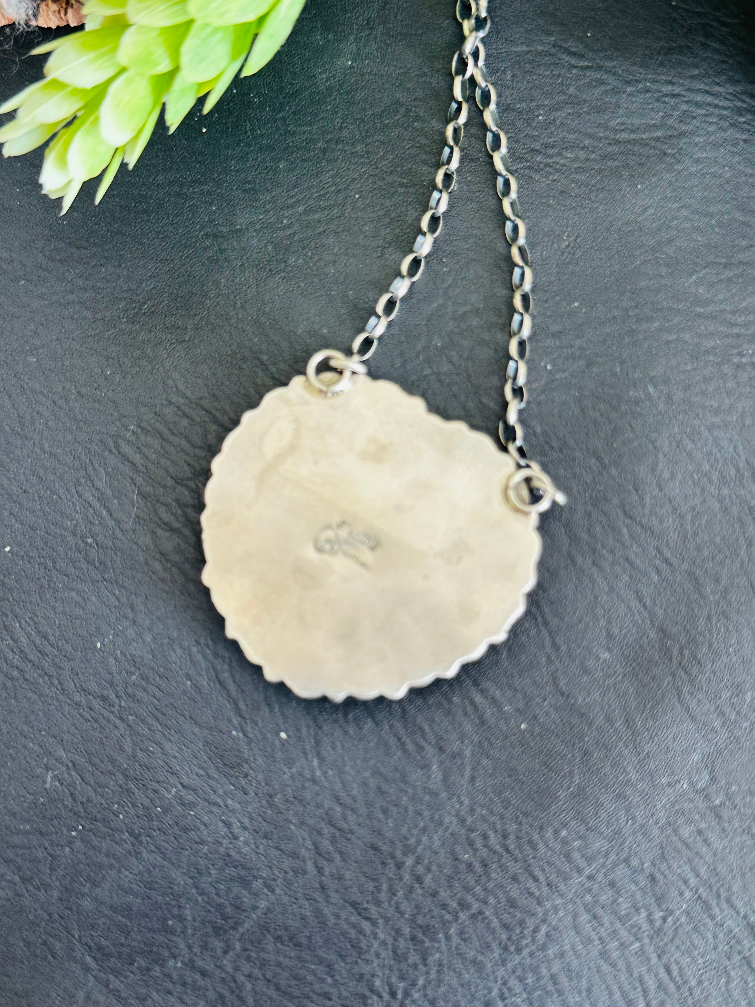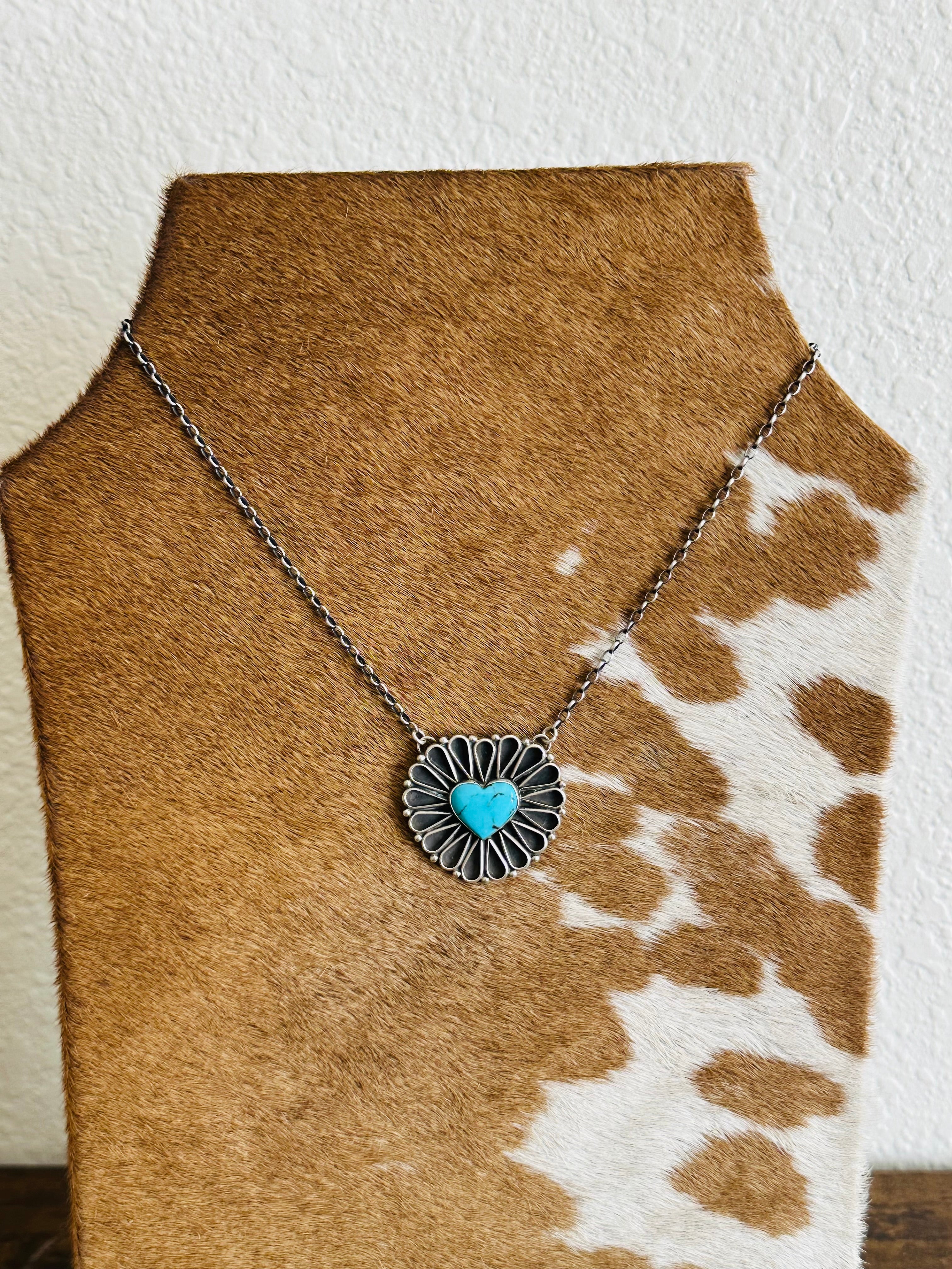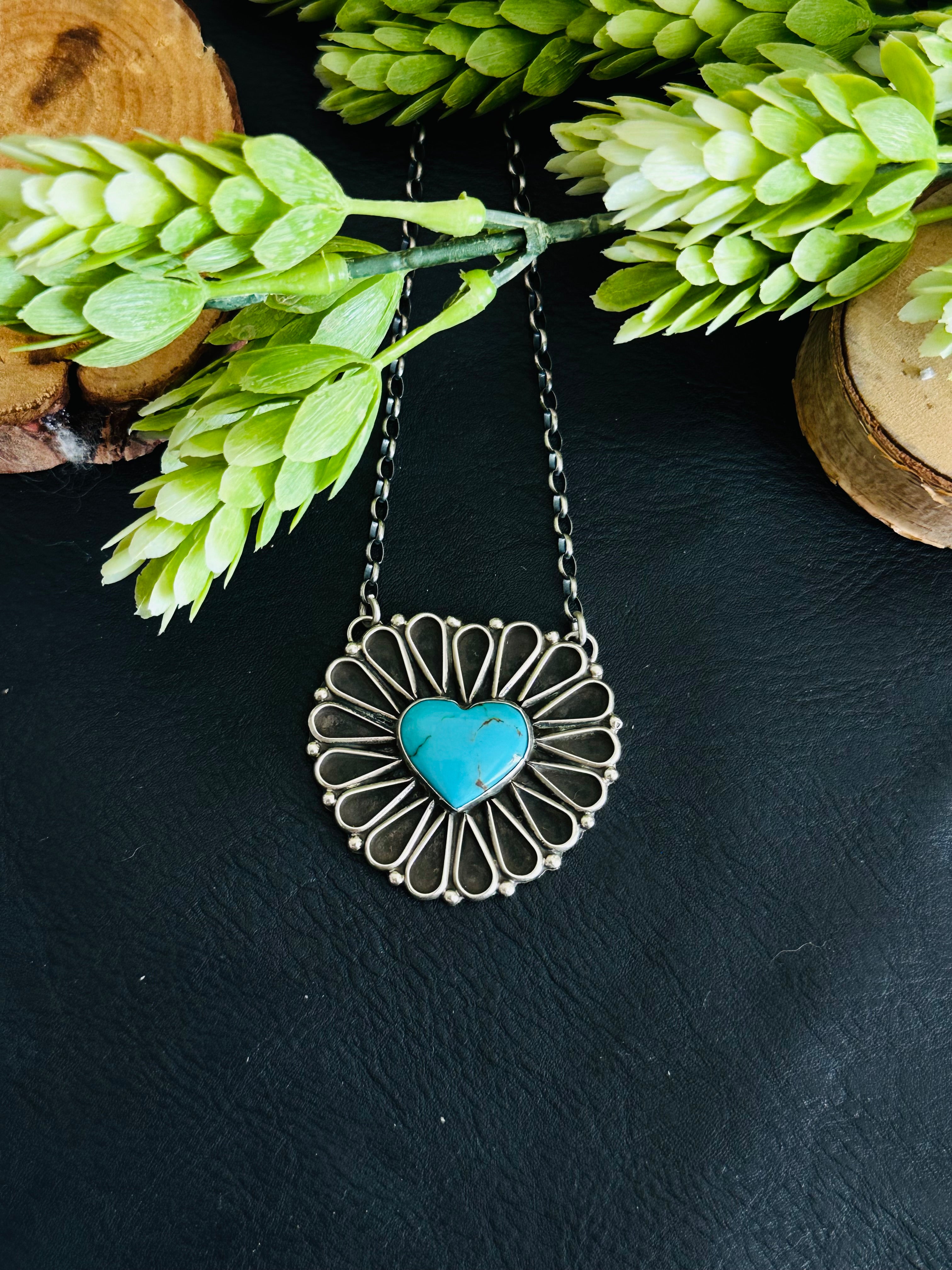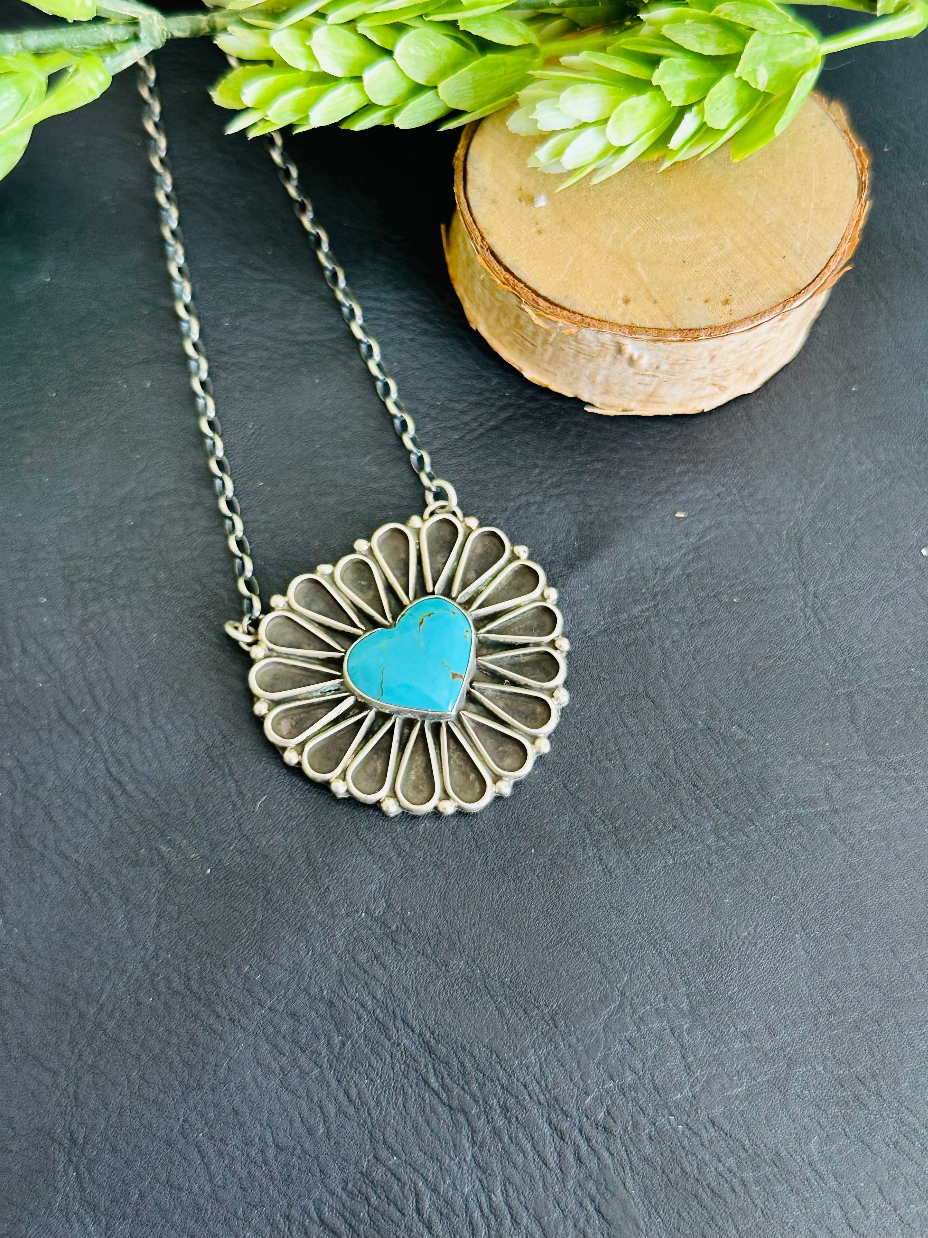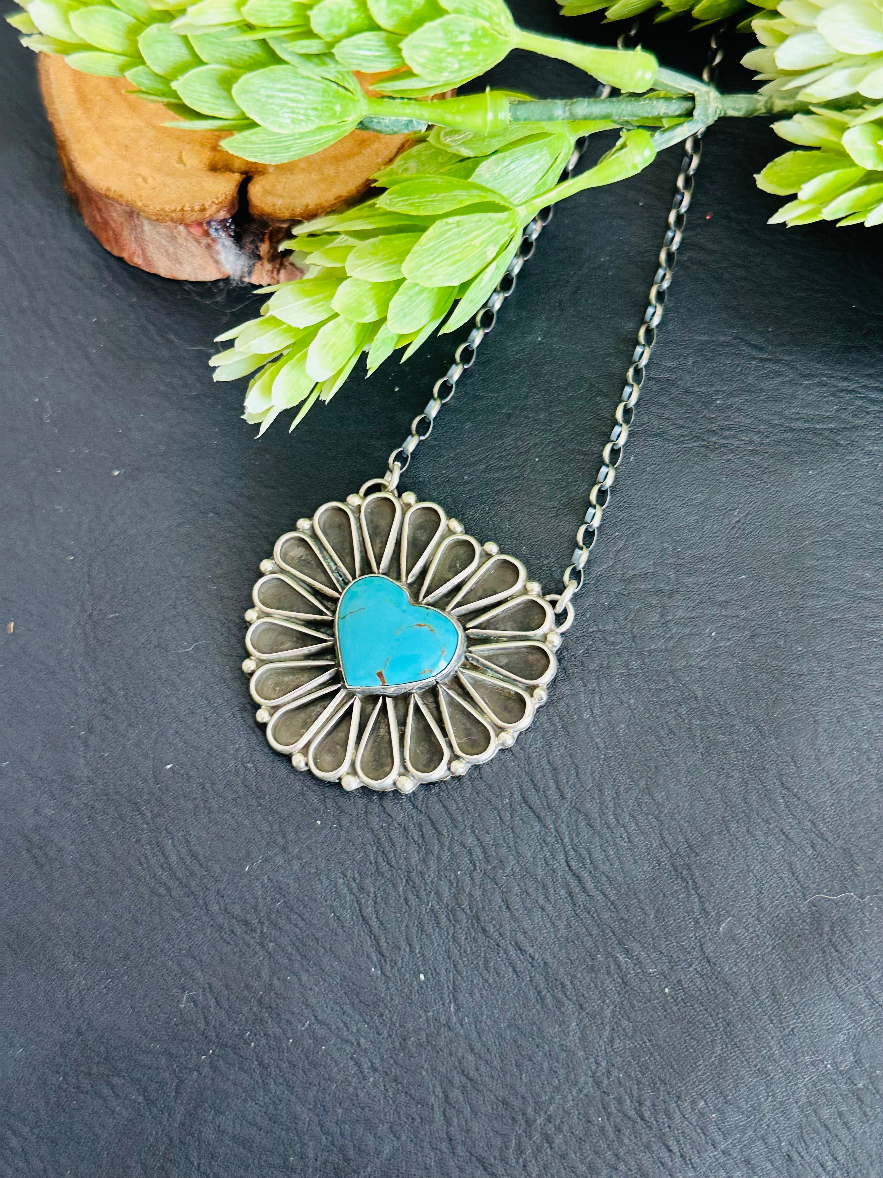 Geraldine James Kingman Turquoise & Sterling Silver Heart Necklace. It measures 19 1/2 inches long with hang while the chain by itself measures 16 1/2 inches long. Signed by the artist and stamped sterling silver.