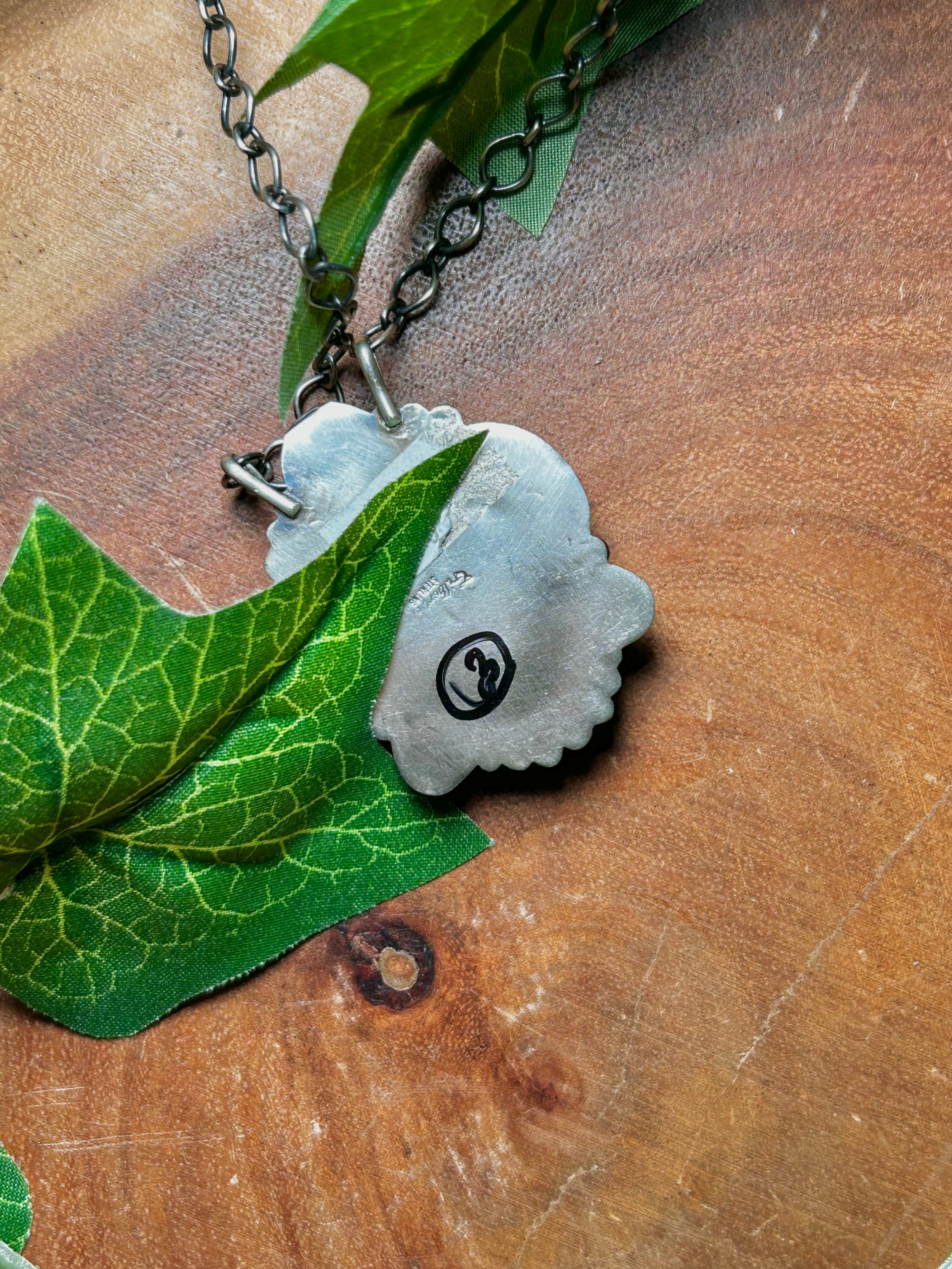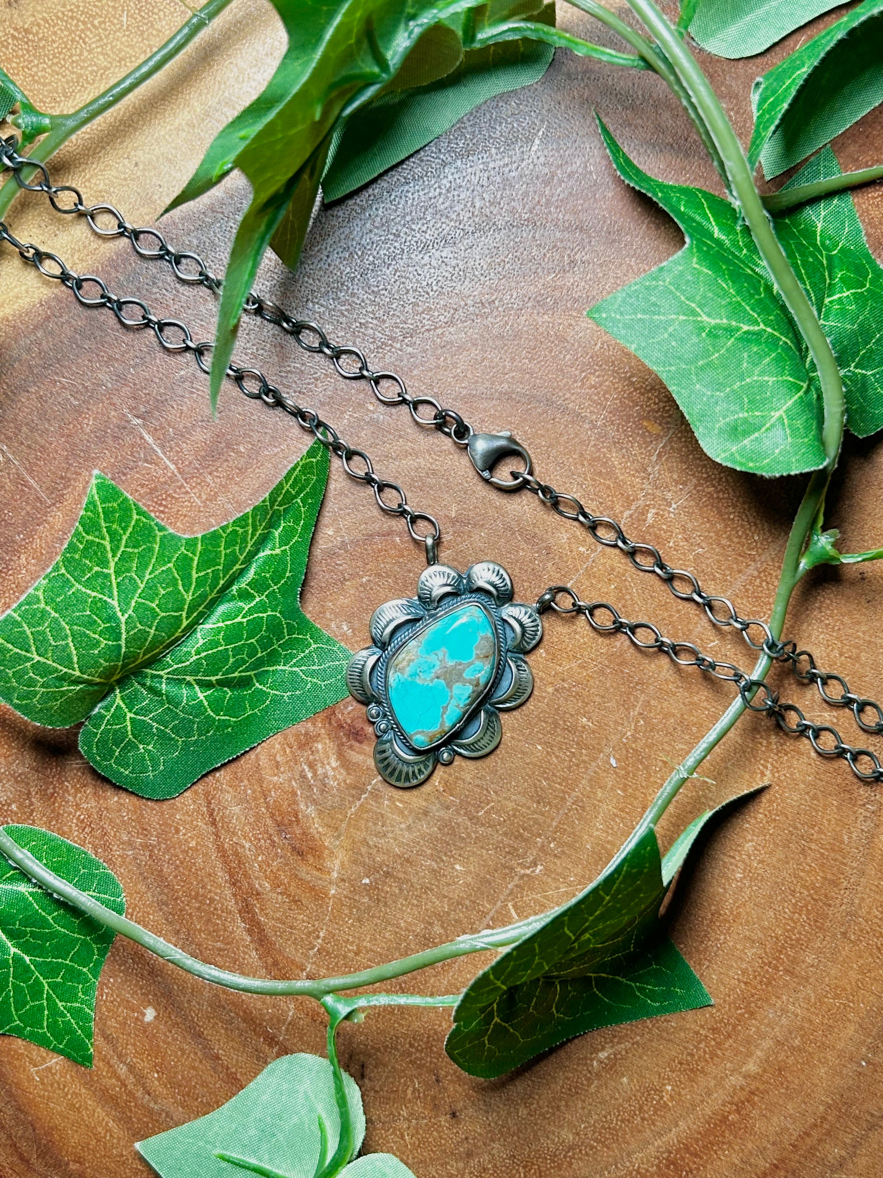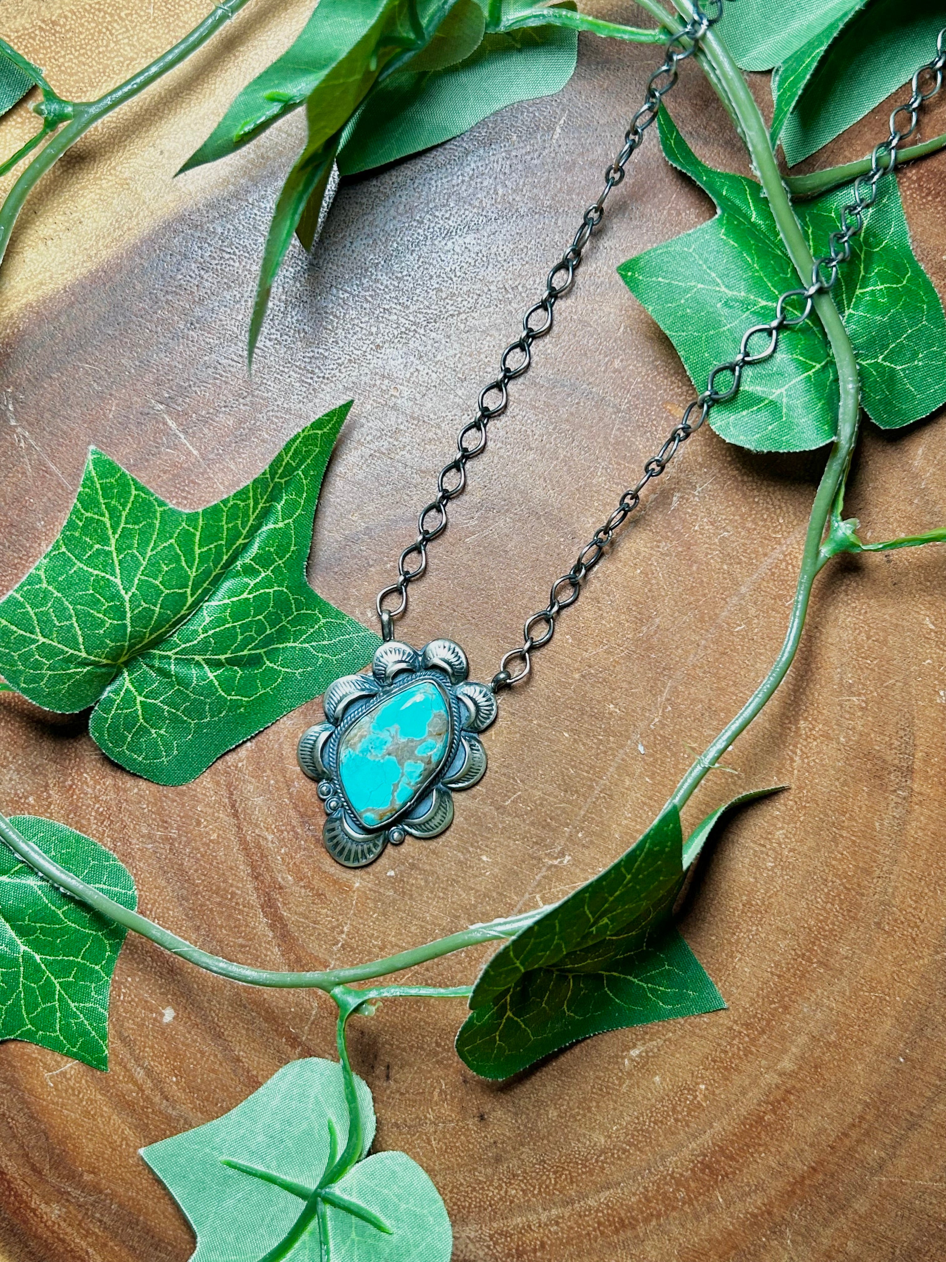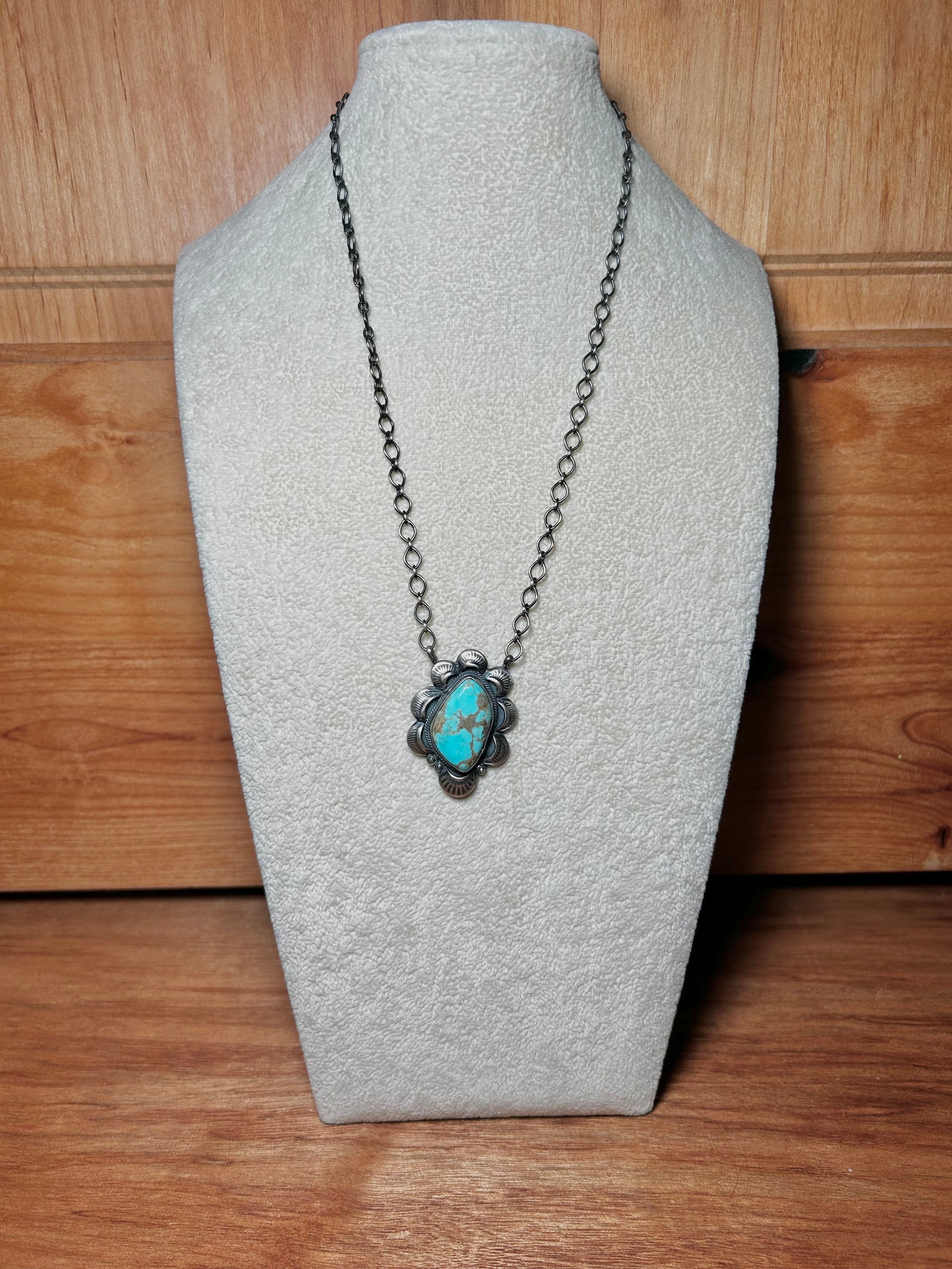 Gilbert Tom #8 Turquoise & Sterling Silver Necklace. It measures 22 inches long with hang while the chain by itself measures 19 inches long. Signed by the artist and stamped sterling silver.