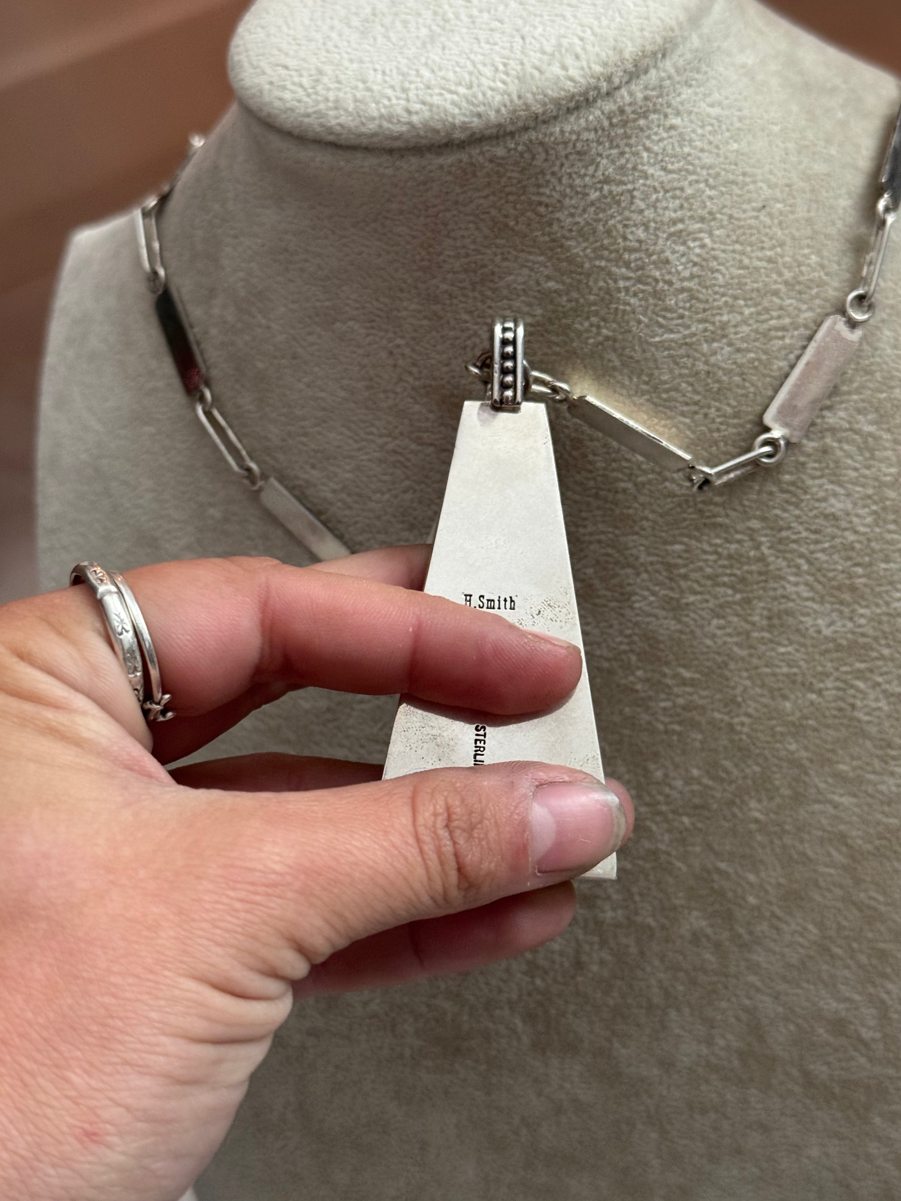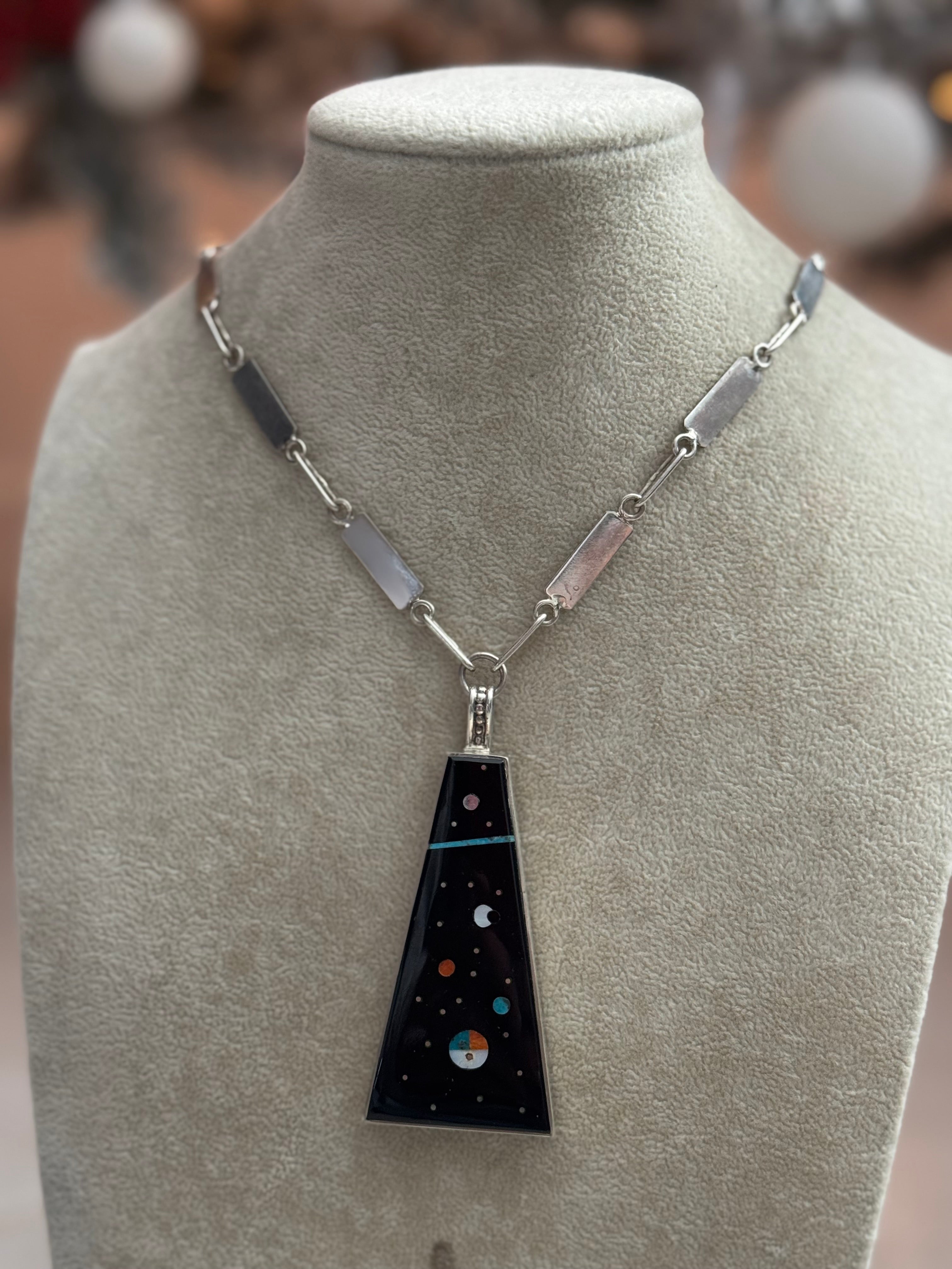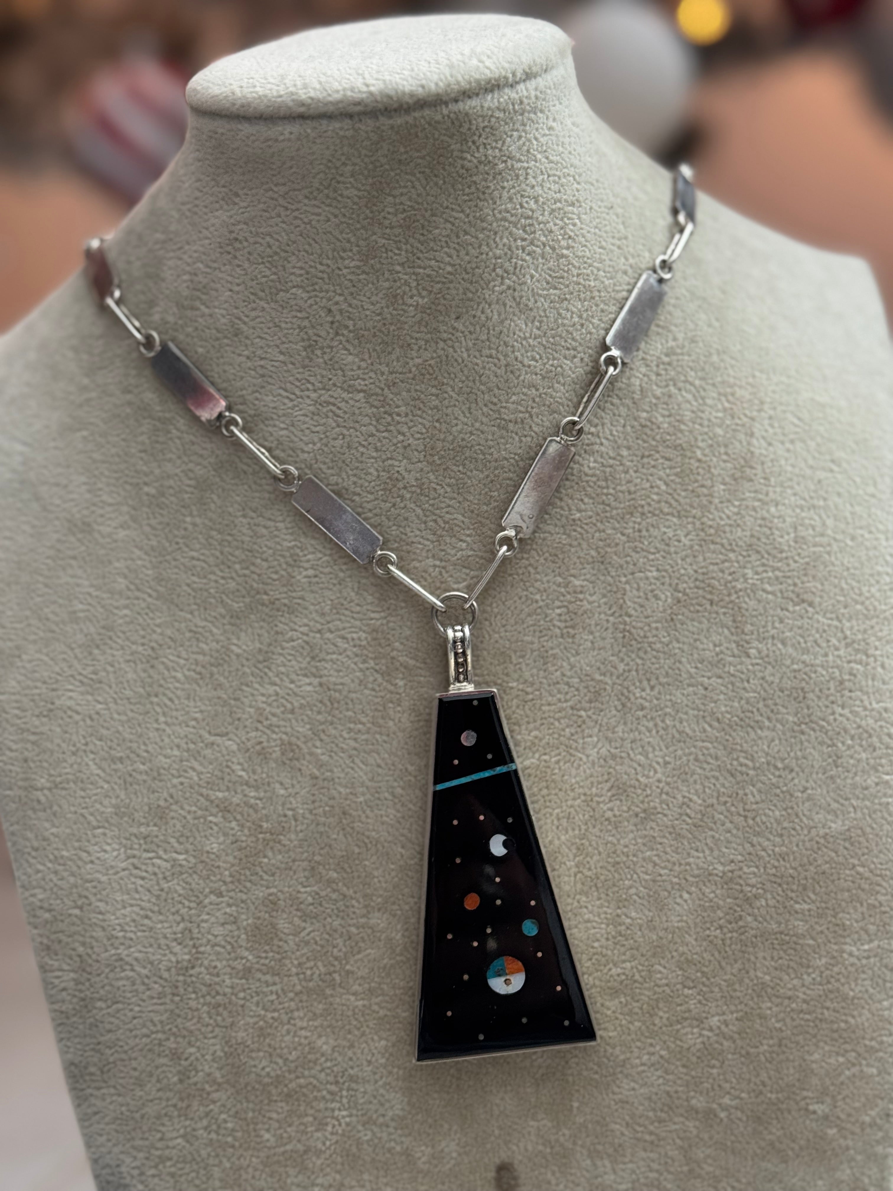 Harold Smith Multi Stone Galaxy & Sterling Silver Necklace. It measures 26 inches long with hang while the chain measures 20 inches long. Signed by the artist and stamped sterling silver.
