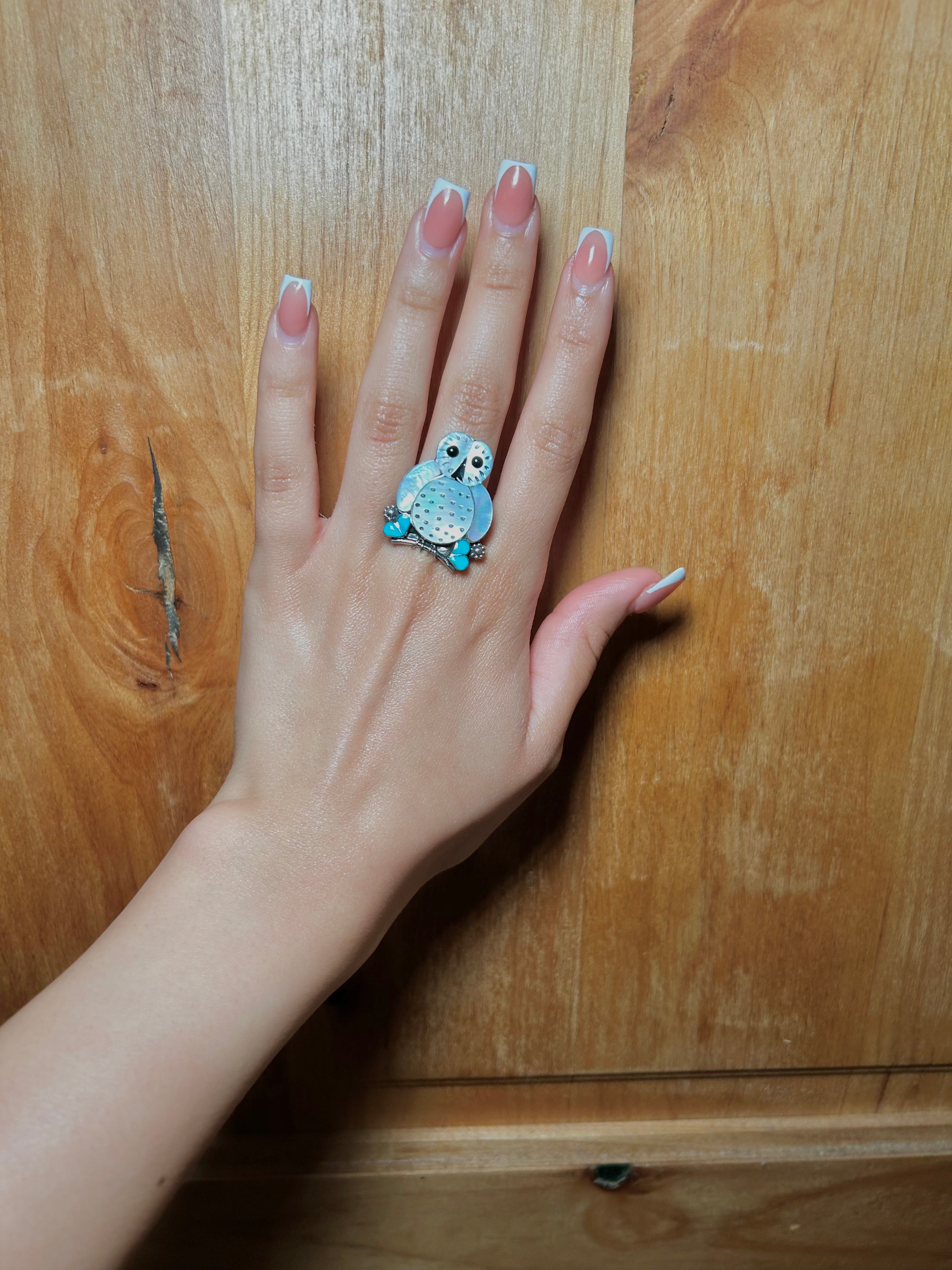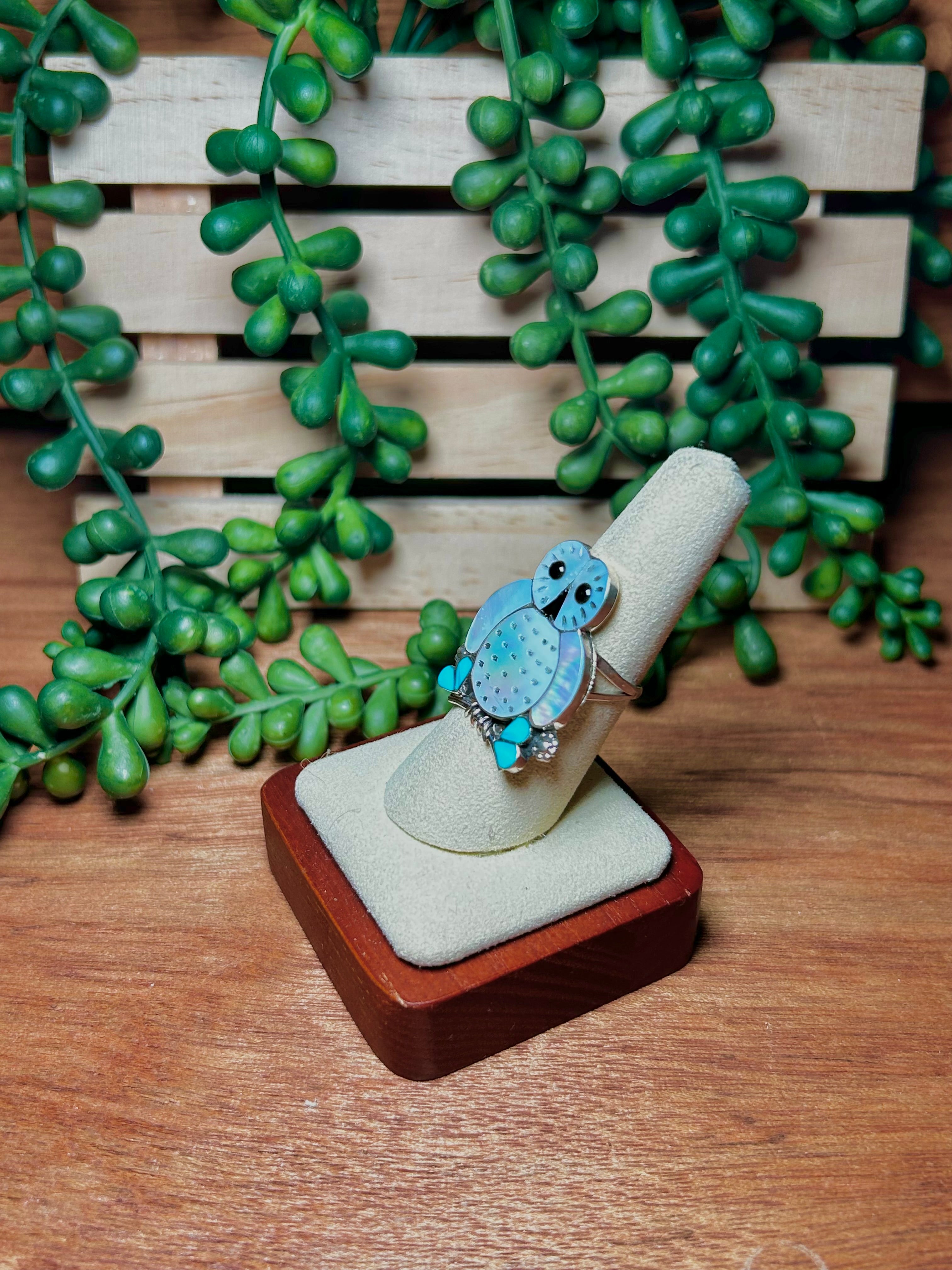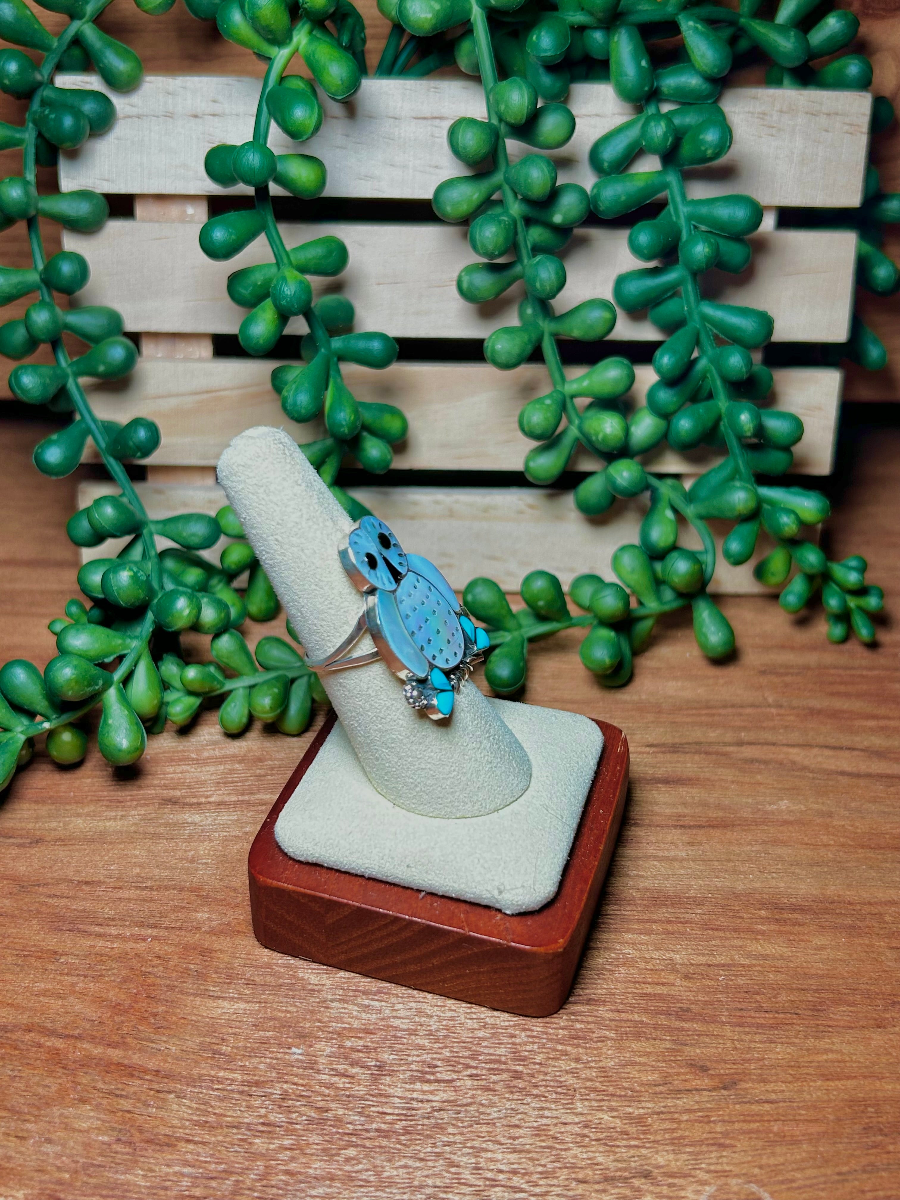 Zuni Multi Stone & Sterling Silver Ring. It measures 1 1/4 inches long and 1 inch wide. Signed by the artist and stamped sterling silver.