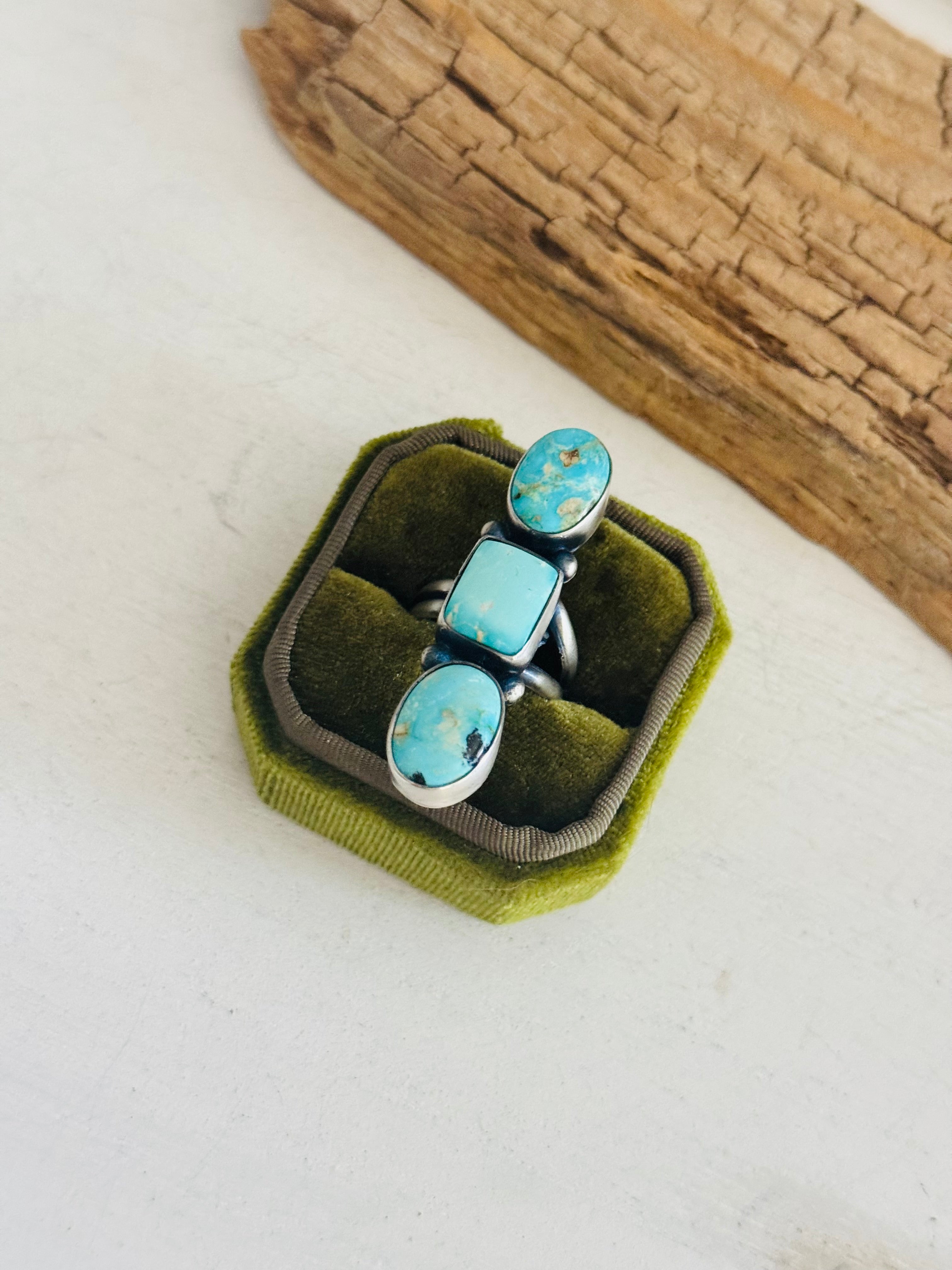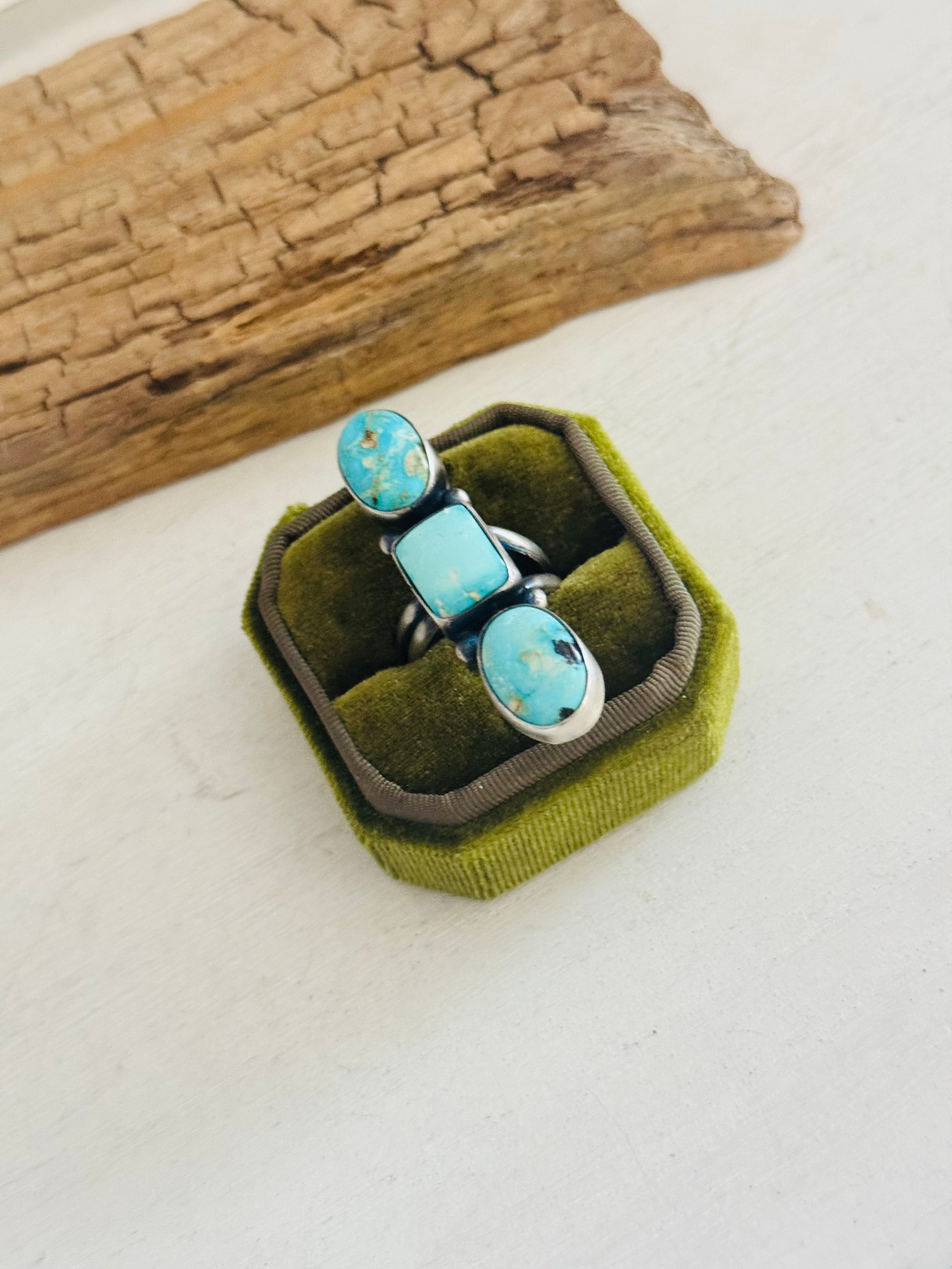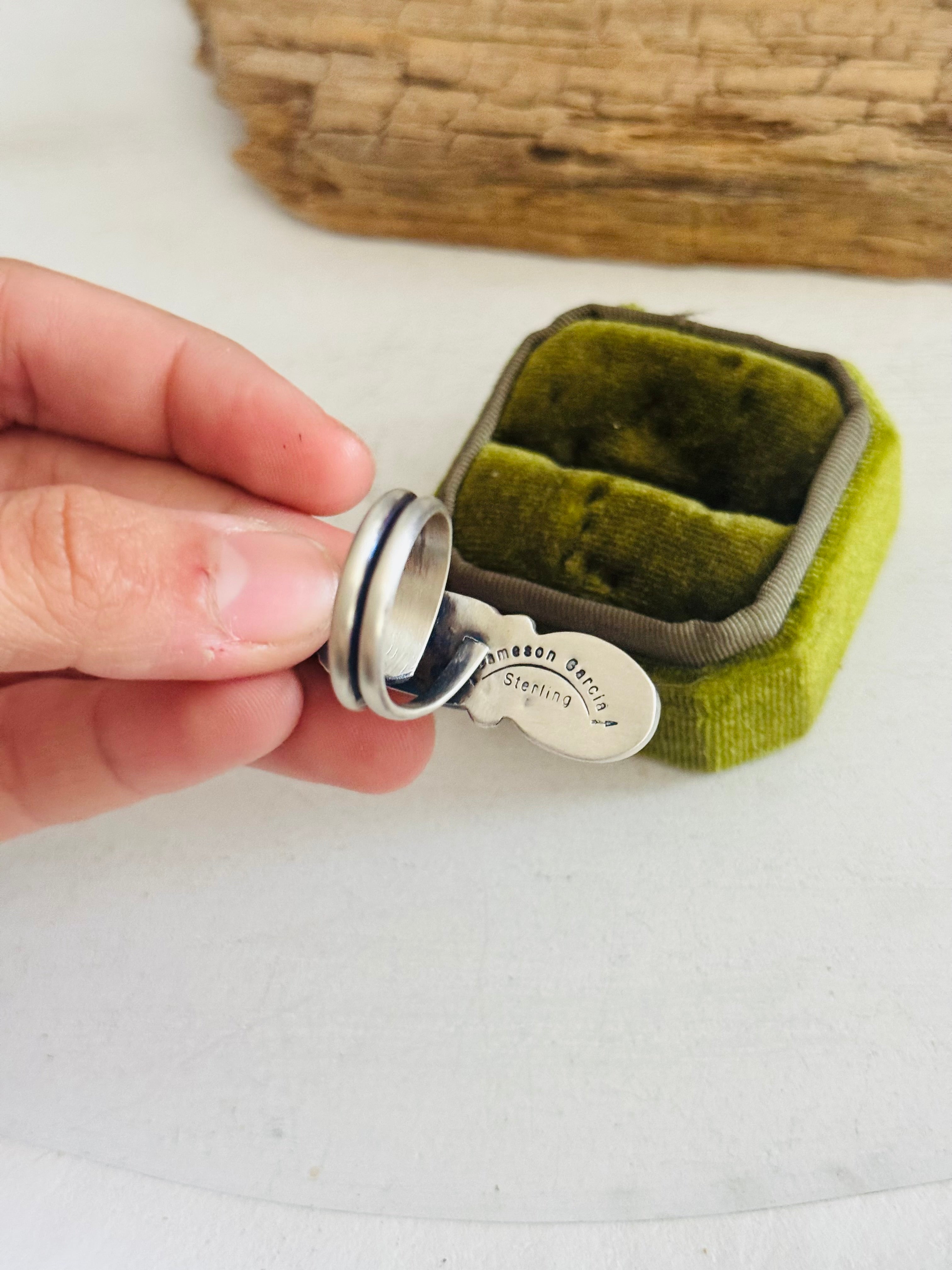 Jameson Garcia Royston Turquoise & Sterling Silver Adjustable Cluster Ring. It measures 1 7/8 inches long and 1/2 of an inch wide. Signed by the artist and stamped sterling silver.