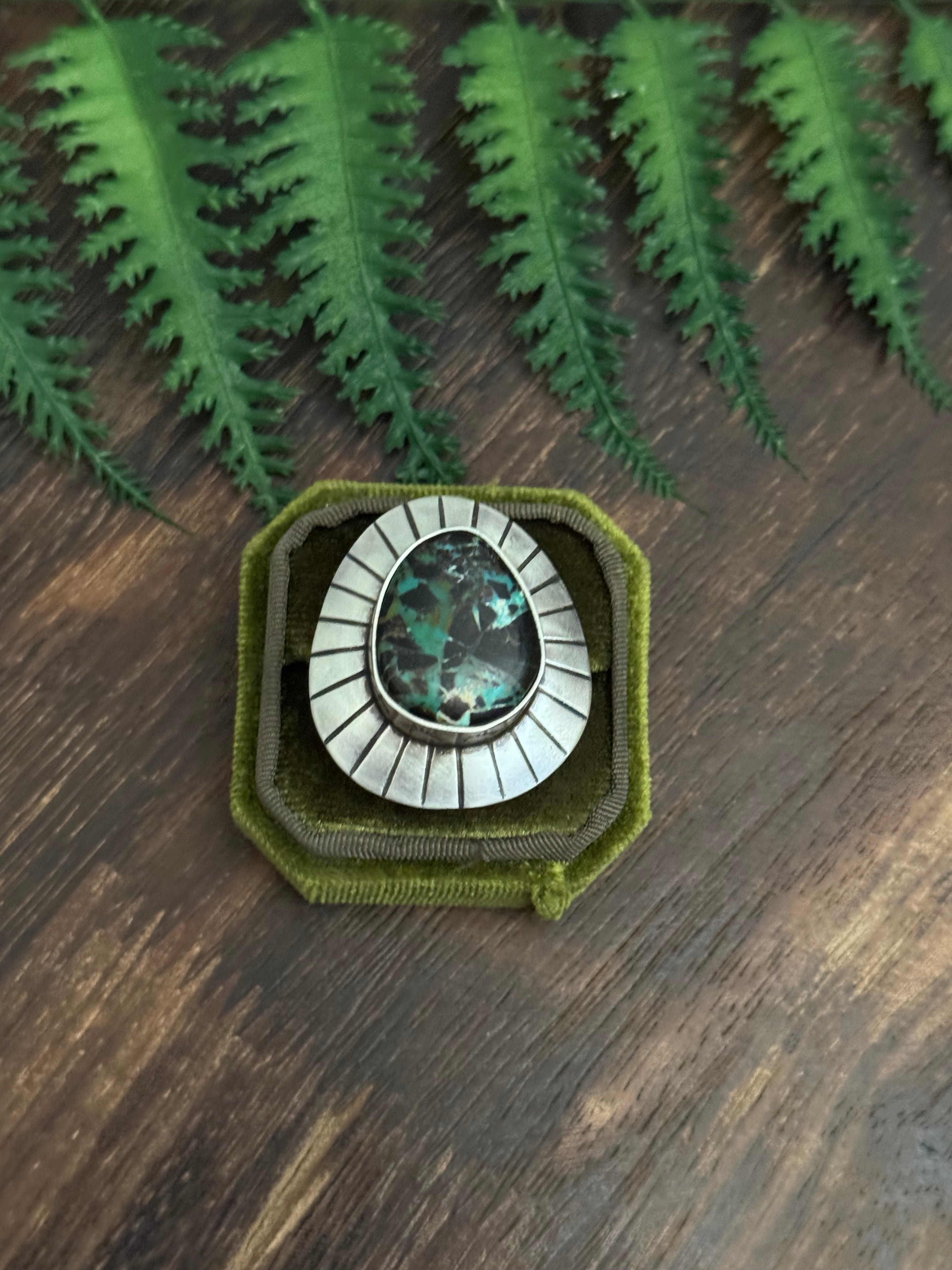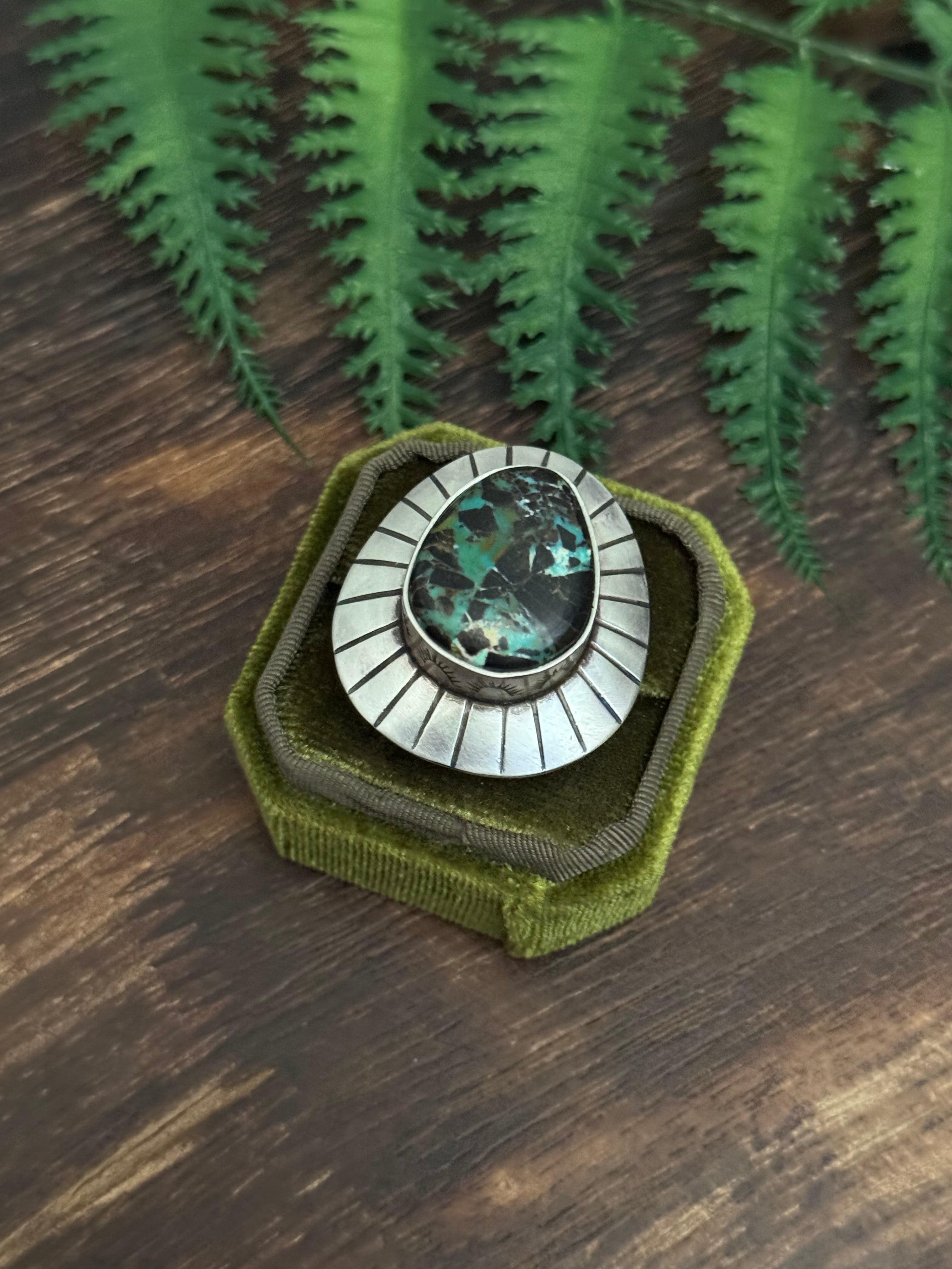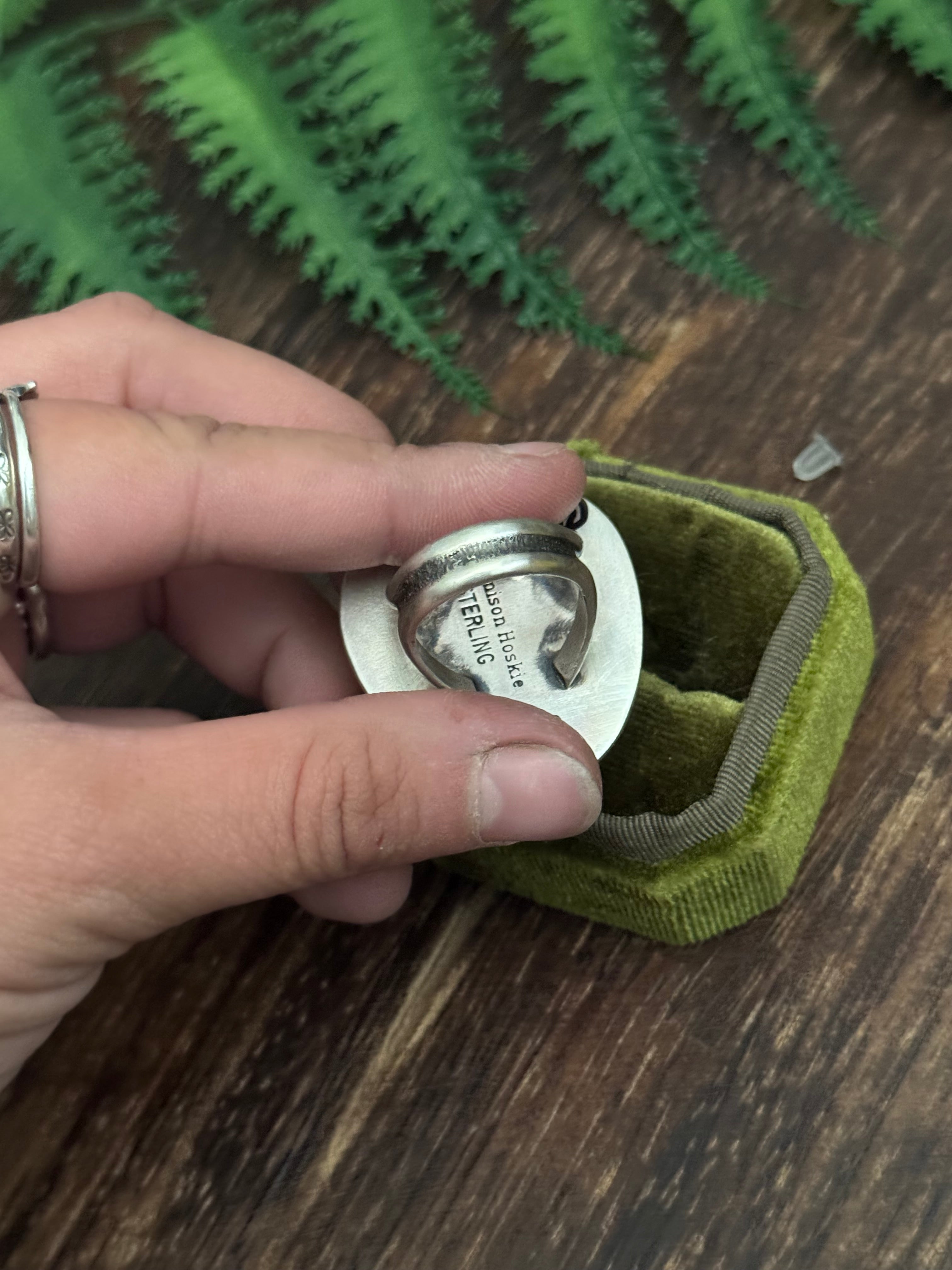 Jamison Hosky Black Jack Turquoise & Sterling Silver Ring Size 7.75. It measures 1 5/8 inches long and 1 1/2 inches wide. Signed by artist and stamped sterling silver.