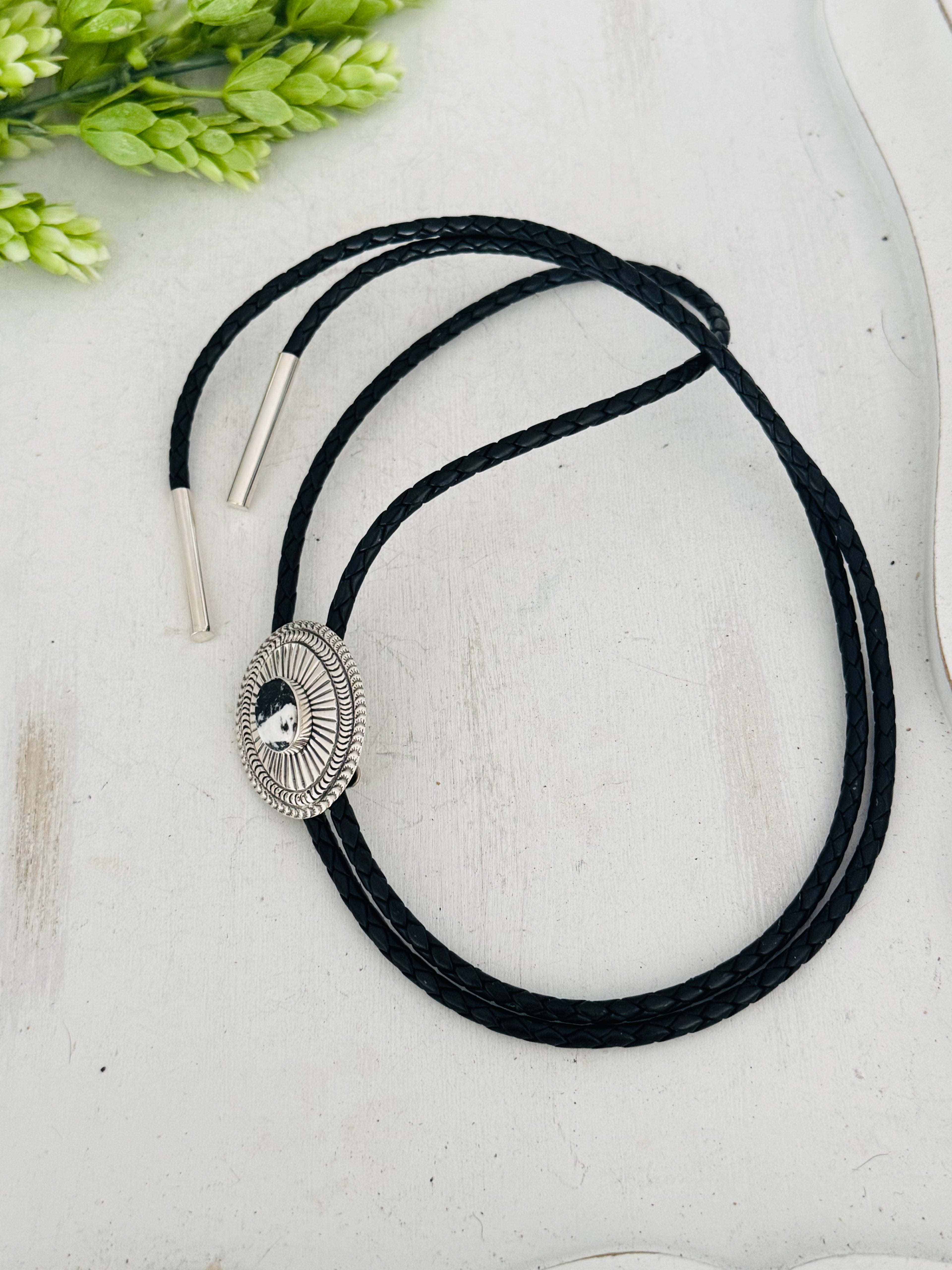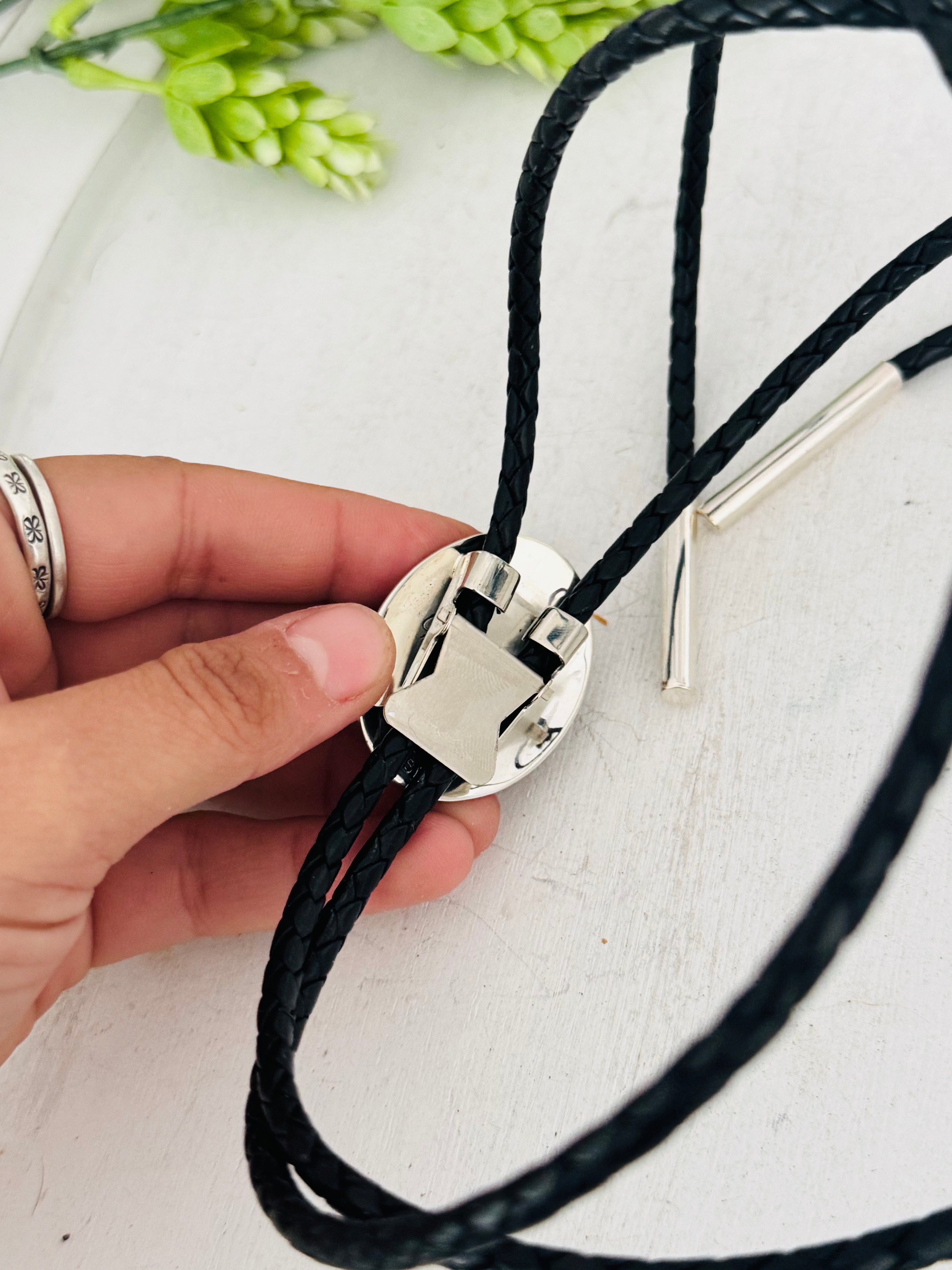 Jereme Delgarito White Buffalo & Sterling Silver Bolo Tie. It measures 43 inches long while the setting measures 1 3/8 inches long and 1 5/8 inches wide. Stamped sterling silver.