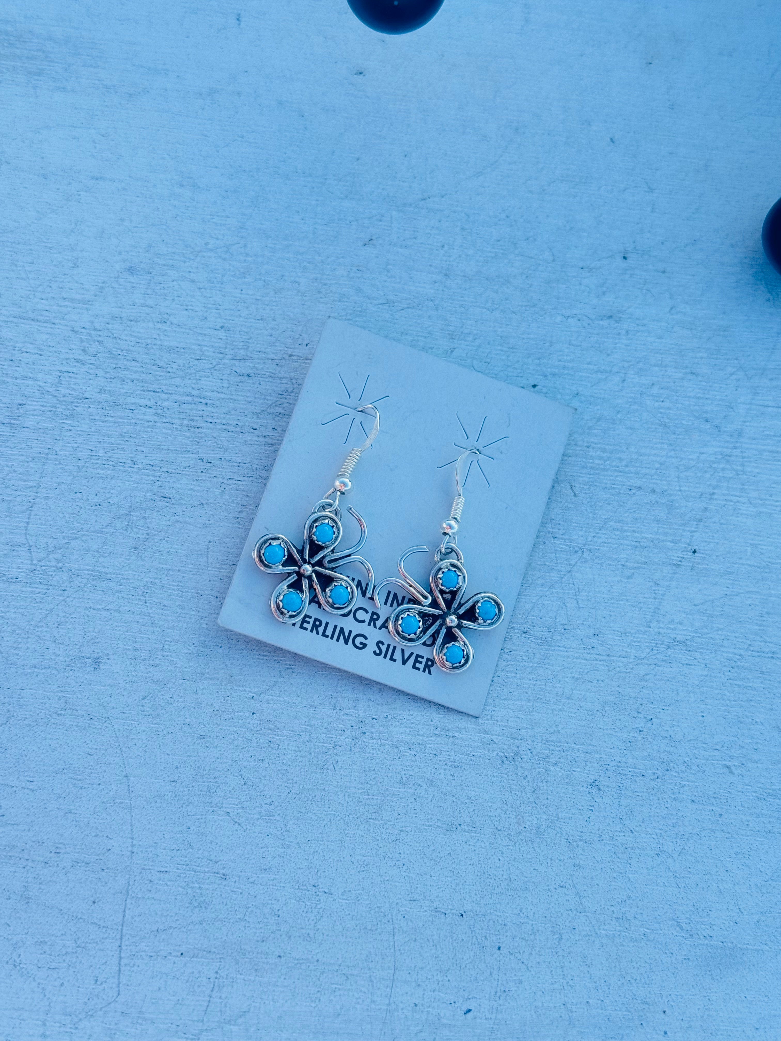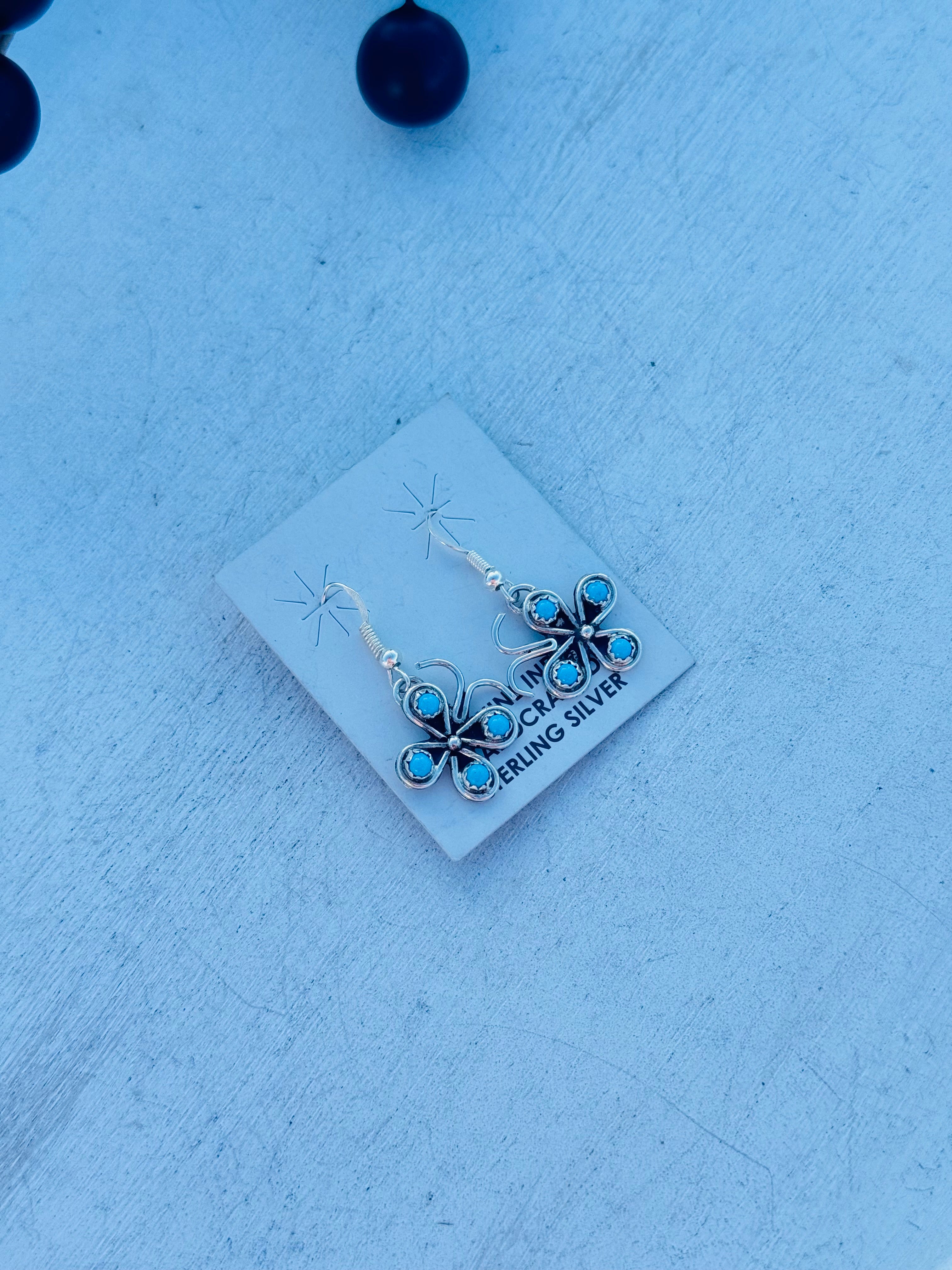 Felicia Charley Kingman Turquoise & Sterling Silver Dangle Butterfly Earrings. They measure 1 1/4 inches long and 3/4 of an inch wide. Signed by the artist and stamped sterling silver.