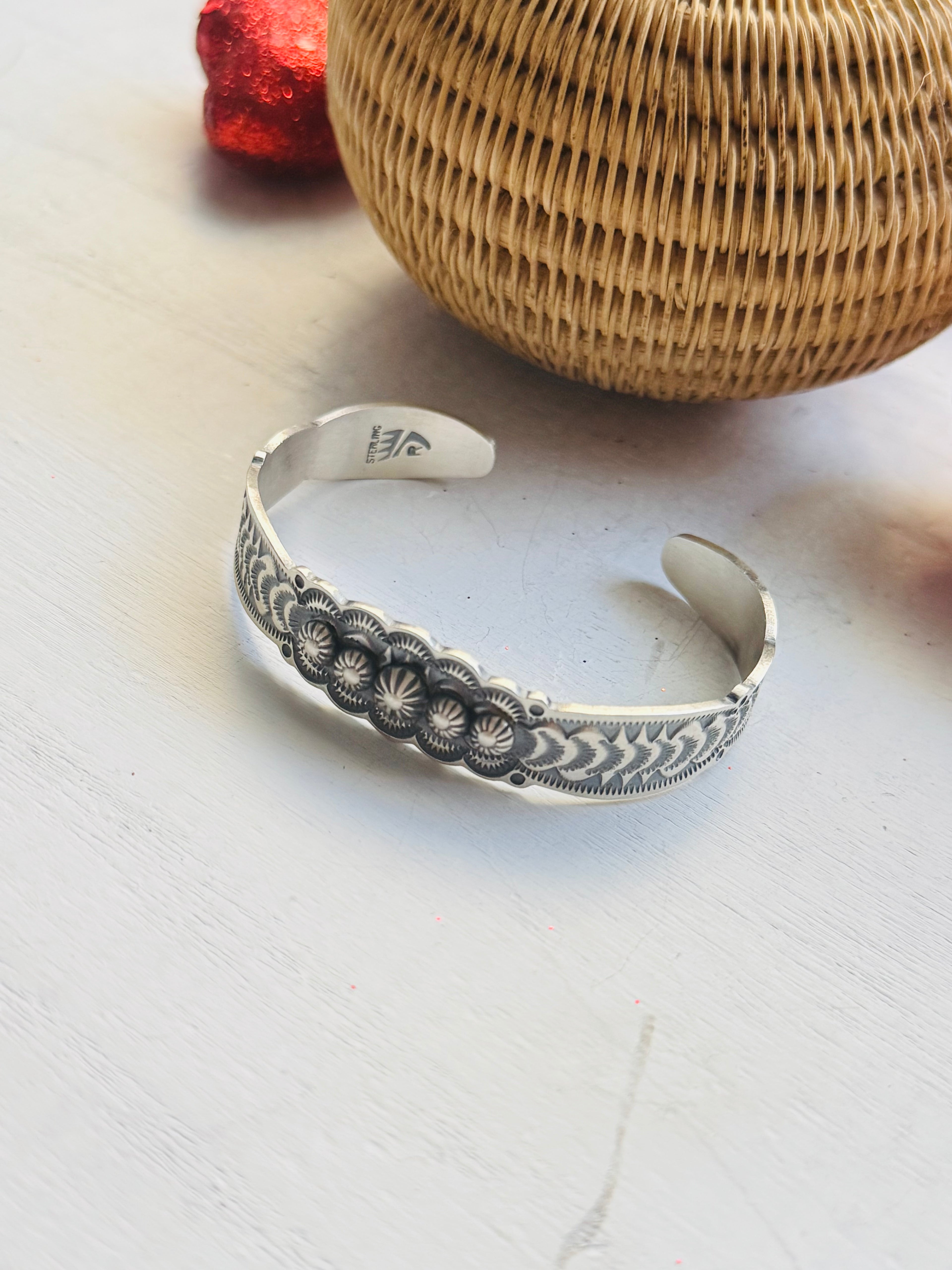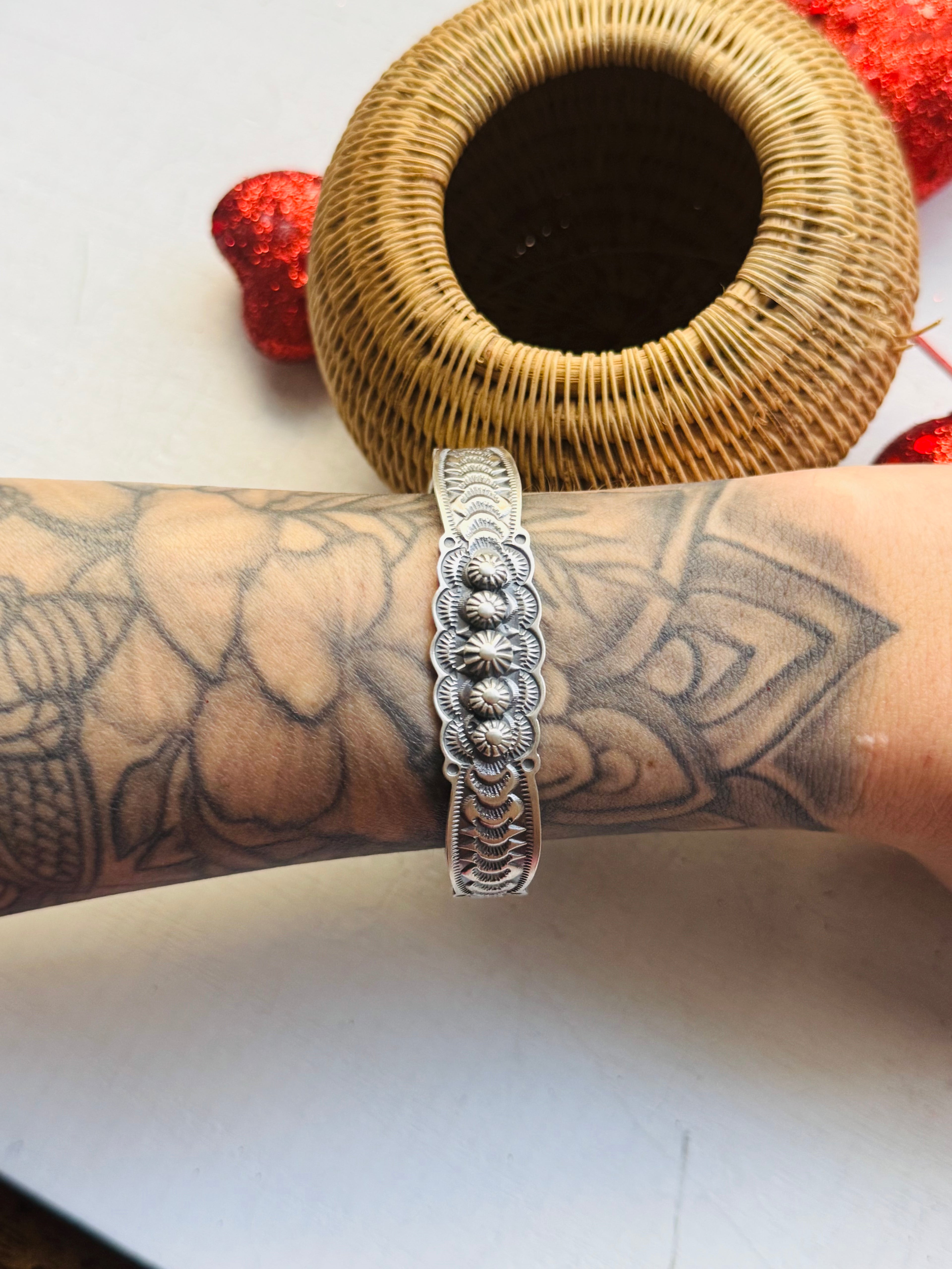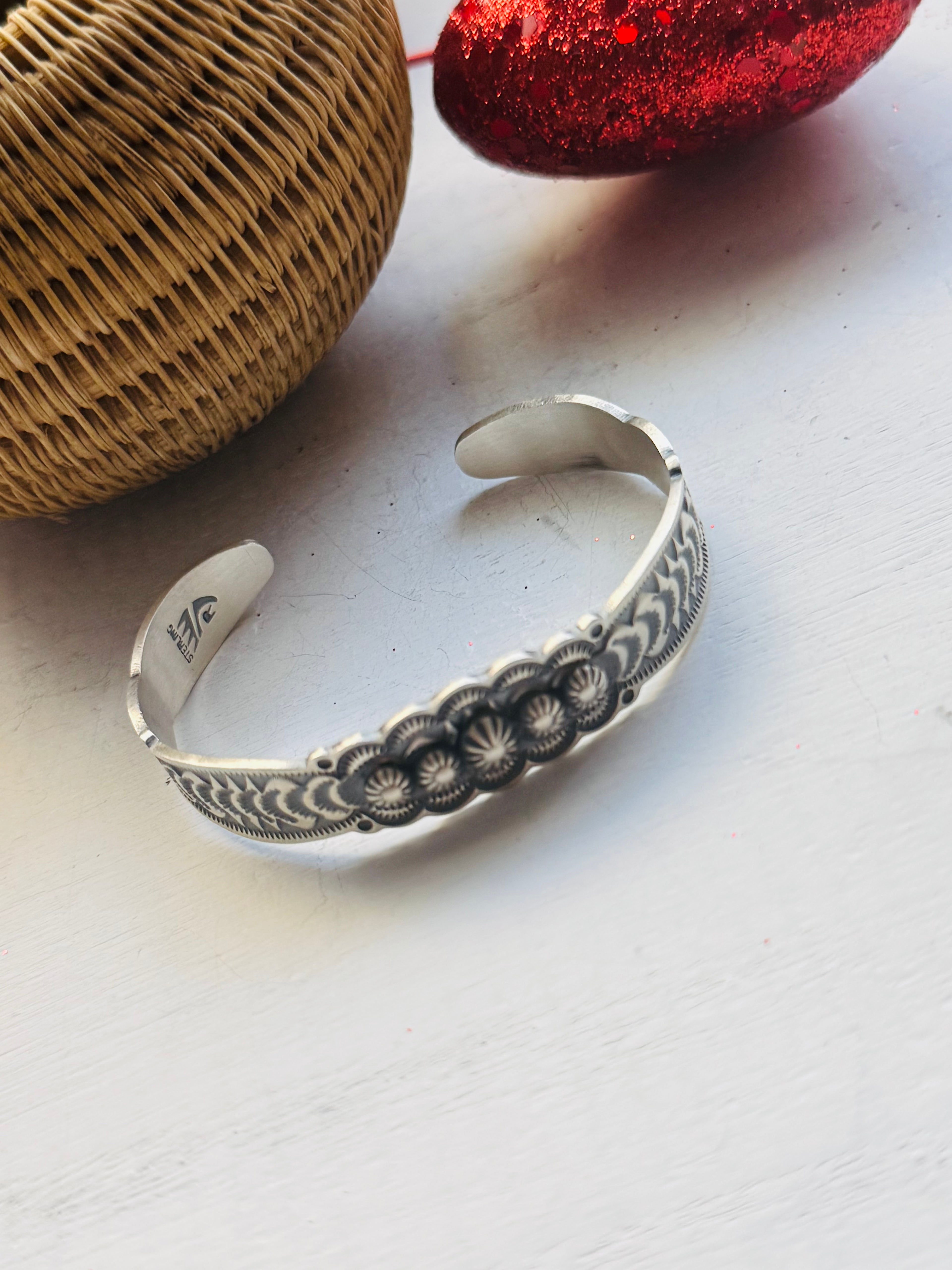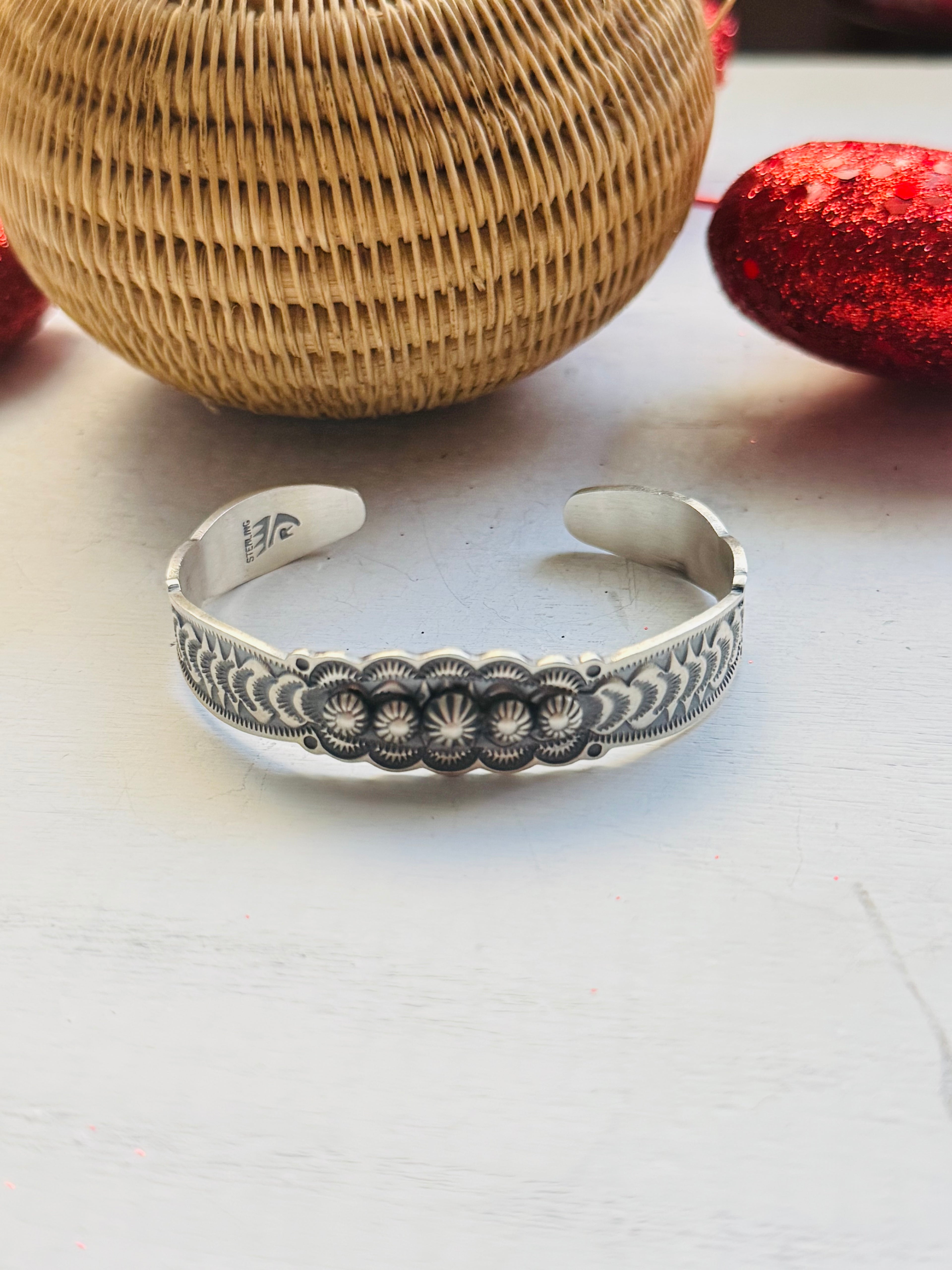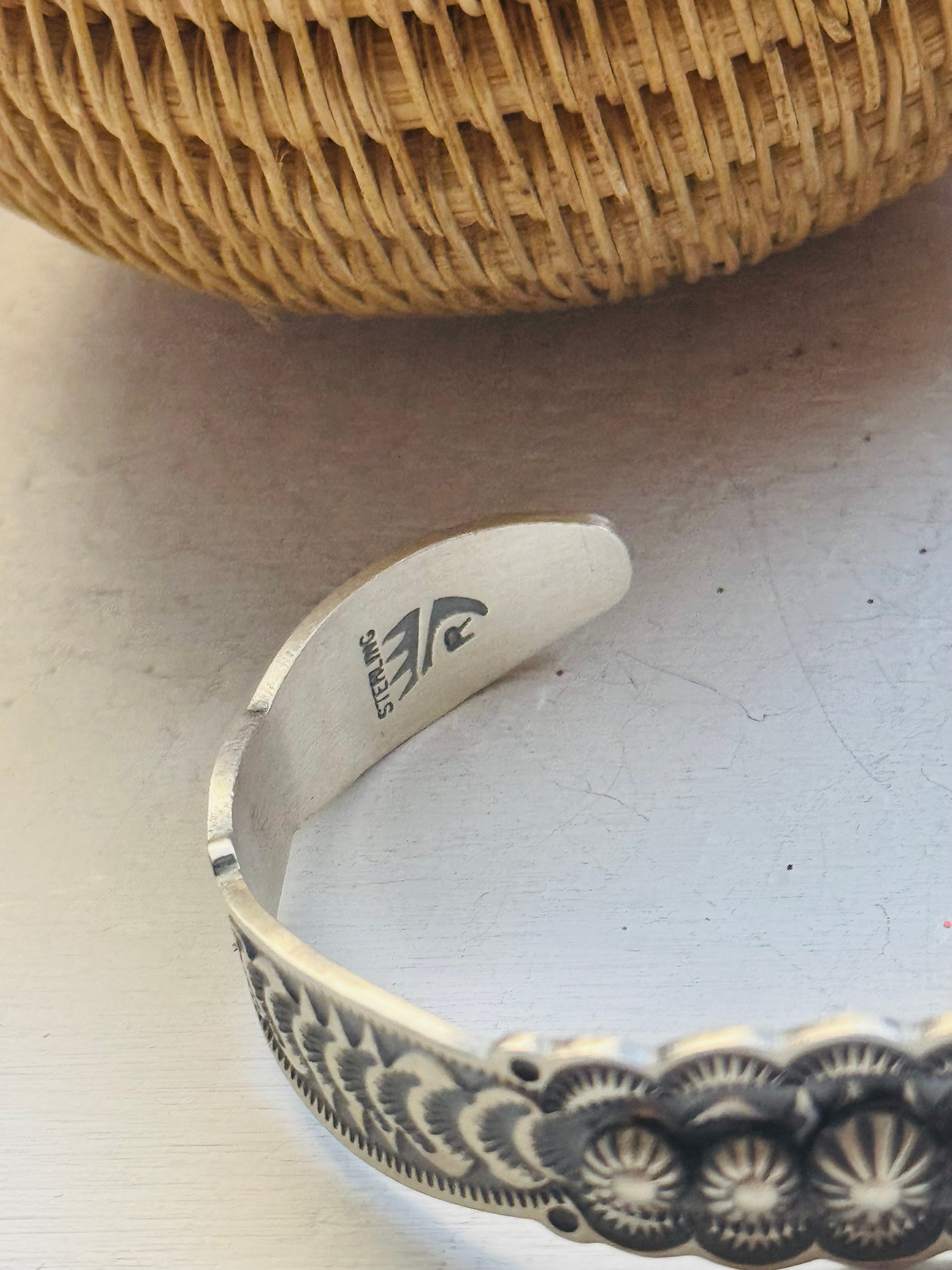 Benny Ramone Sterling Silver Cuff Bracelet. It measures 1/2 of an inch wide with an inside circumference of 5 1/2 inches and a gap of 1 inch. Signed and stamped