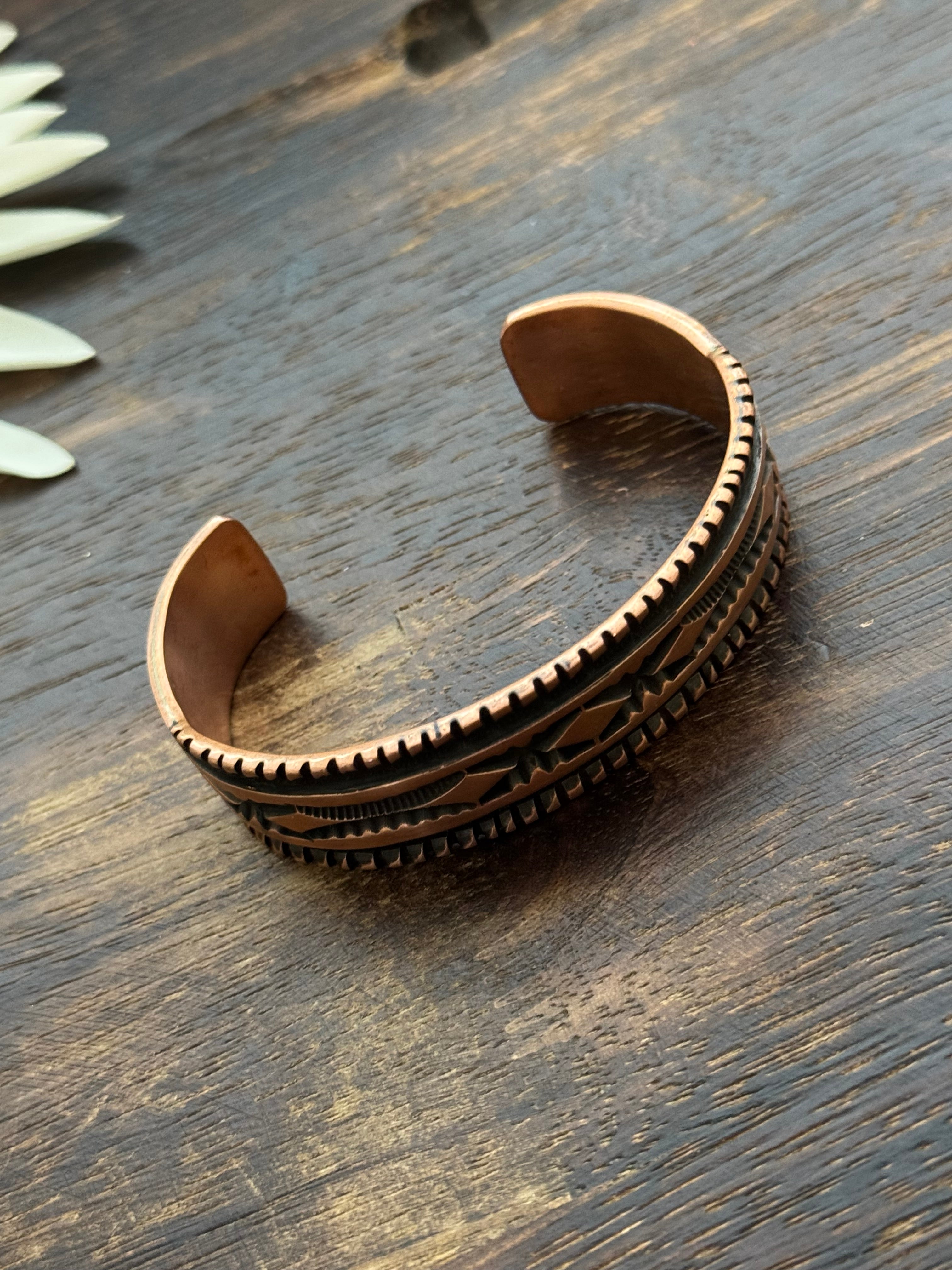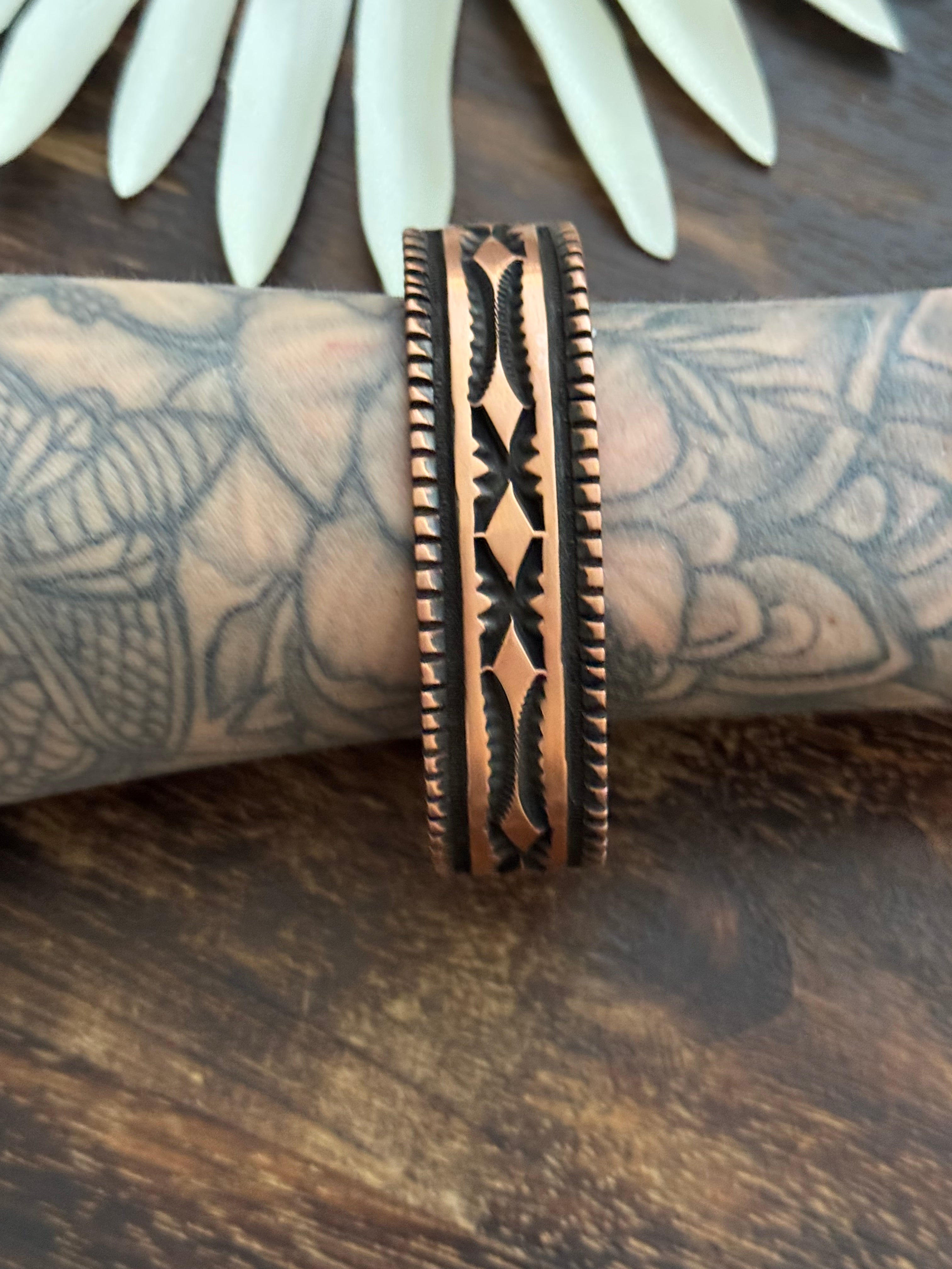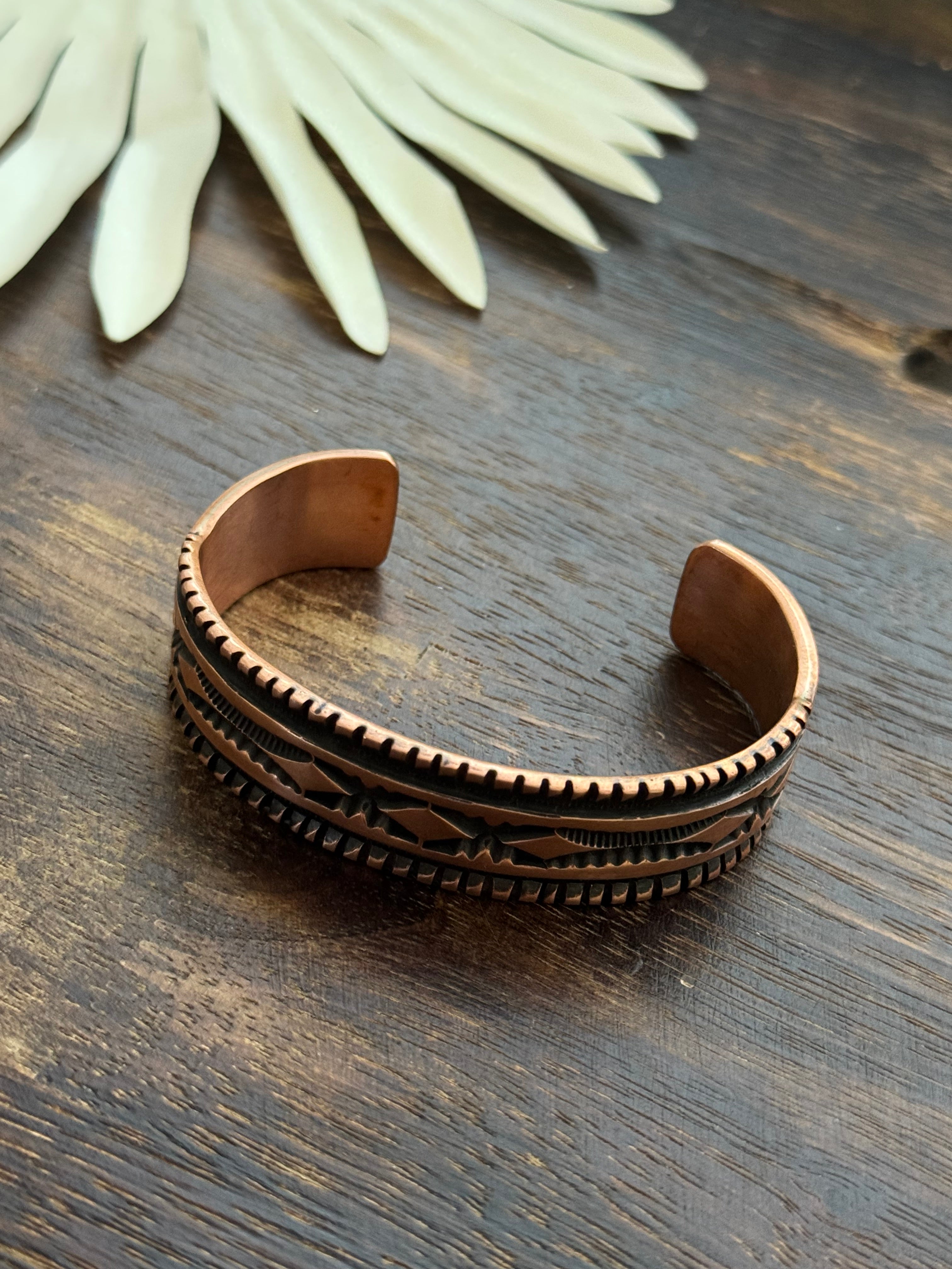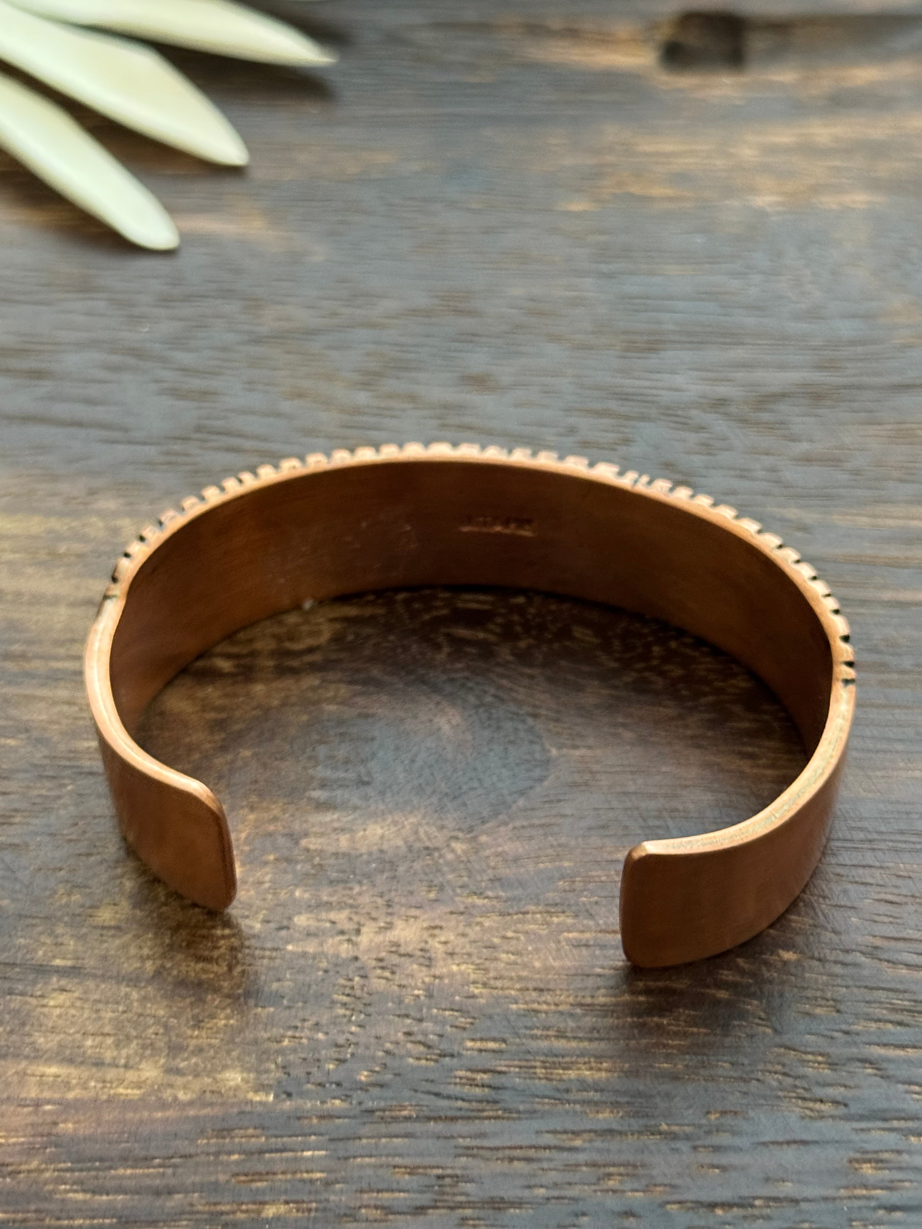 Jerold Tahe Copper Cuff Bracelet. It measures 3/4 of an inch wide with an inside circumference of 5 7/8 inches and a gap of 1 1/2 inches. Signed and stamped