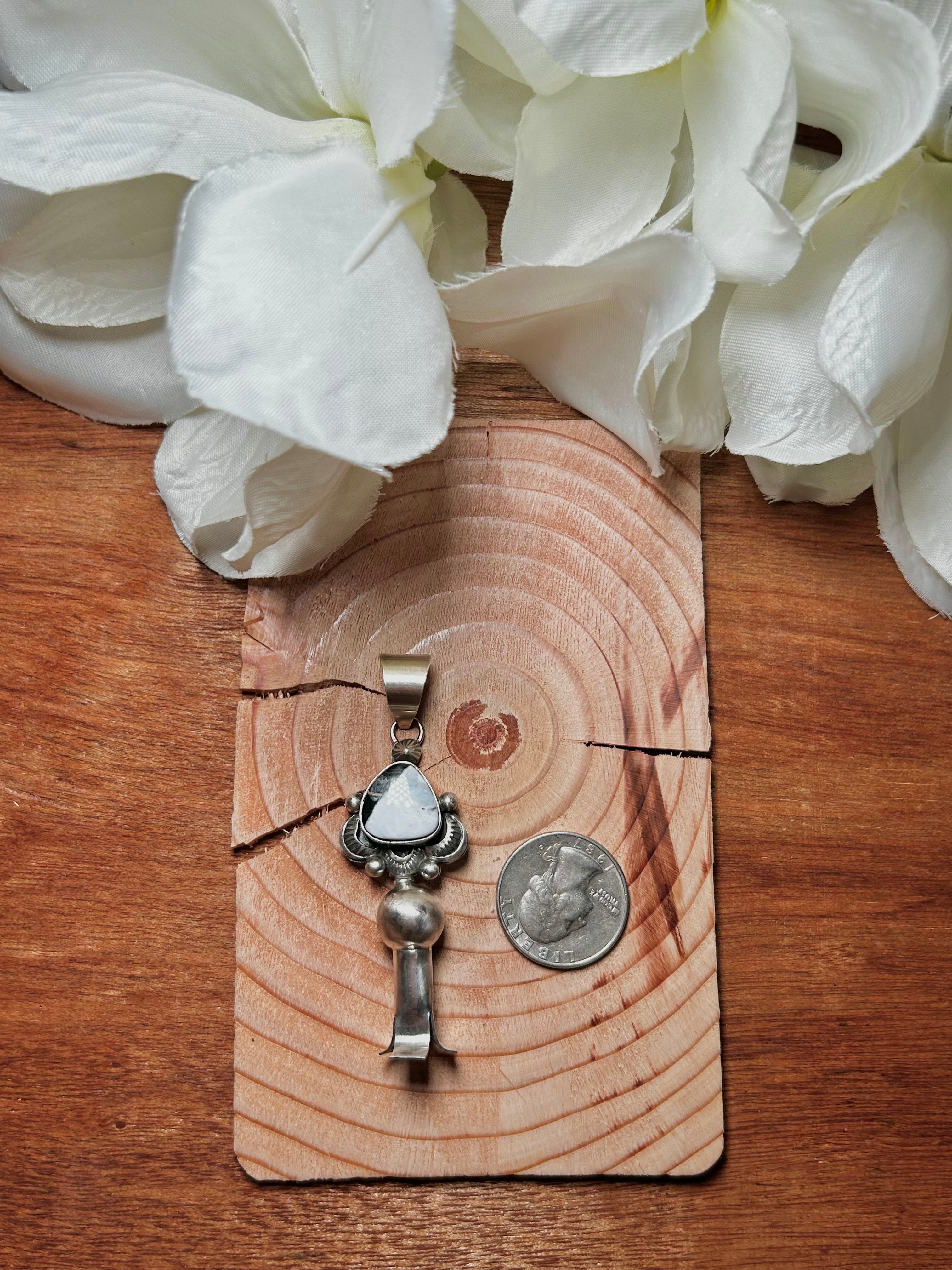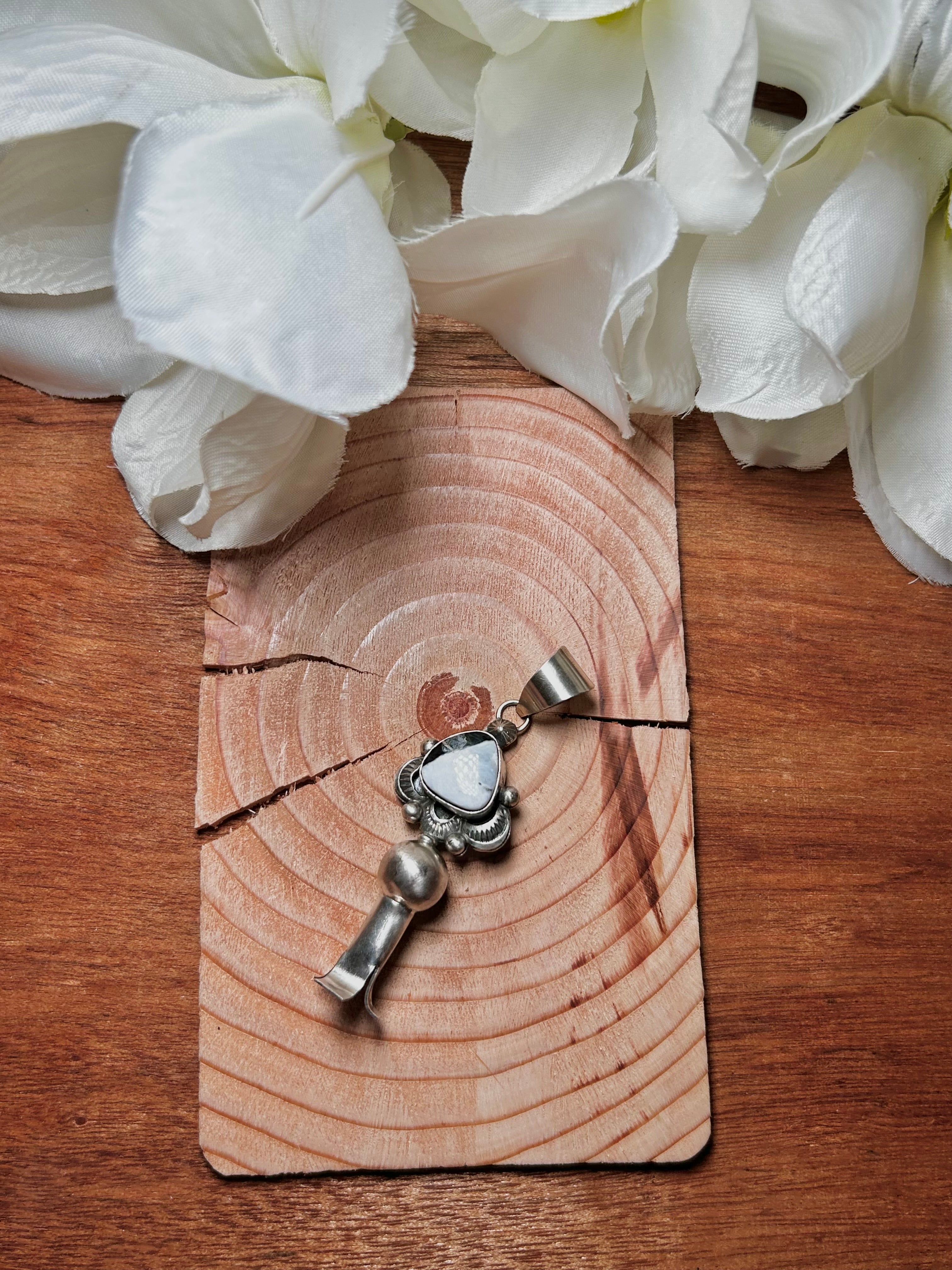 Jhanita Long White Buffalo & Sterling Silver Pendant. It measures 3 inches long and 7/8 of an inch wide. Pendant Only. Signed by the artist and stamped sterling silver.