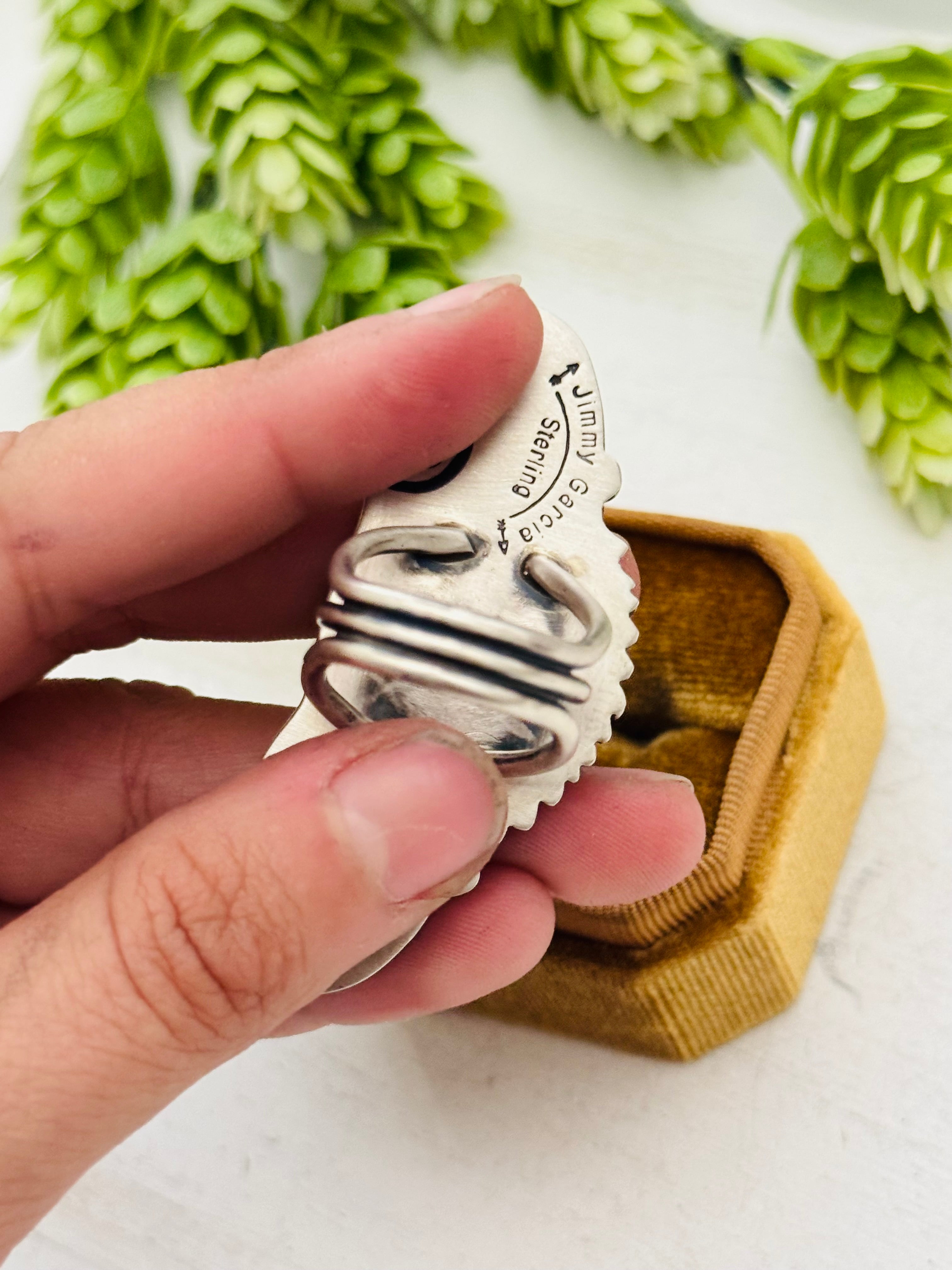 Amazing ring. Jimmy Garcia Palomino Variscite & Sterling Silver Ring Size 7. It measures 2 3/8 inches long and 1 inch wide. Signed by the artist and stamped sterling silver.