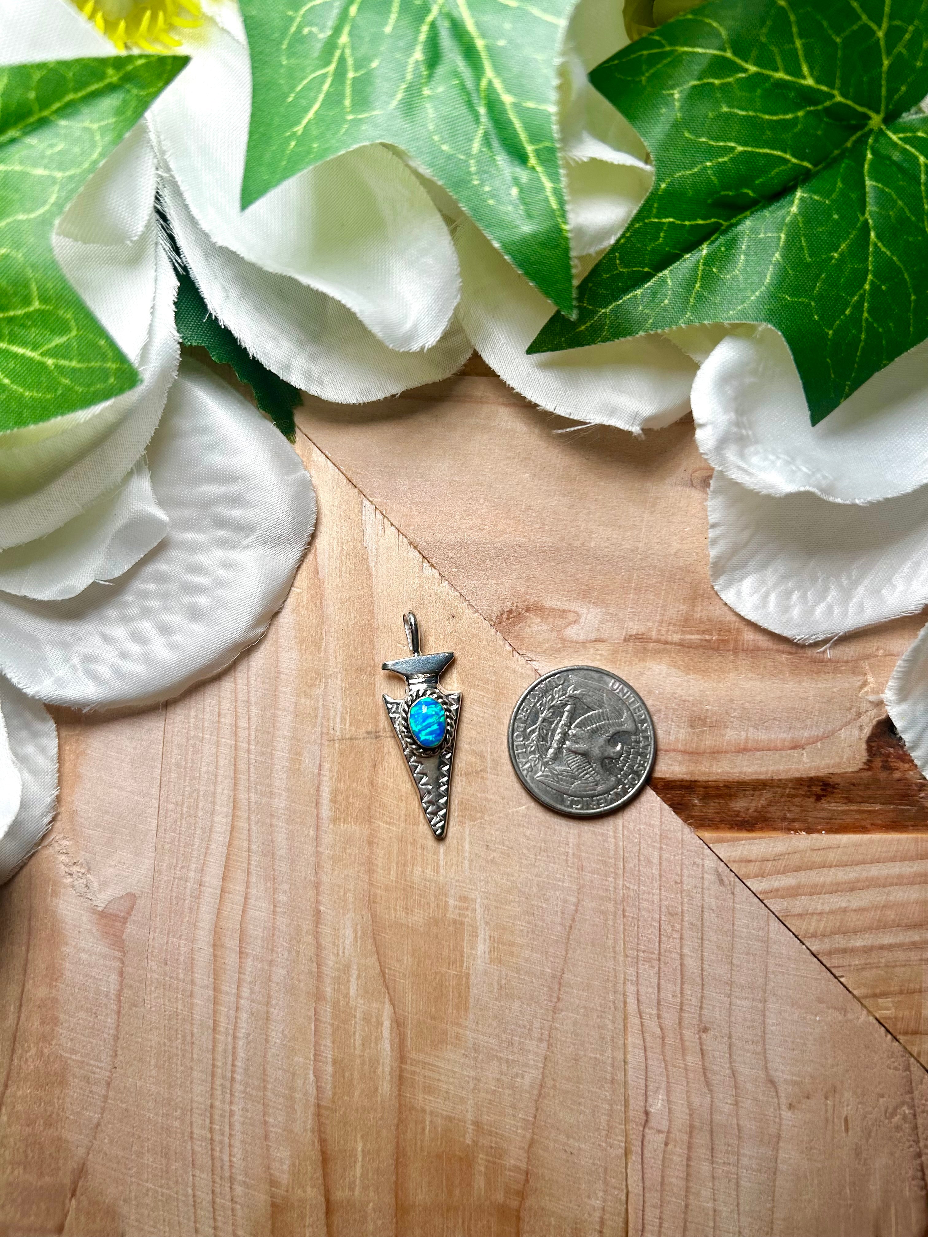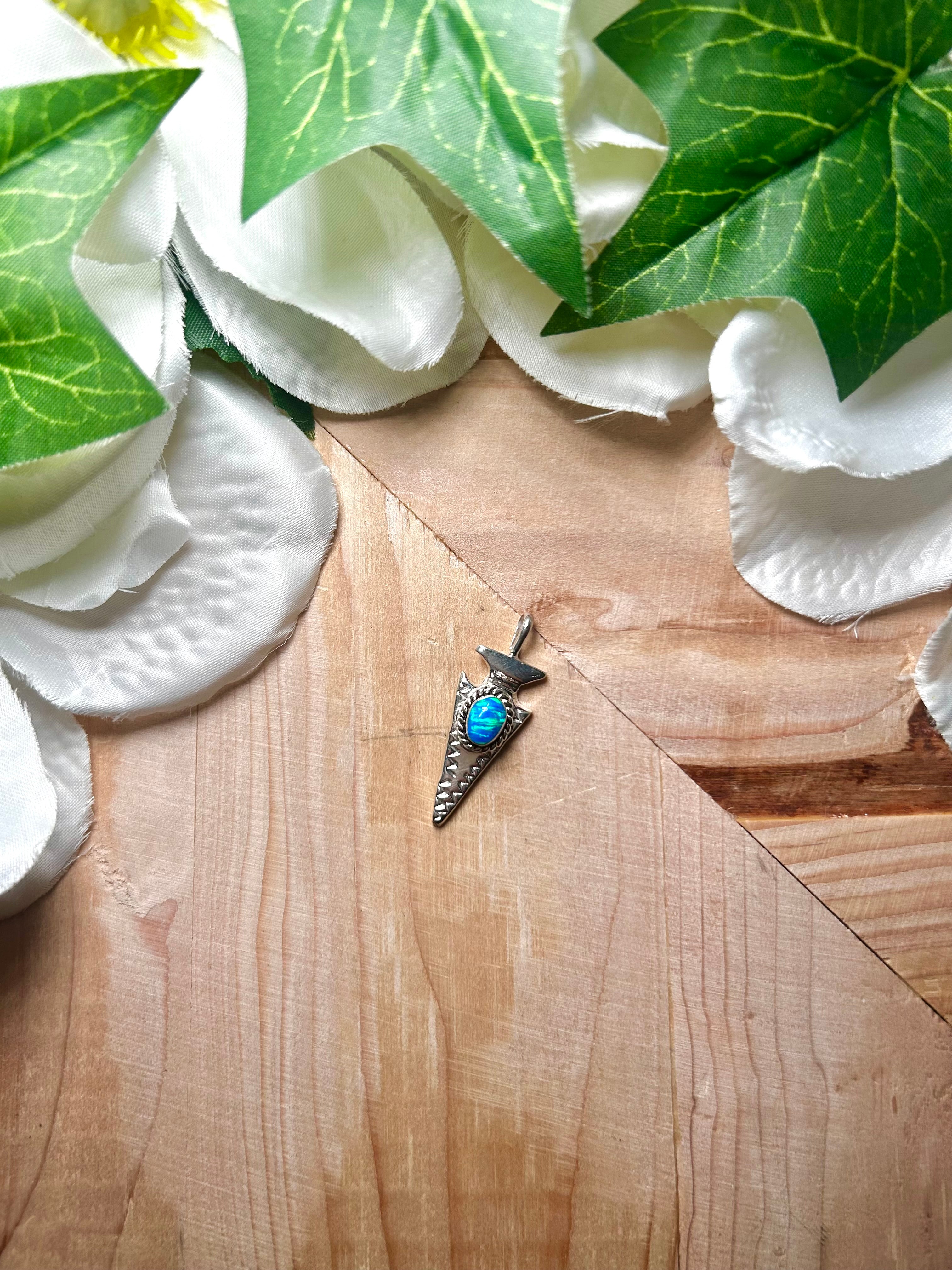 Joe Martinez Blue Opal & Sterling Silver Pendant. It measures 1 1/2 inches long and 1/2 of an inch wide. Pendant Only! Signed by the artist and stamped sterling silver.
