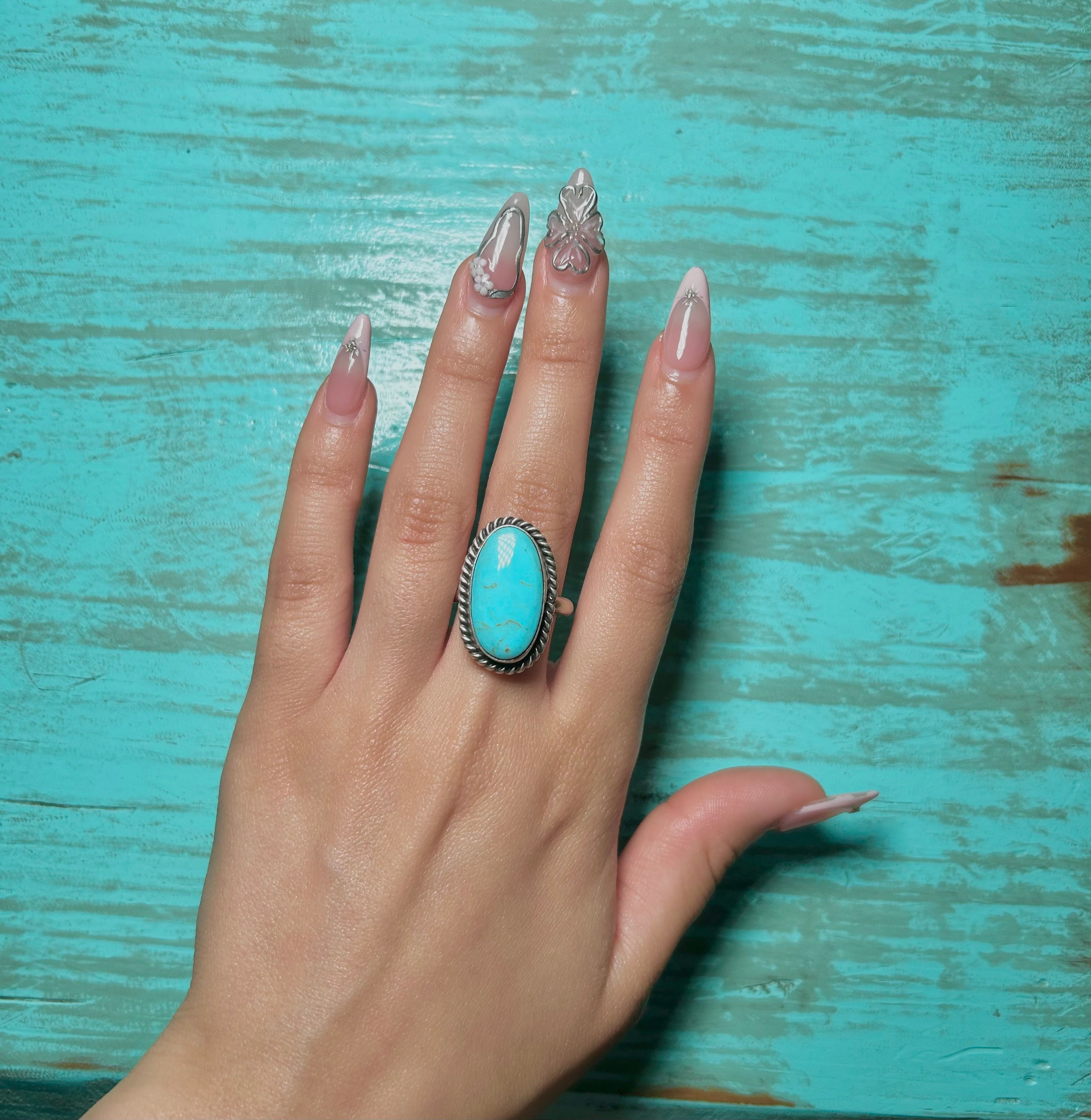 Johnny Dixon Kingman Turquoise & Sterling Silver Adjustable Size. It measures 1 inch long and 5/8 of an inch wide. Signed by the artist and stamped sterling silver.