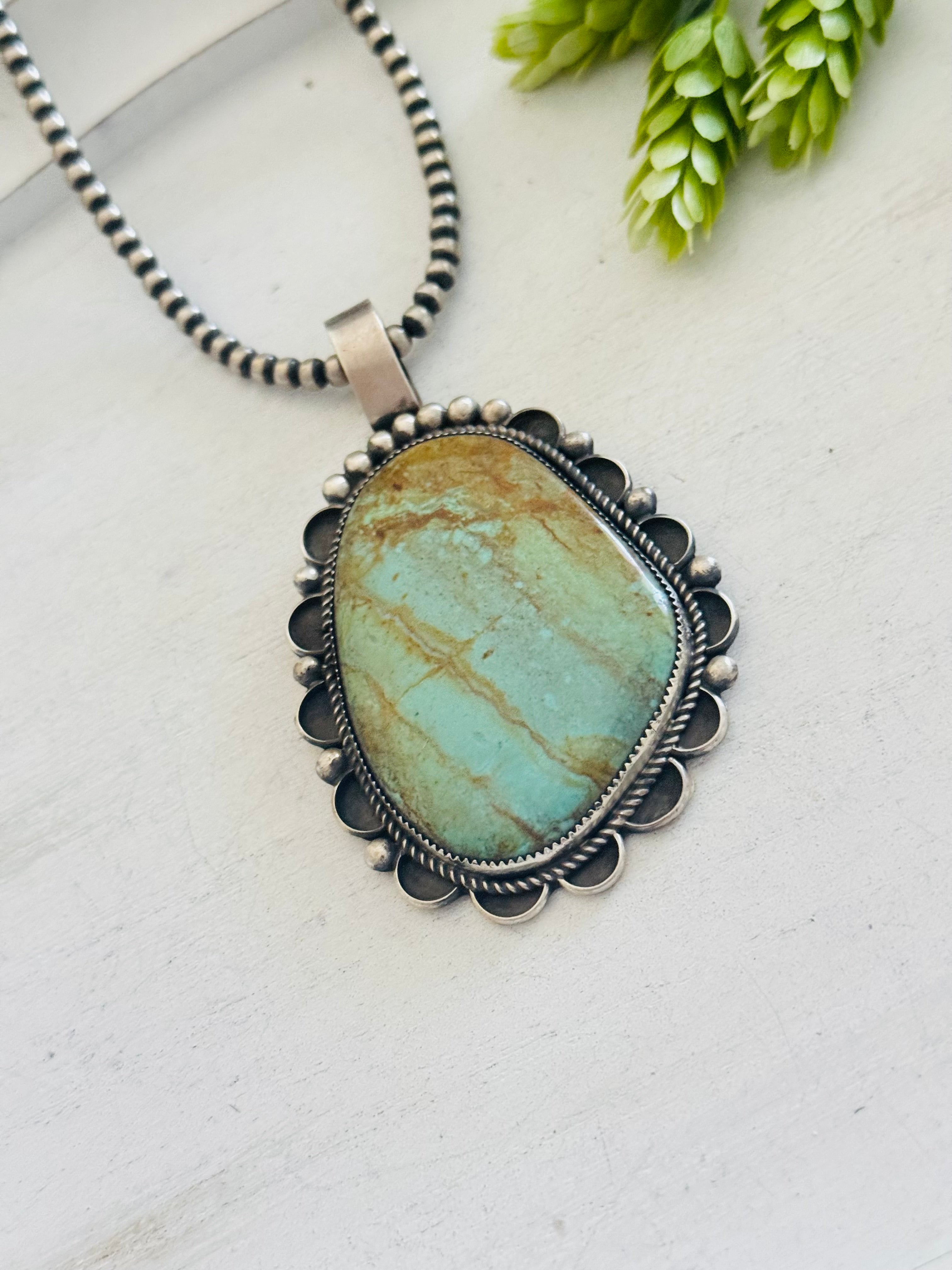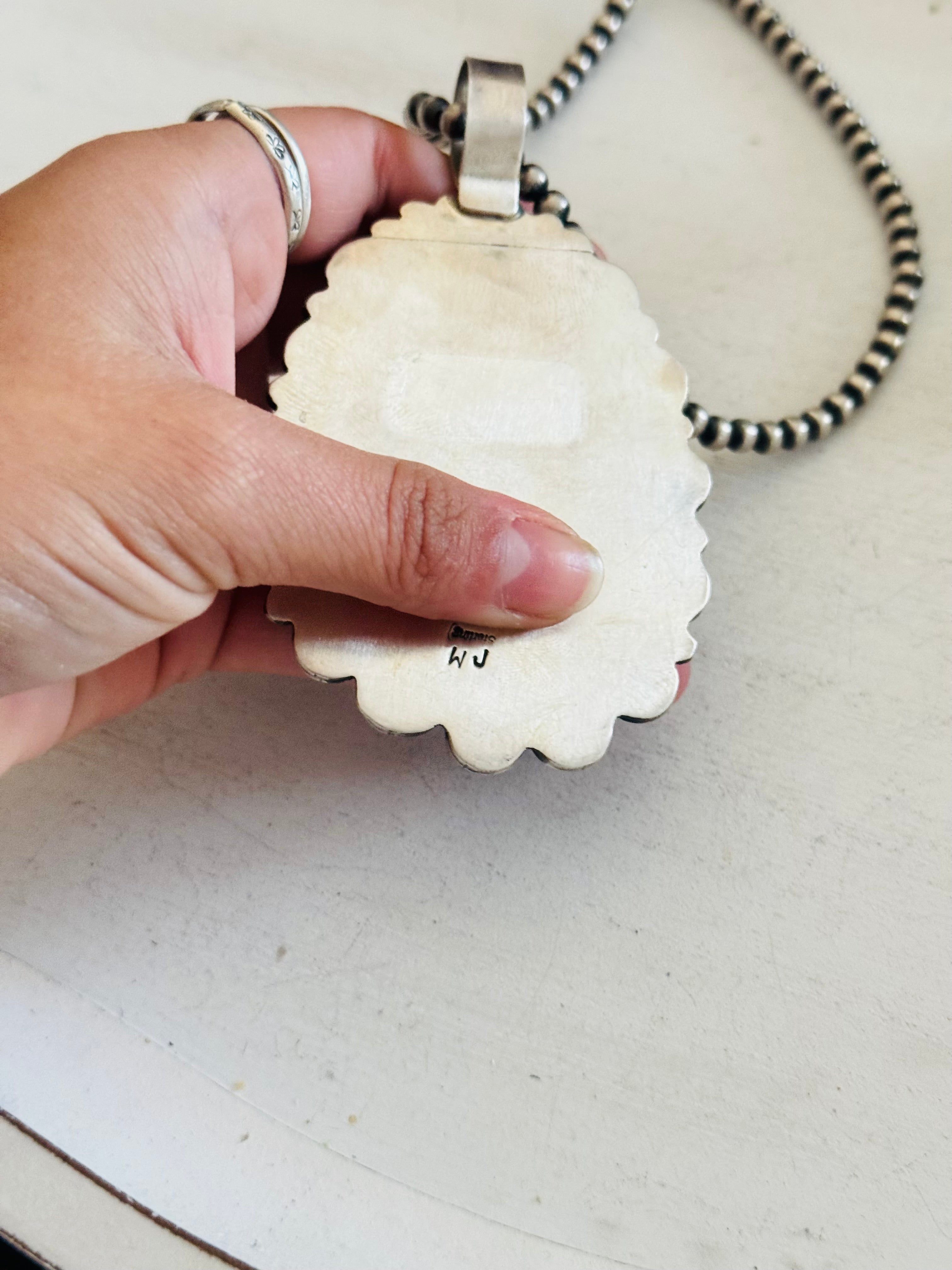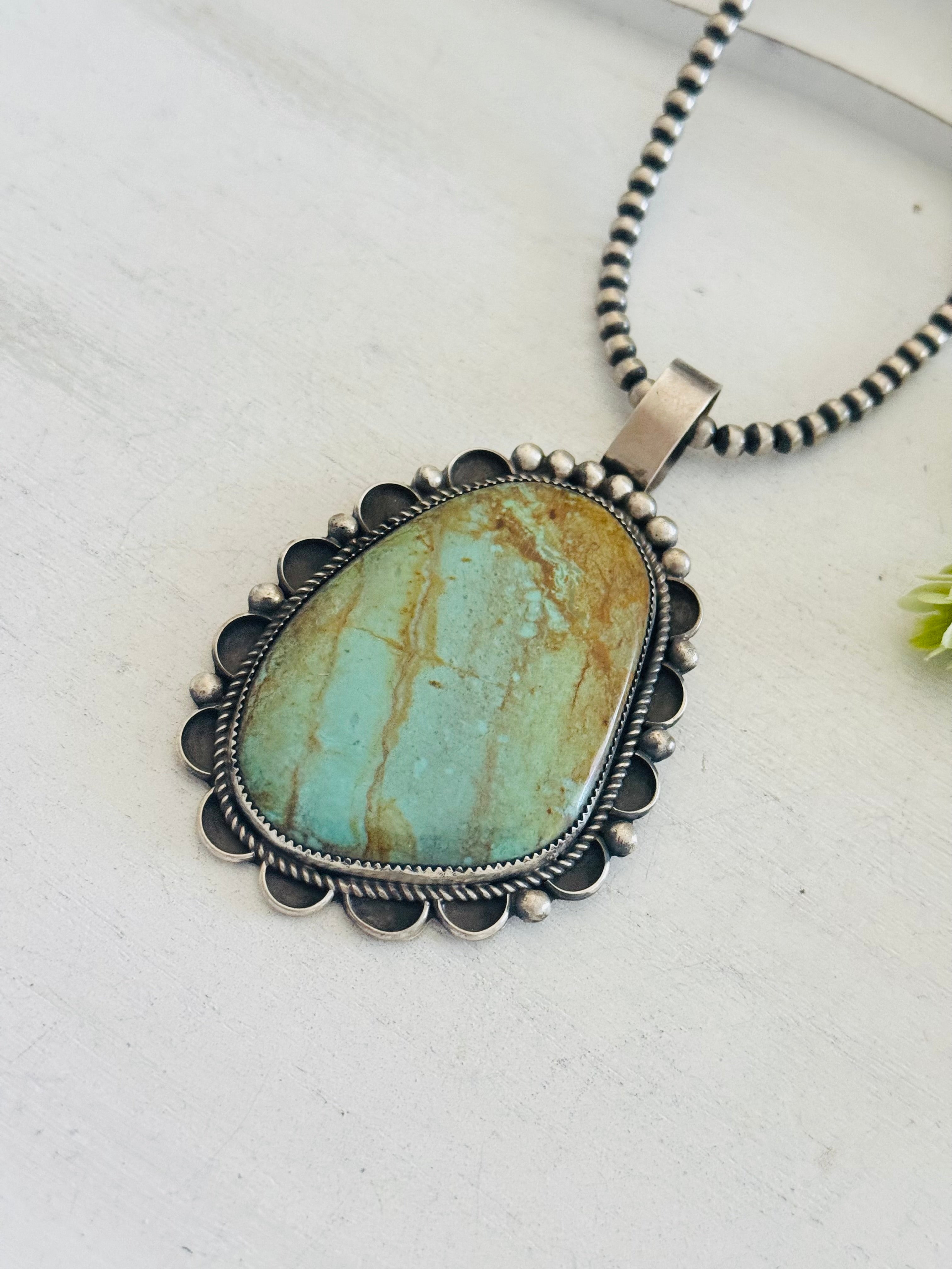 Juanita Mcdonal #8 Turquoise & Sterling Silver Pendant. It measures 4 inches long and 2 3/8 inches wide. PENDANT ONLY! Signed by the artist and stamped sterling silver.
