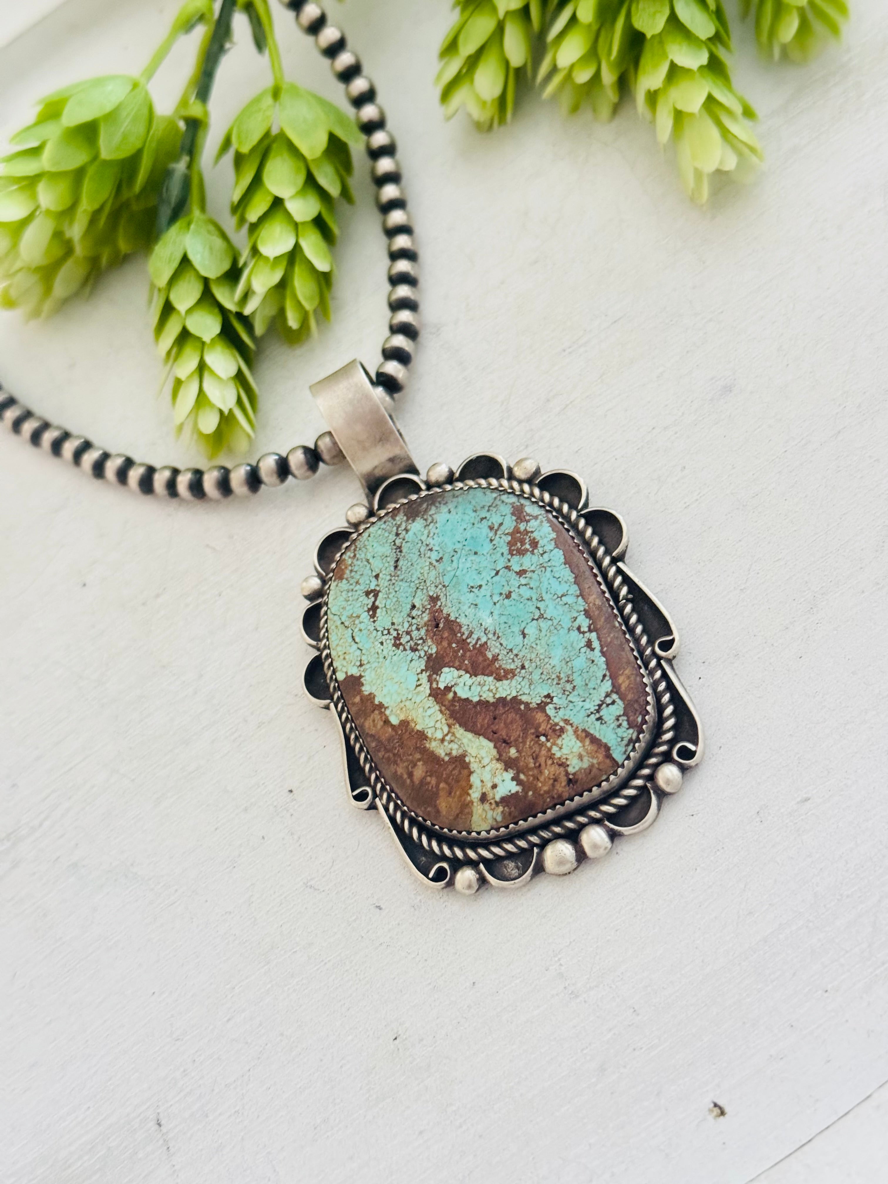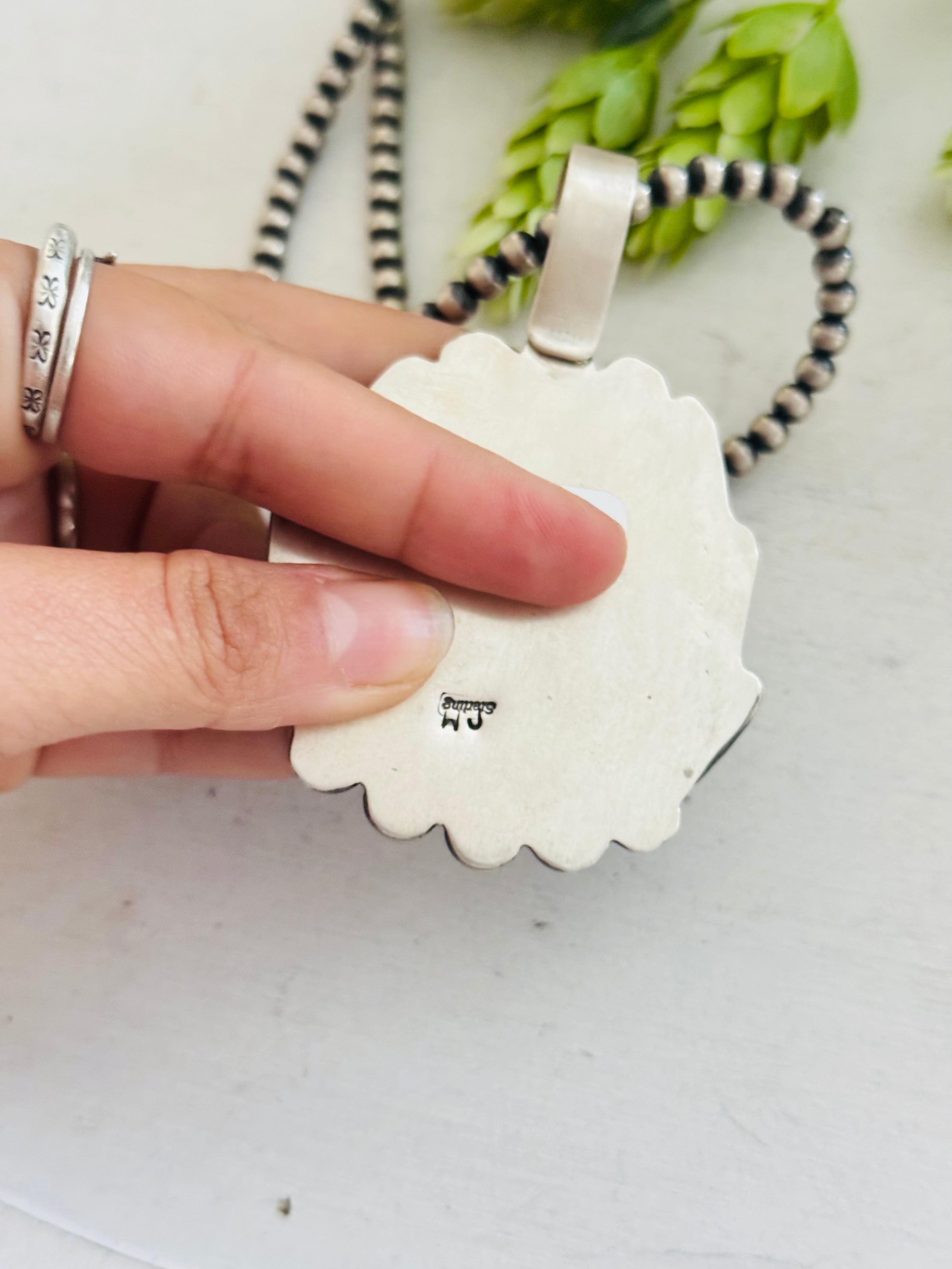 Juanita Mcdonal #8 Turquoise & Sterling Silver Pendant. It measures 3 1/4 inches long and 2 inches wide. PENDANT ONLY! Signed by the artist and stamped sterling silver.