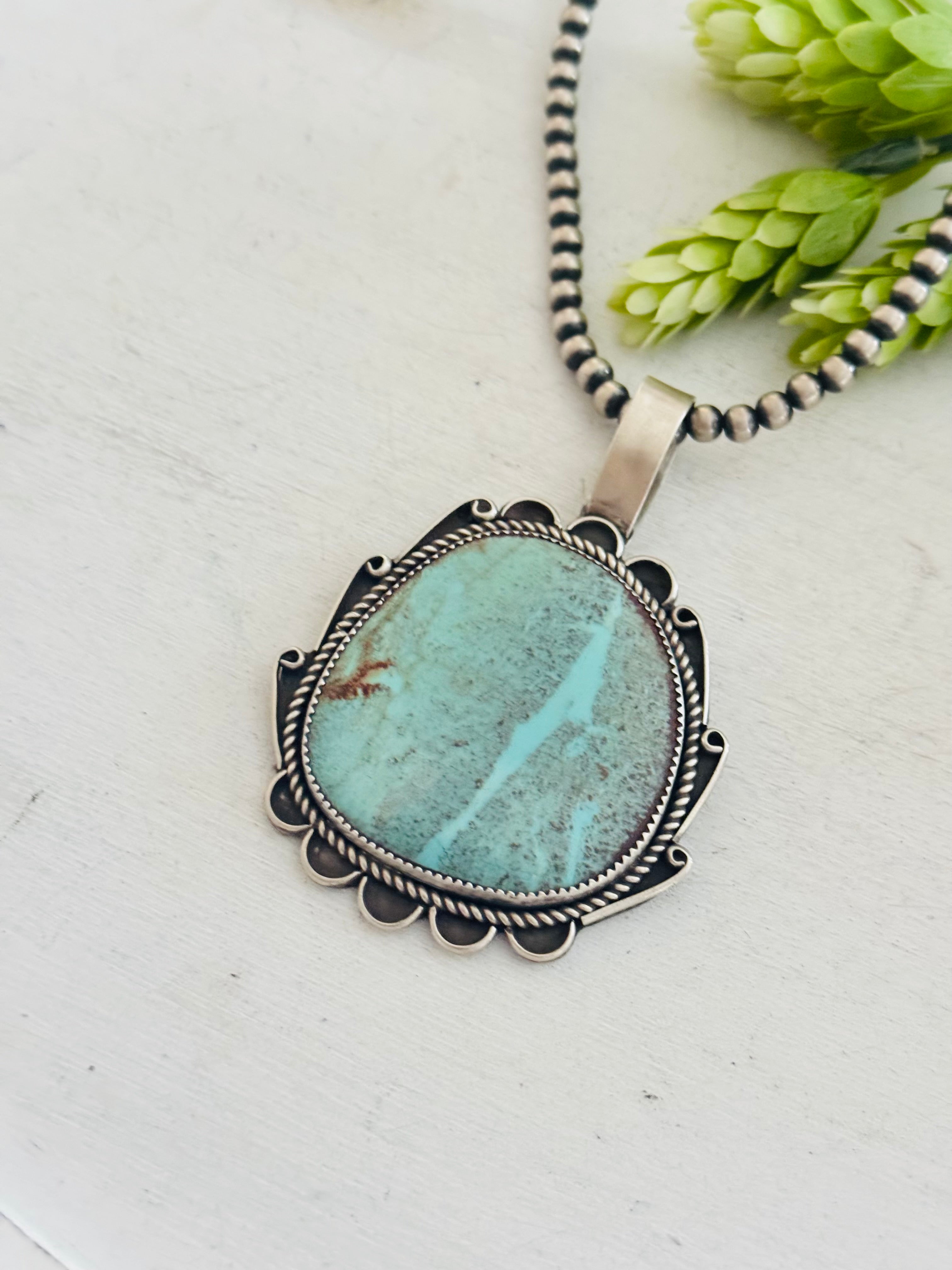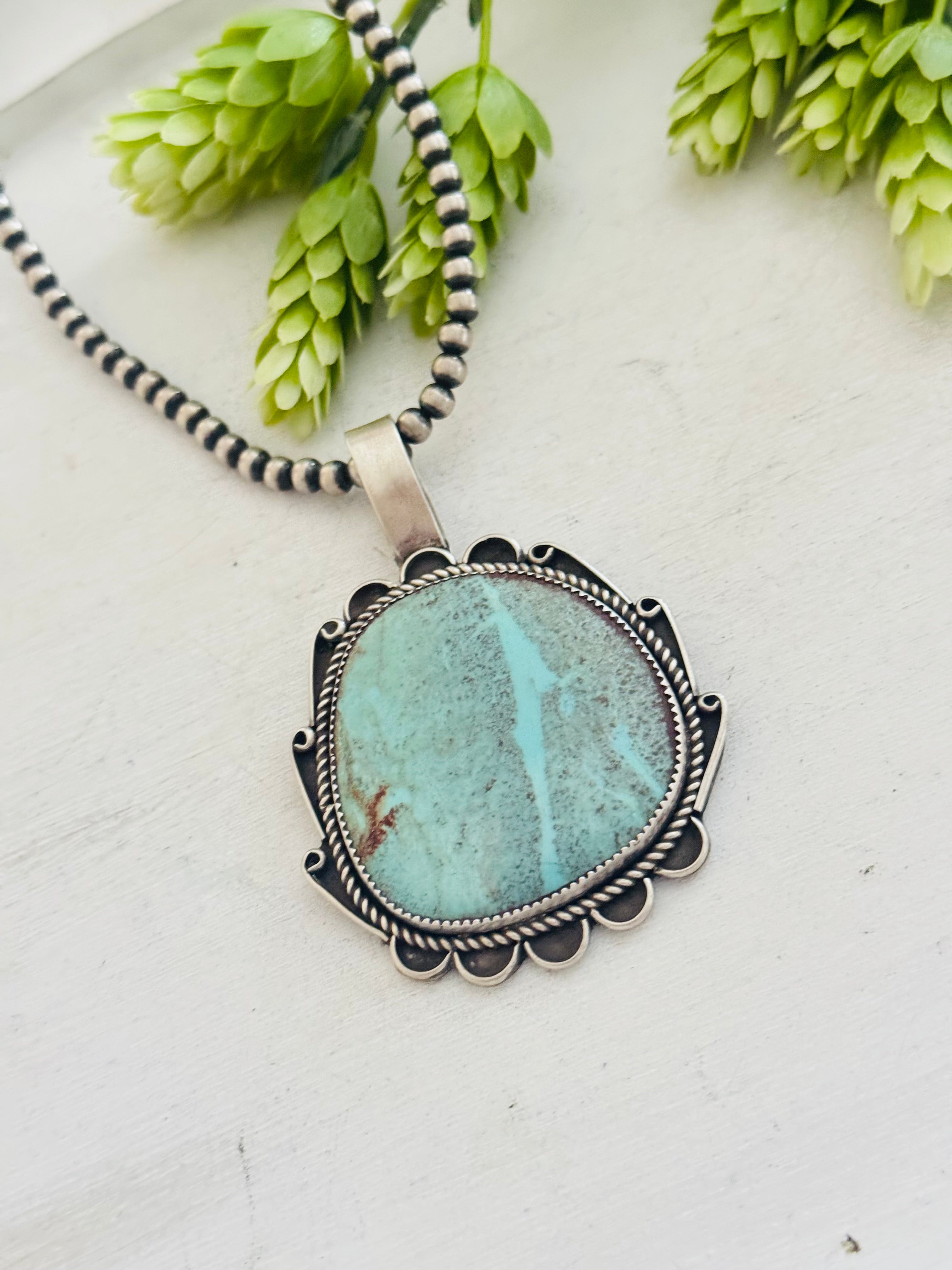 Juanita Mcdonal #8 Turquoise & Sterling Silver Pendant. It measures 3 1/4 inches long and 2 1/4 inches wide. PENDANT ONLY! Signed by the artist and stamped sterling silver.