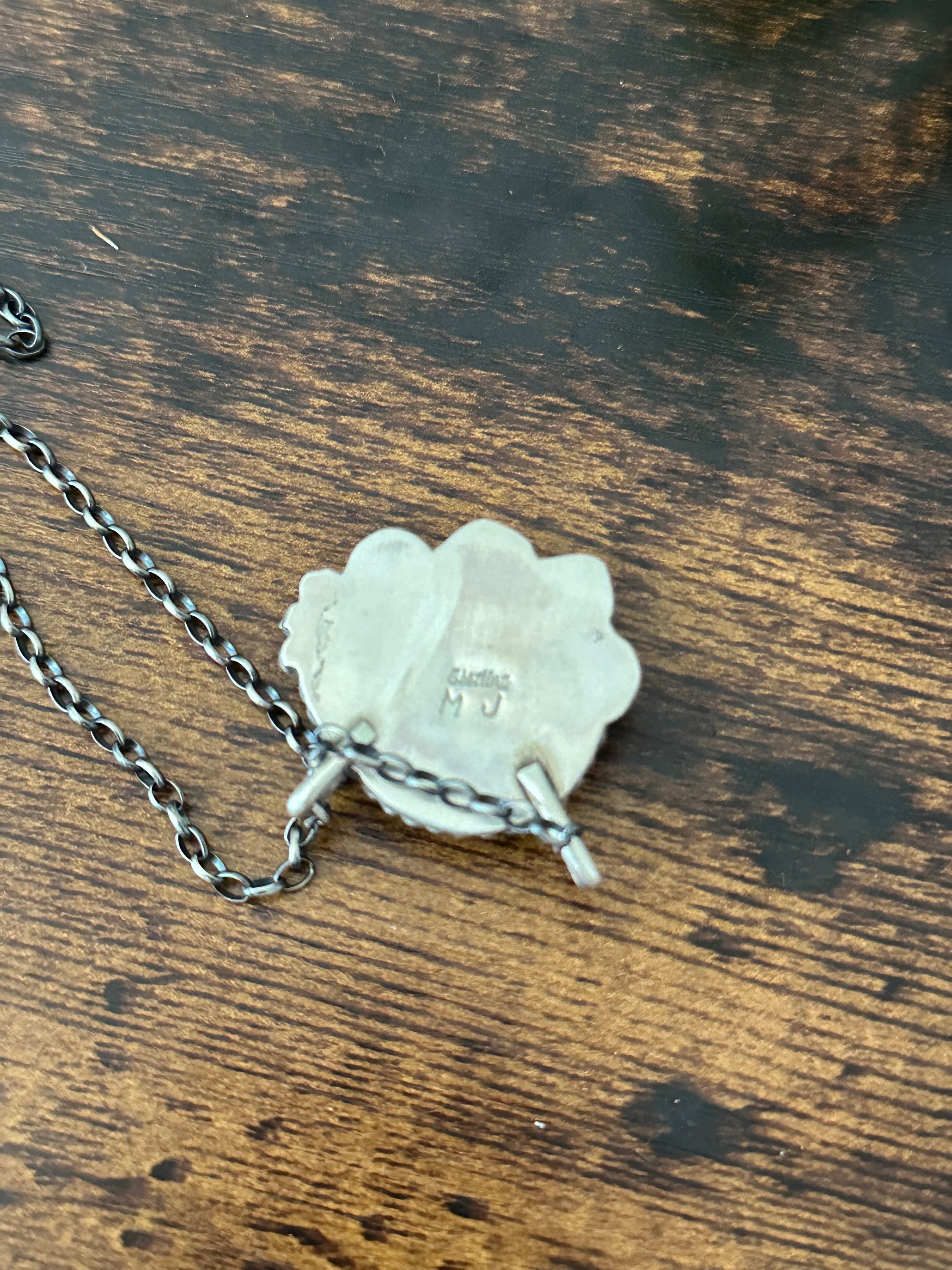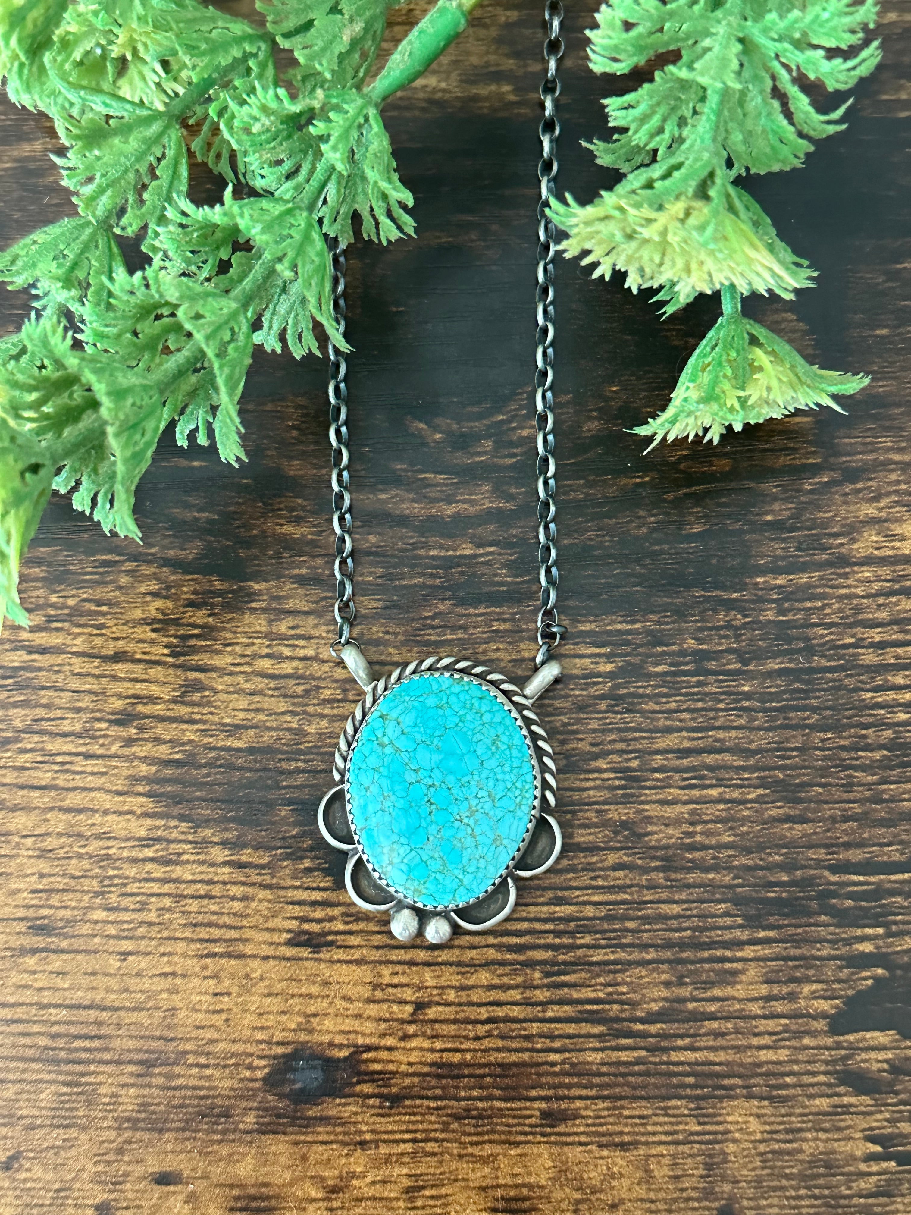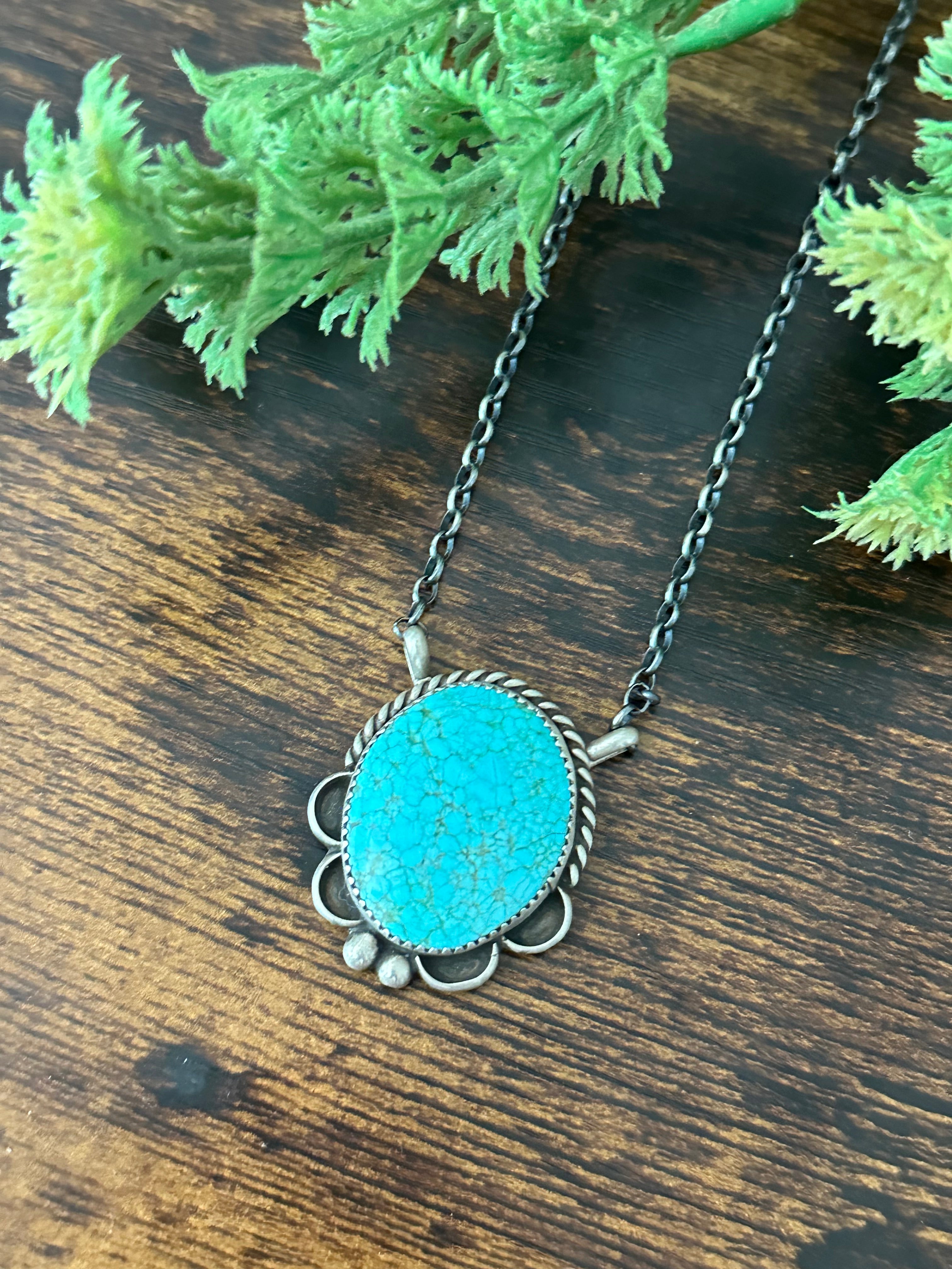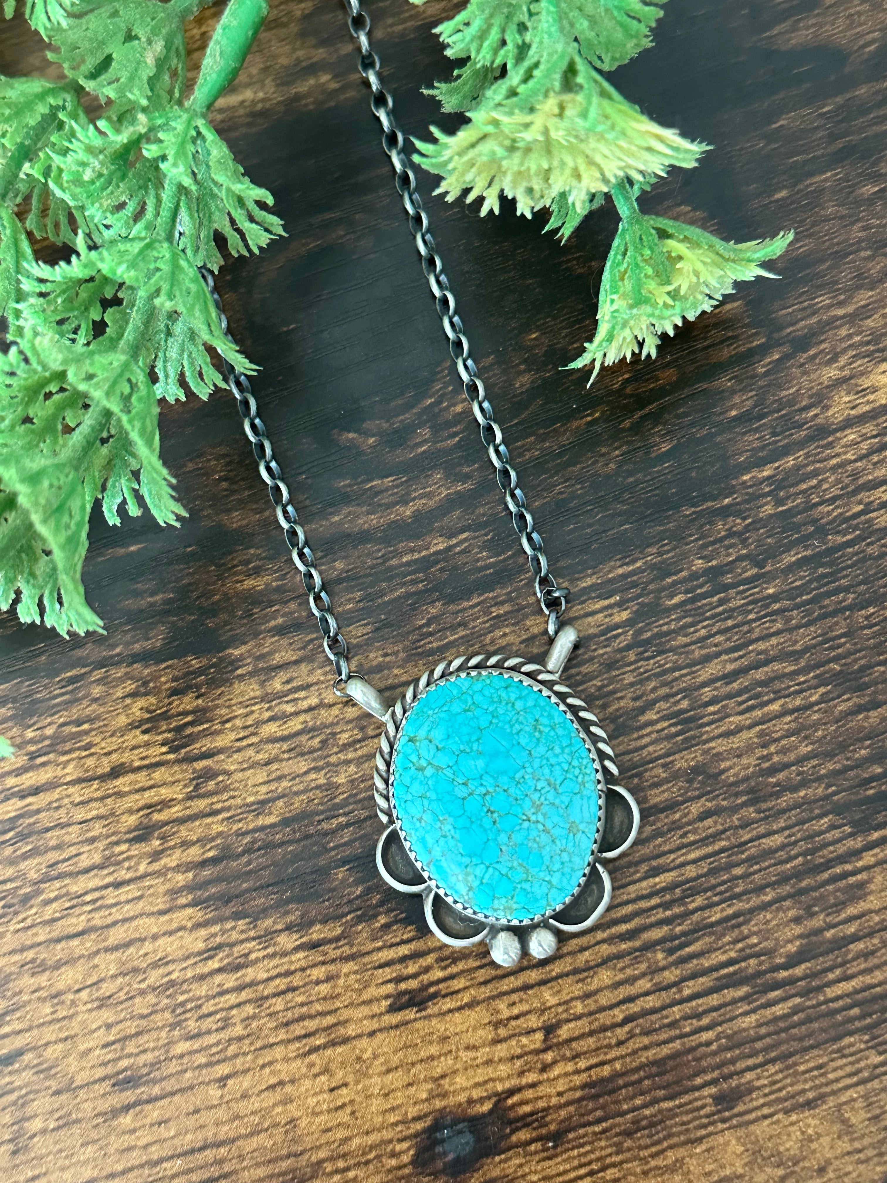 Beautiful Necklace. Juanita Mcdonal Kingman Turquoise & Sterling Silver Necklace. It measures 18 inches long with hang while the chain measures 15 inches long. Signed by the artist and stamped sterling silver.