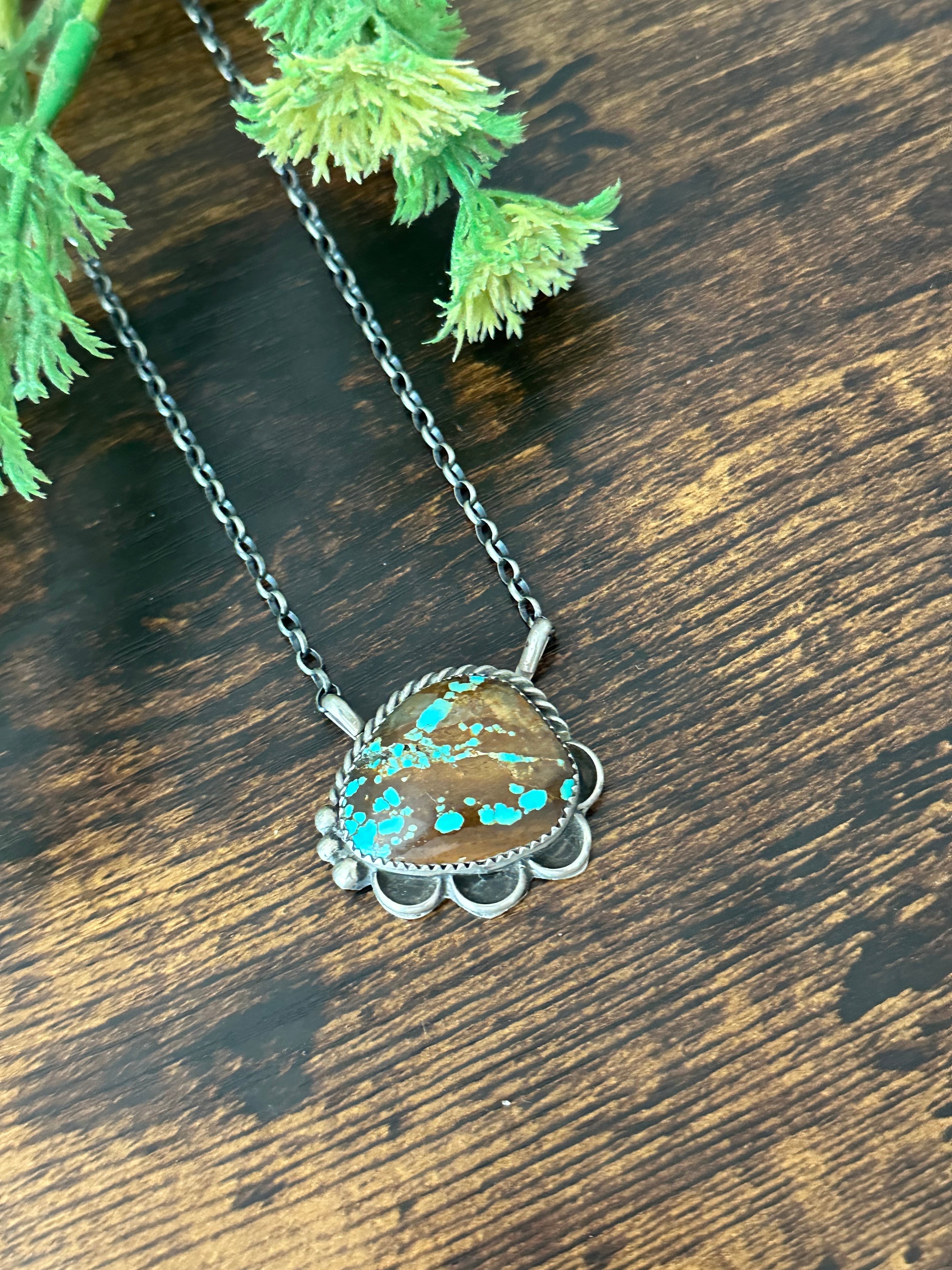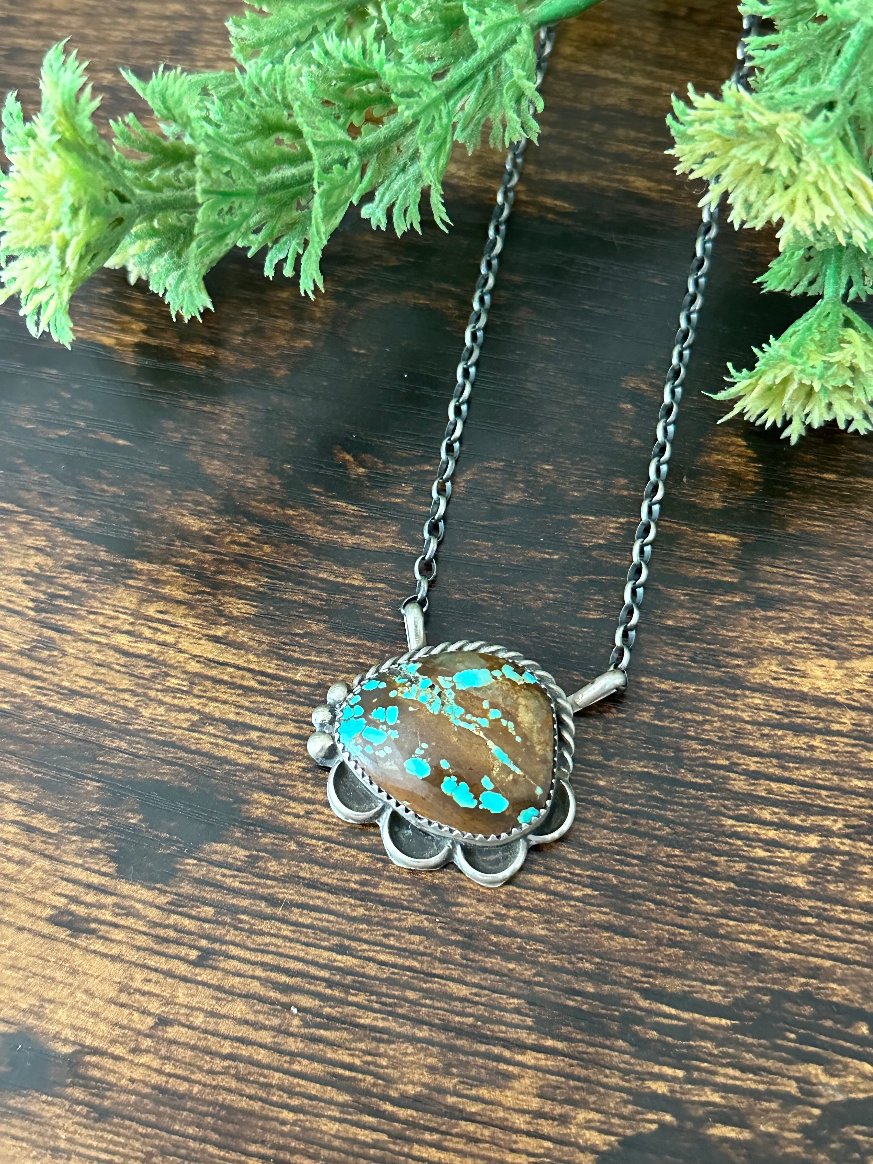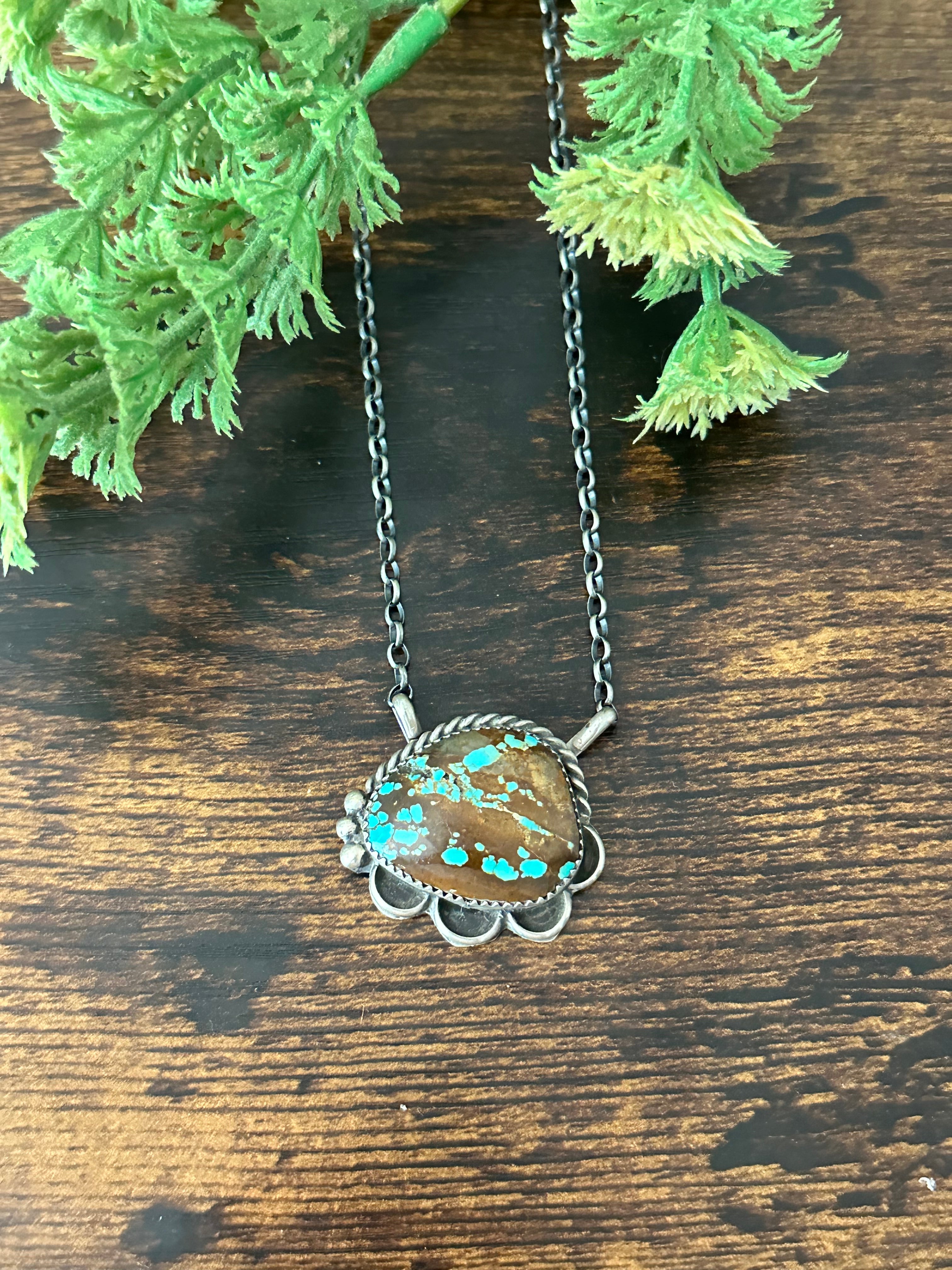 Beautiful Necklace. Juanita Mcdonal #8 Turquoise & Sterling Silver Necklace. It measures 18 inches long with hang while the chain measures 15 inches long. Signed by the artist and stamped sterling silver.