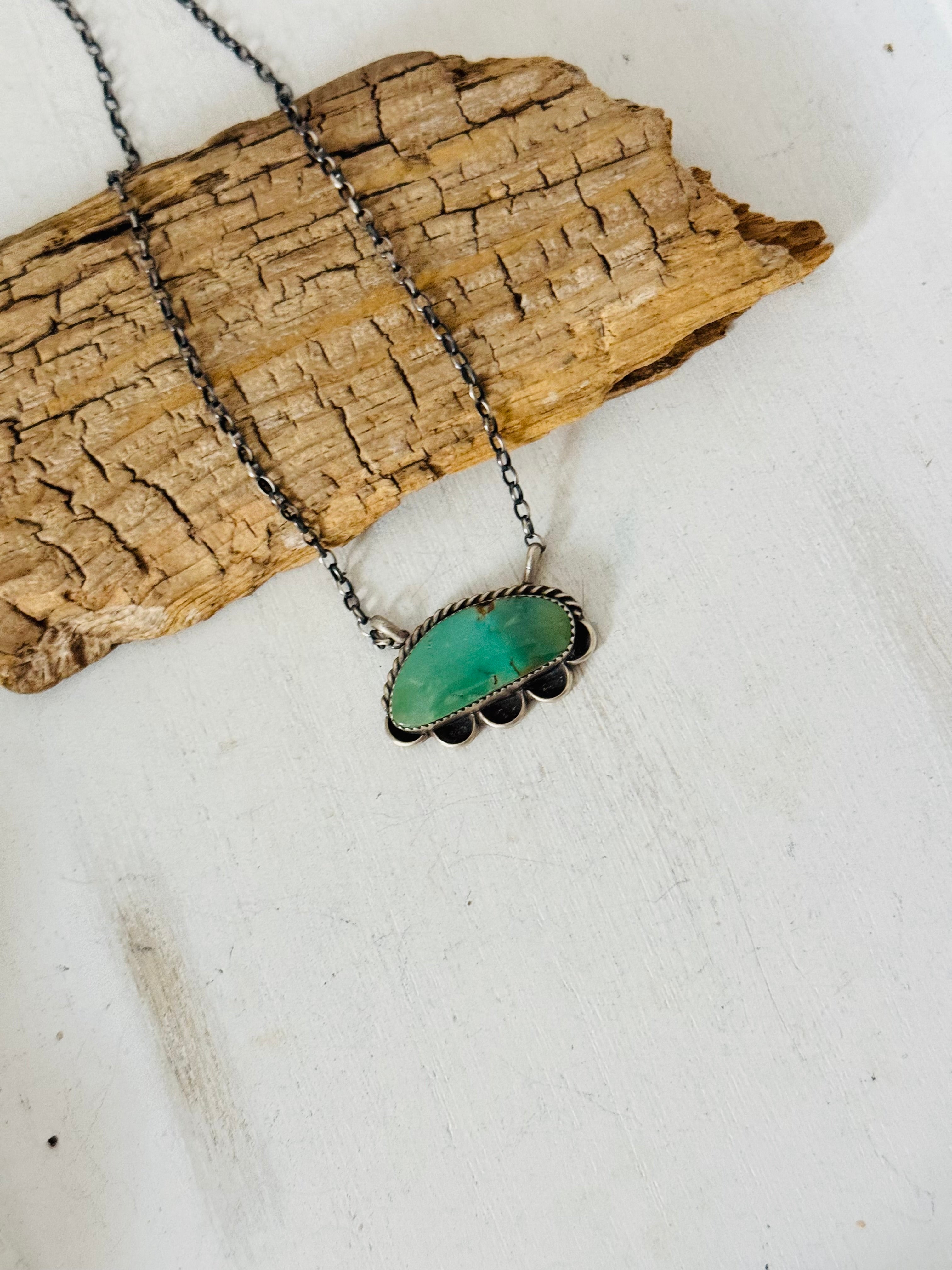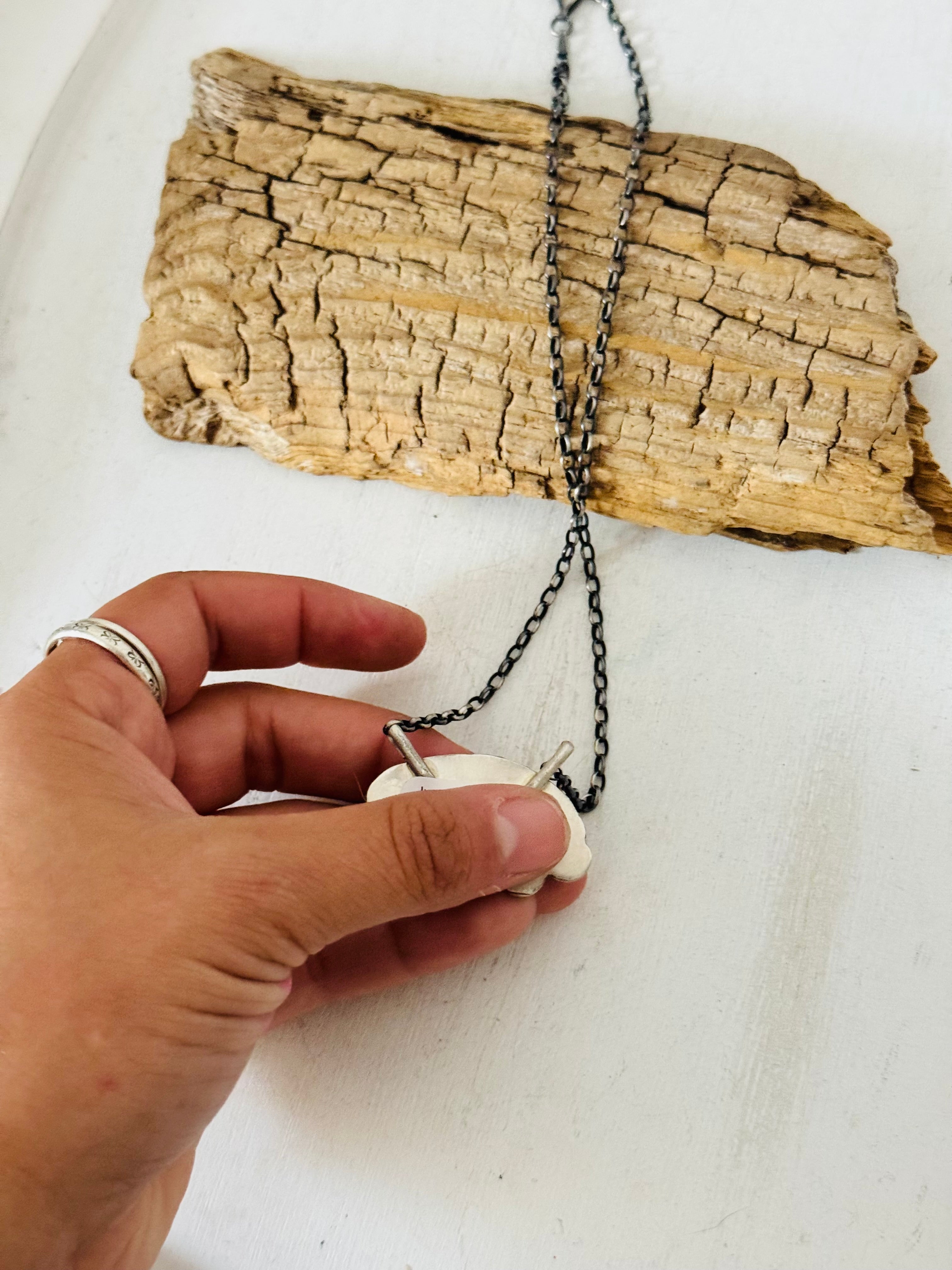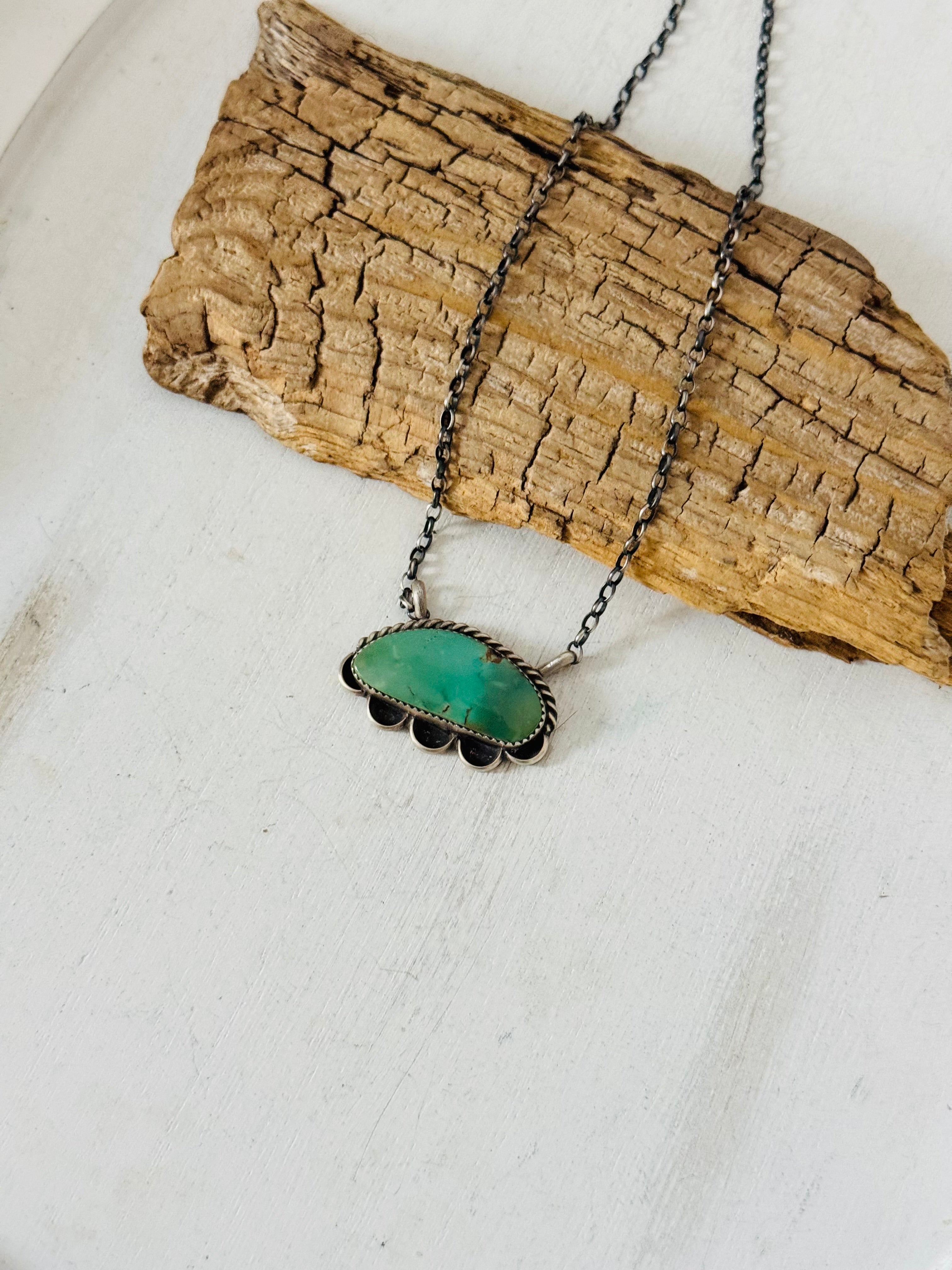 Beautiful Necklace. Juanita Mcdonal Kingman Turquoise & Sterling Silver Necklace. It measures 17 inches long with hang while the chain measures 15 inches long. Signed by the artist and stamped sterling silver.