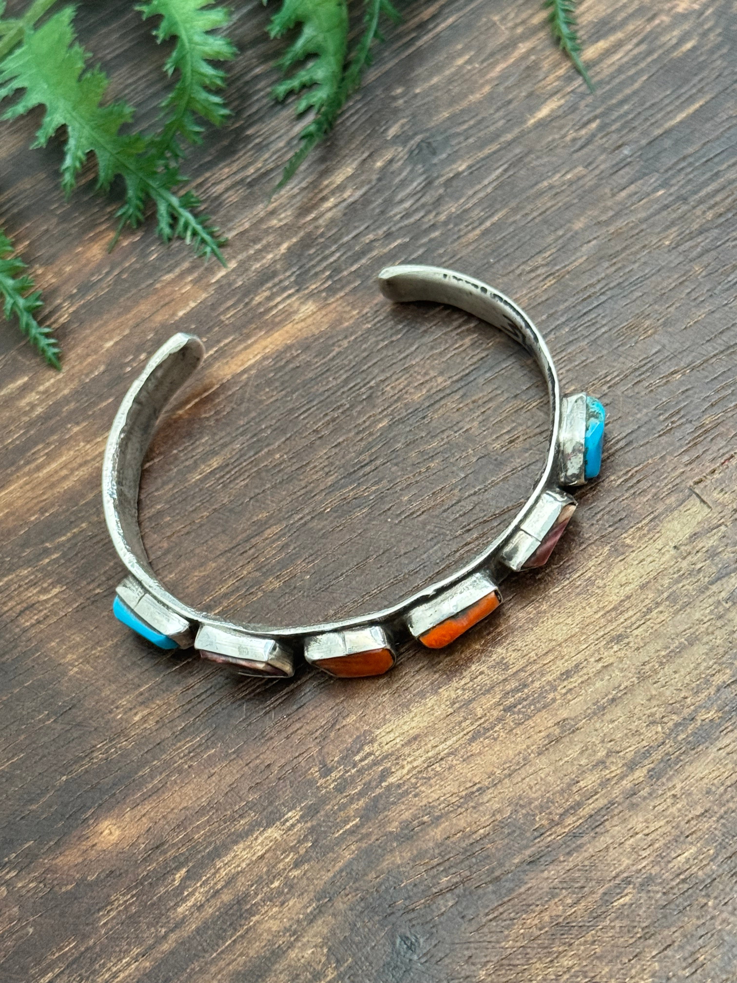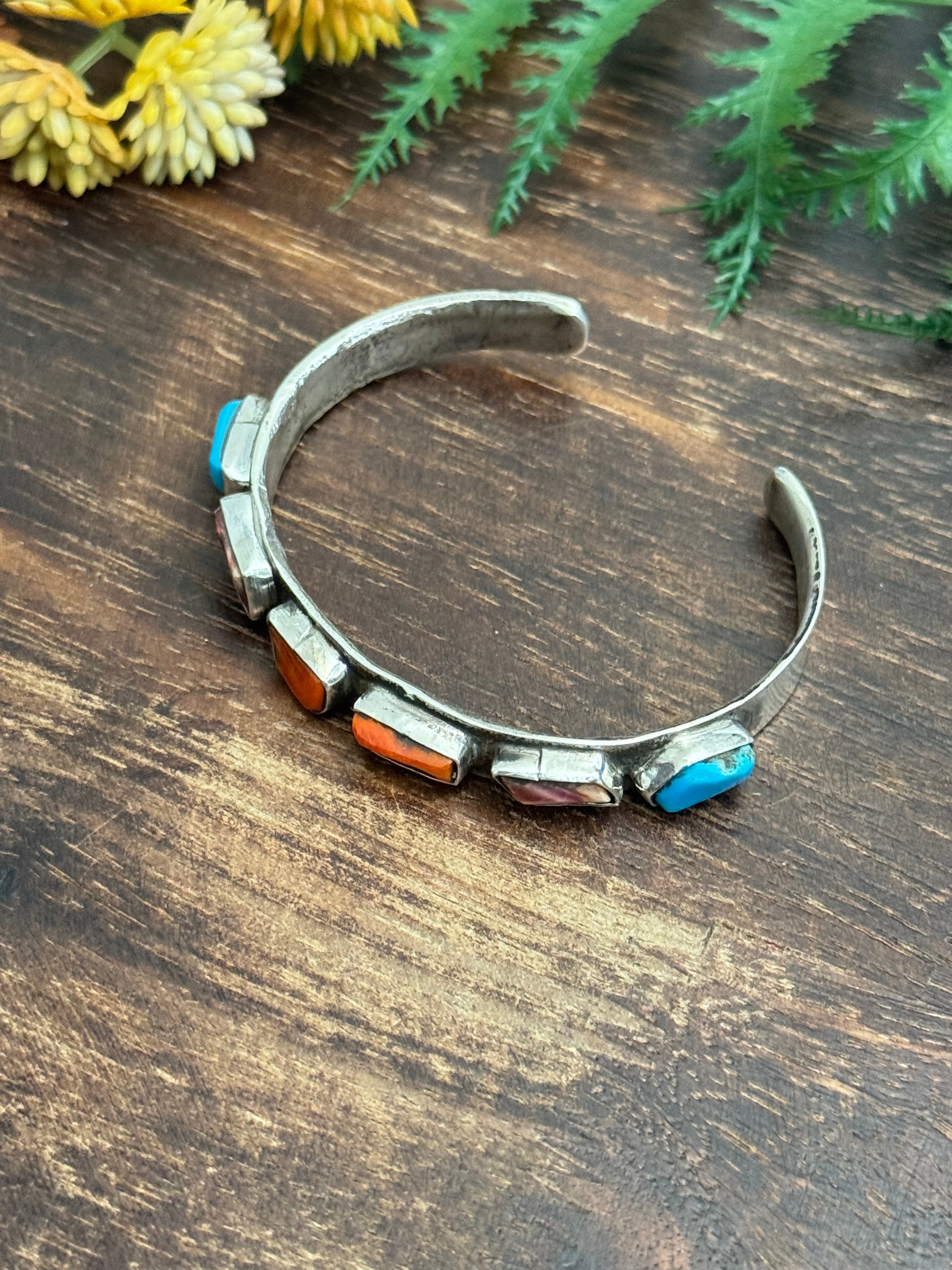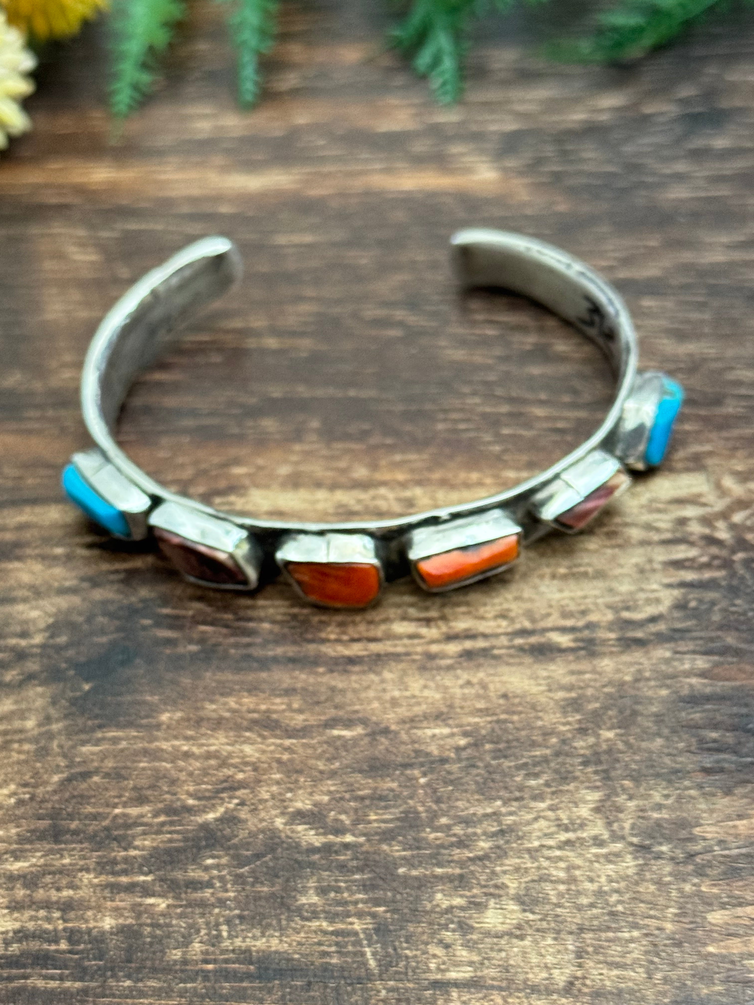 Jude Candalaria Multi Stone & Sterling Silver Cuff Bracelet. It measures 3/8 of an inch wide with an inside circumference of 5 3/8 inches and a gap of 1 1/8 inches. Signed by artist and stamped sterling silver.