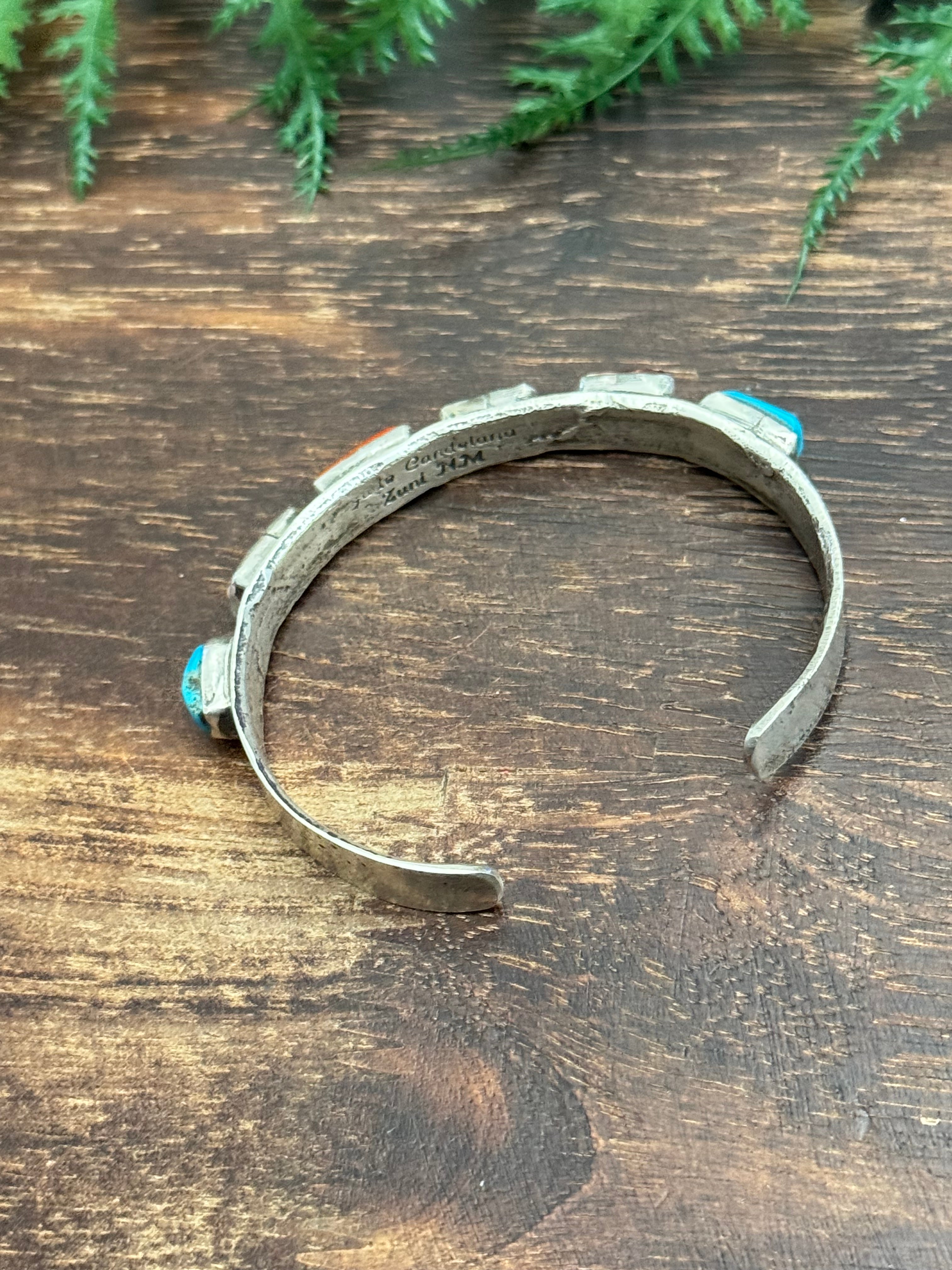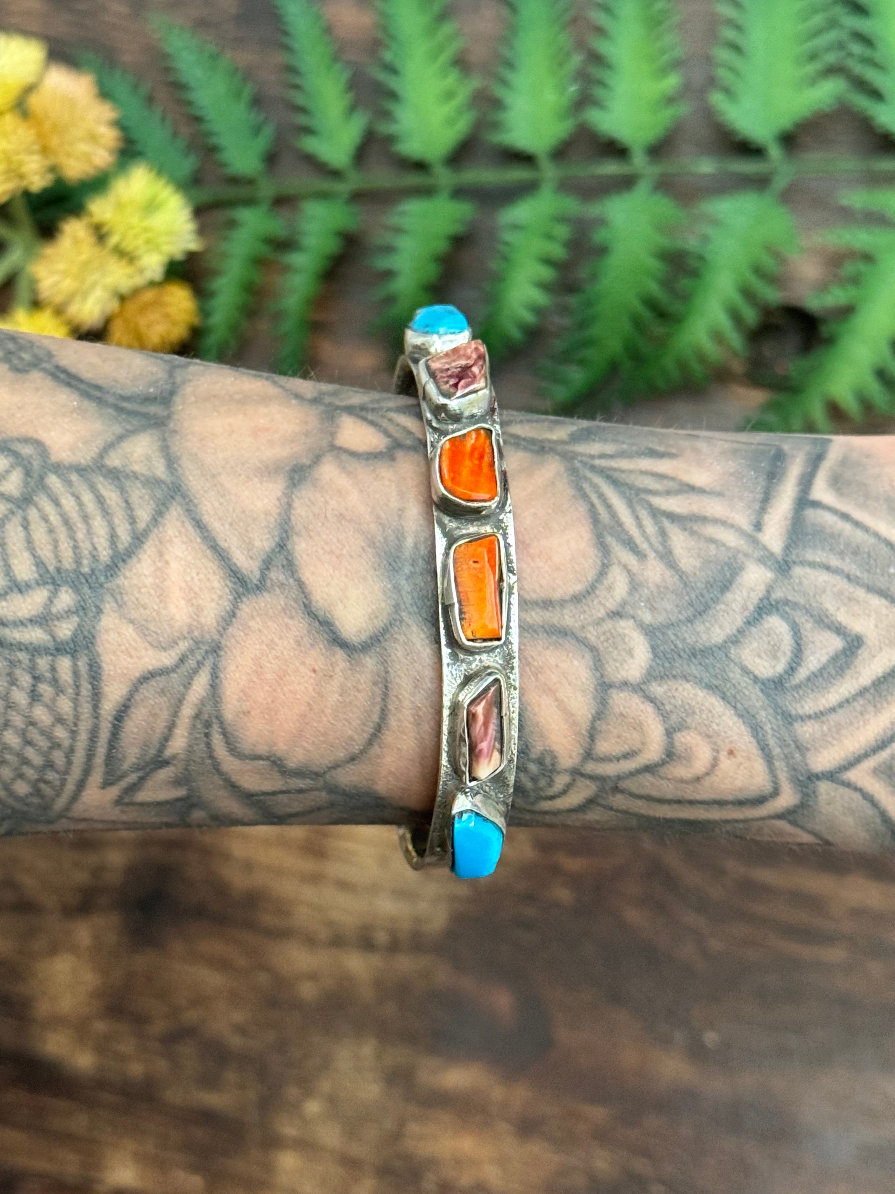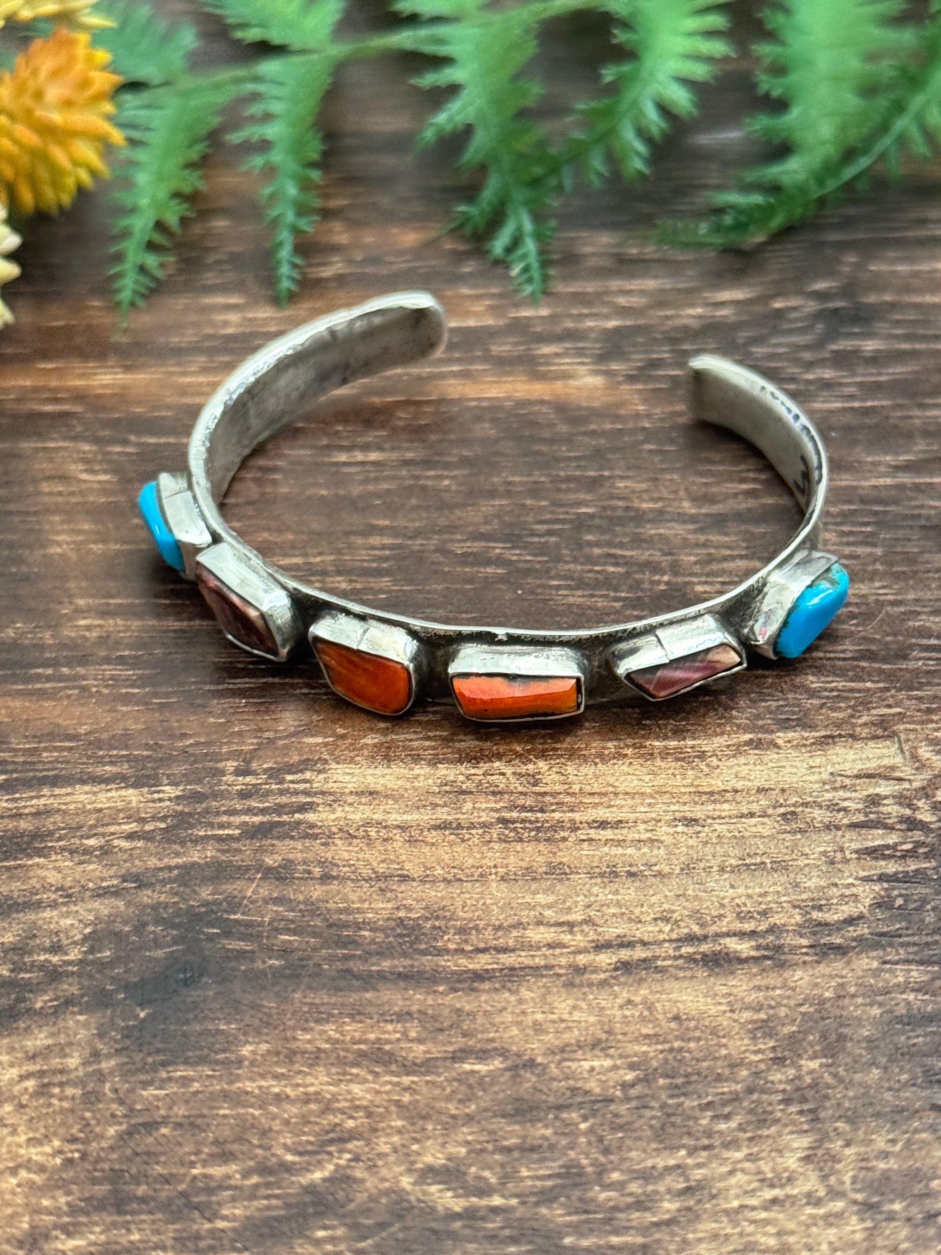 Jude Candalaria Multi Stone & Sterling Silver Cuff Bracelet. It measures 3/8 of an inch wide with an inside circumference of 5 3/8 inches and a gap of 1 1/8 inches. Signed by artist and stamped sterling silver.