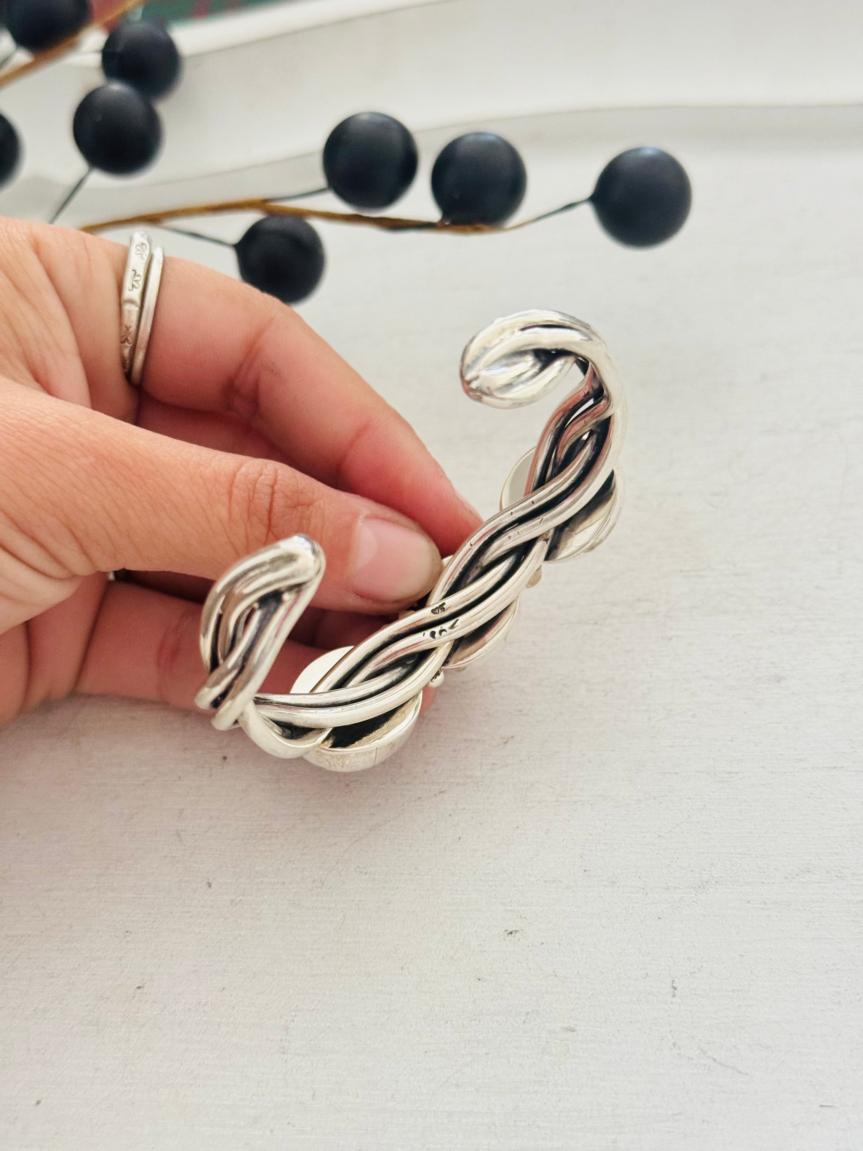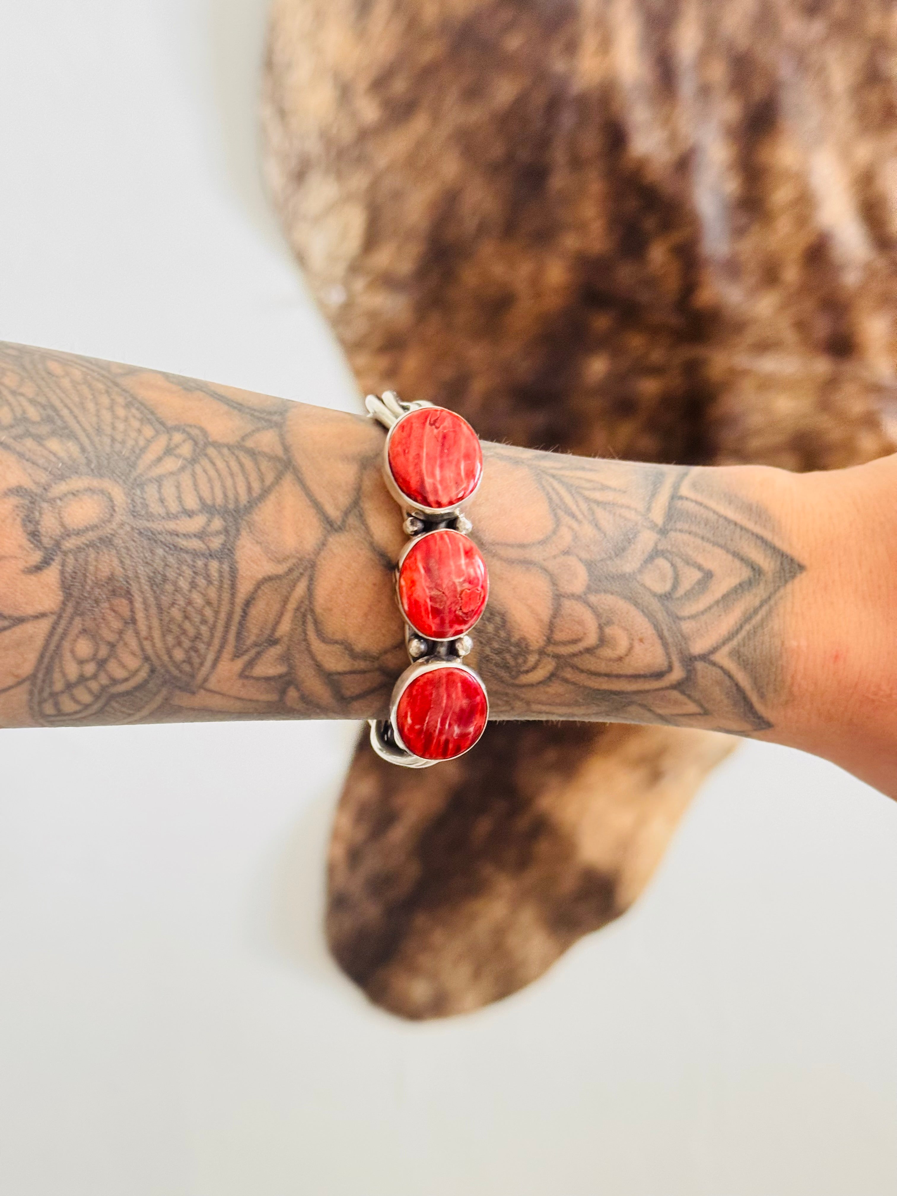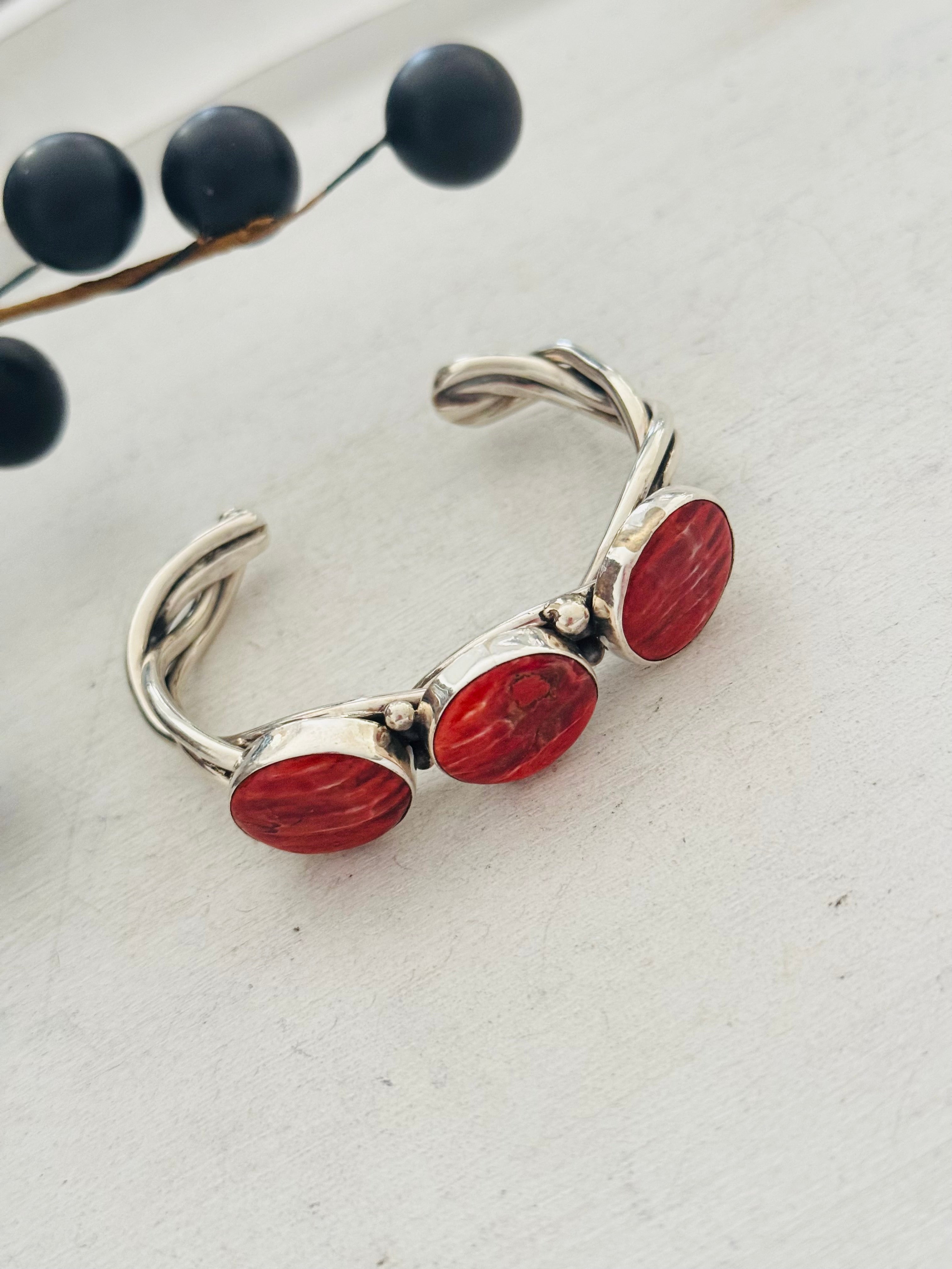 Virginia Sandoval Spiny Oyster & Sterling Silver Cuff Bracelet. It measures 1/2 of an inch wide with an inside circumference of 5 1/4 inches and a gap 1 inch. Signed by the artist and stamped sterling silver.