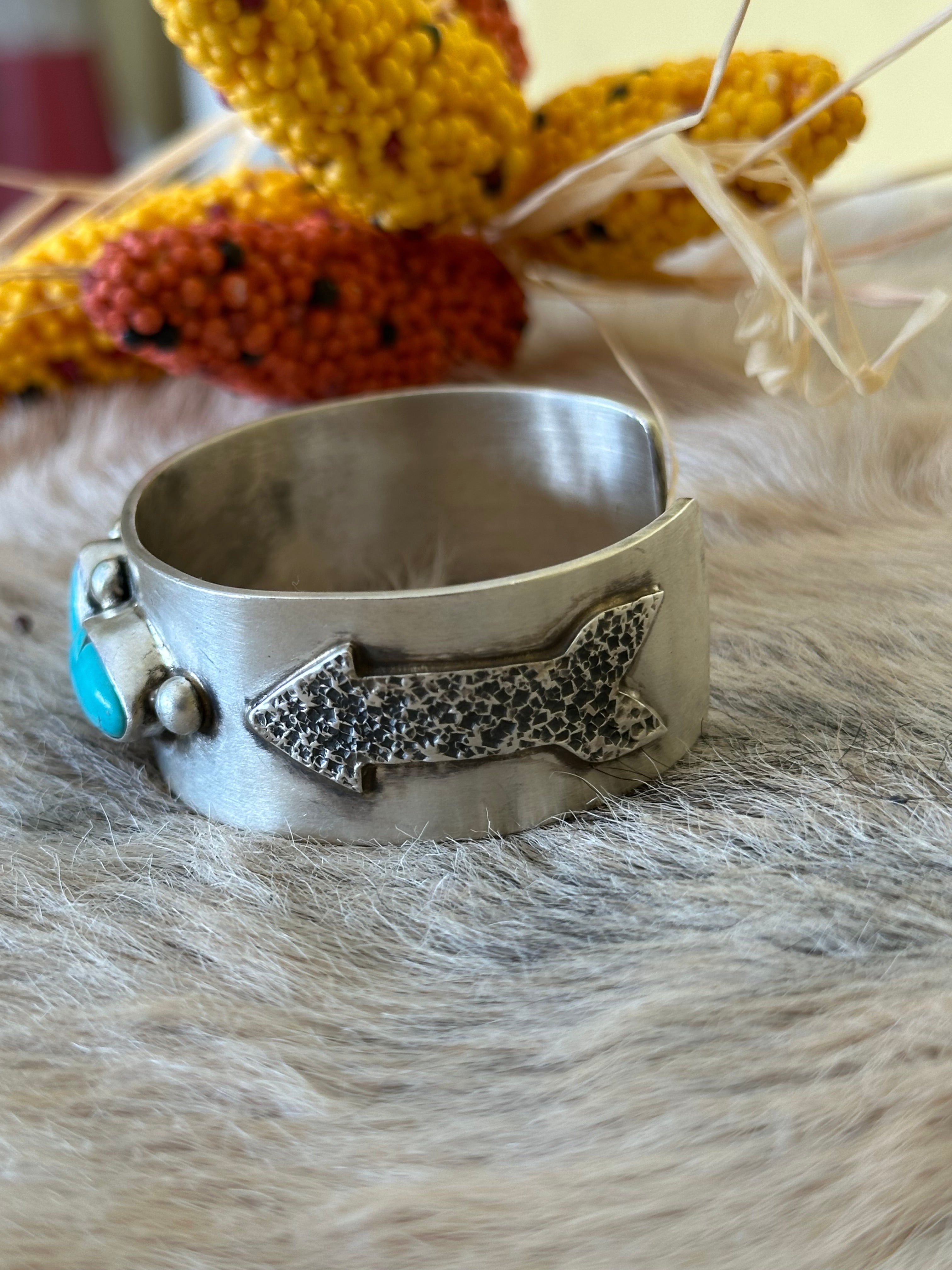 Kathleen Livingston Kingman Turquoise & Sterling Silver Cuff Bracelet. It measures 7/8 of an inch wide with an inside circumference of 5 3/4 inches and a gap of 7/8 of an inch. Signed by artist and stamped sterling silver.