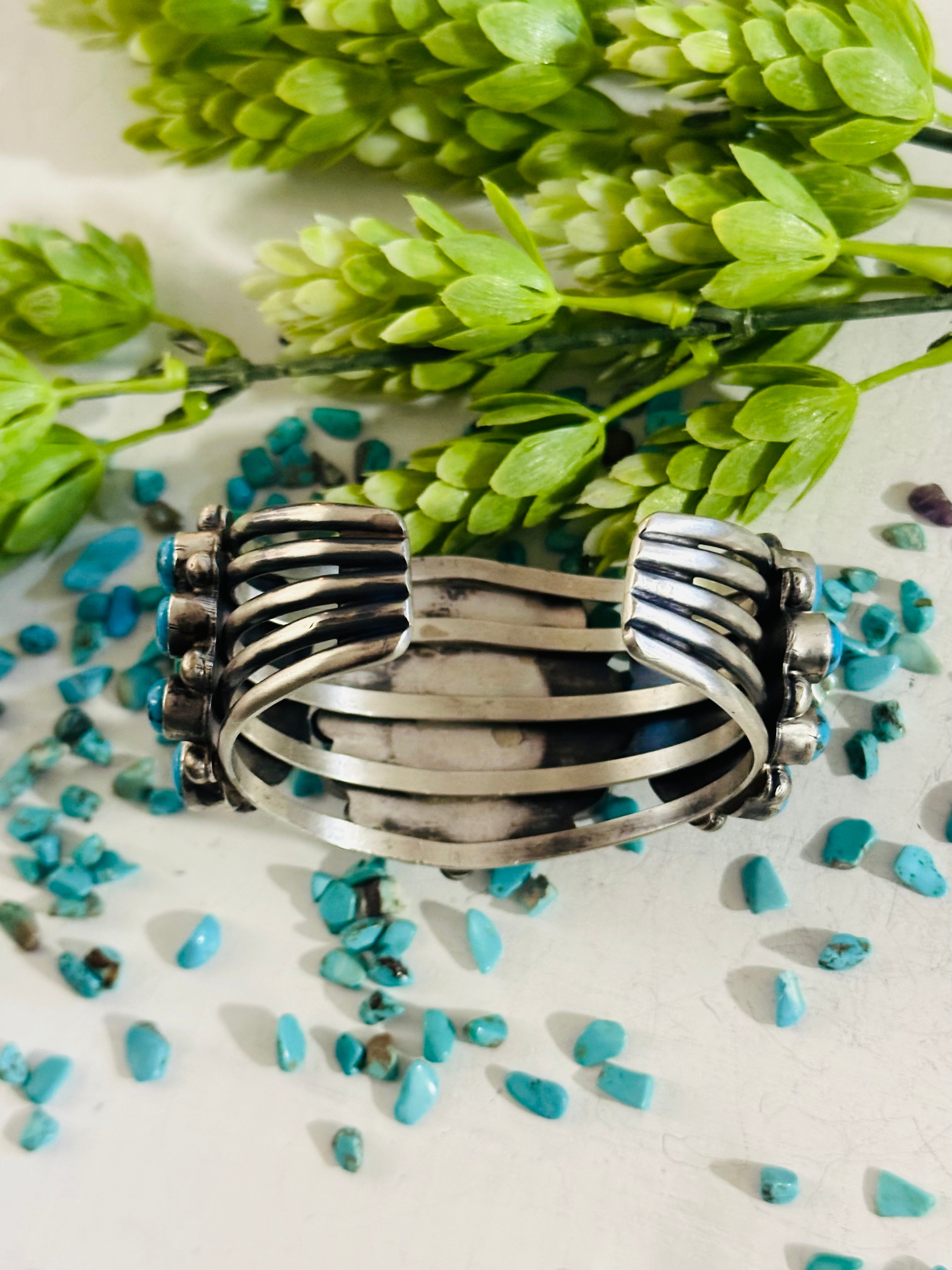 Kathleen Livingston Multi Turquoise & Sterling Silver Cuff Bracelet. It measures 1 5/8 inches wide with an inside circumference of 5 3/4 inches and a gap of 7/8 of an inch. Signed by artist and stamped sterling silver.