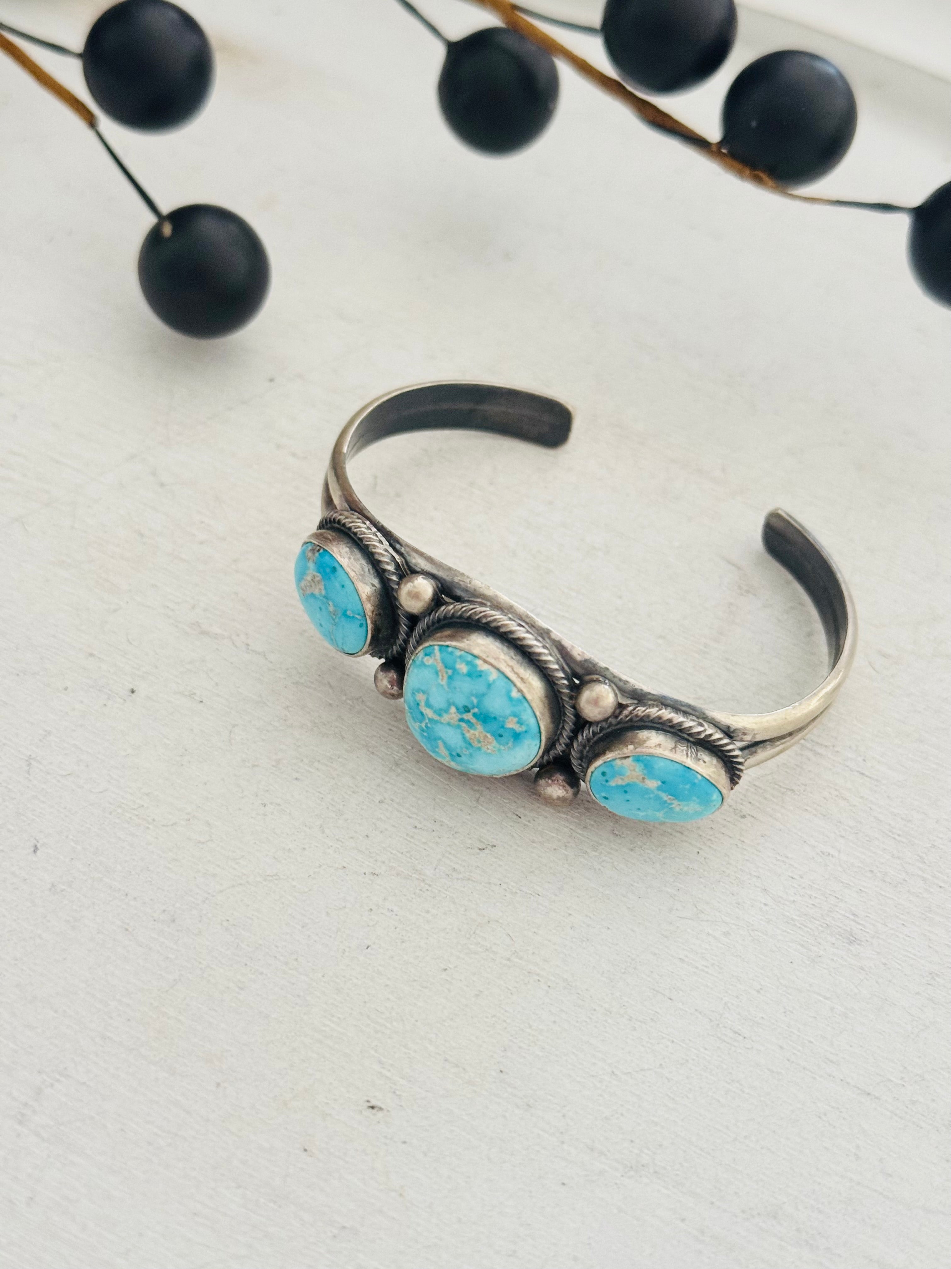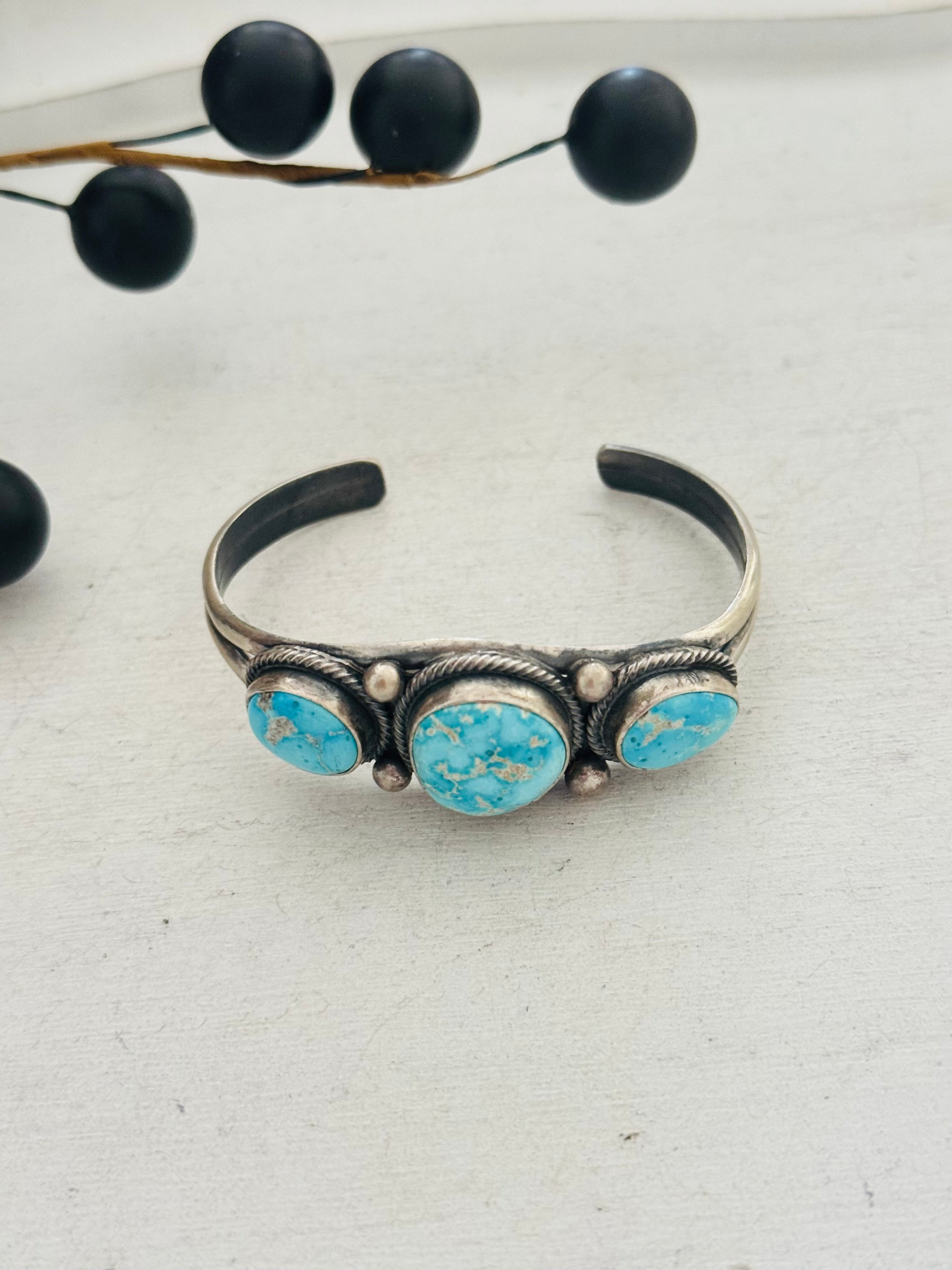 Kathleen Livingston Blue Ridge Turquoise & Sterling Silver Cuff Bracelet. It measures 7/8 of an inch wide with an inside circumference of 5 5/8 inches and a gap of 1 inch. Signed by artist and stamped sterling silver.