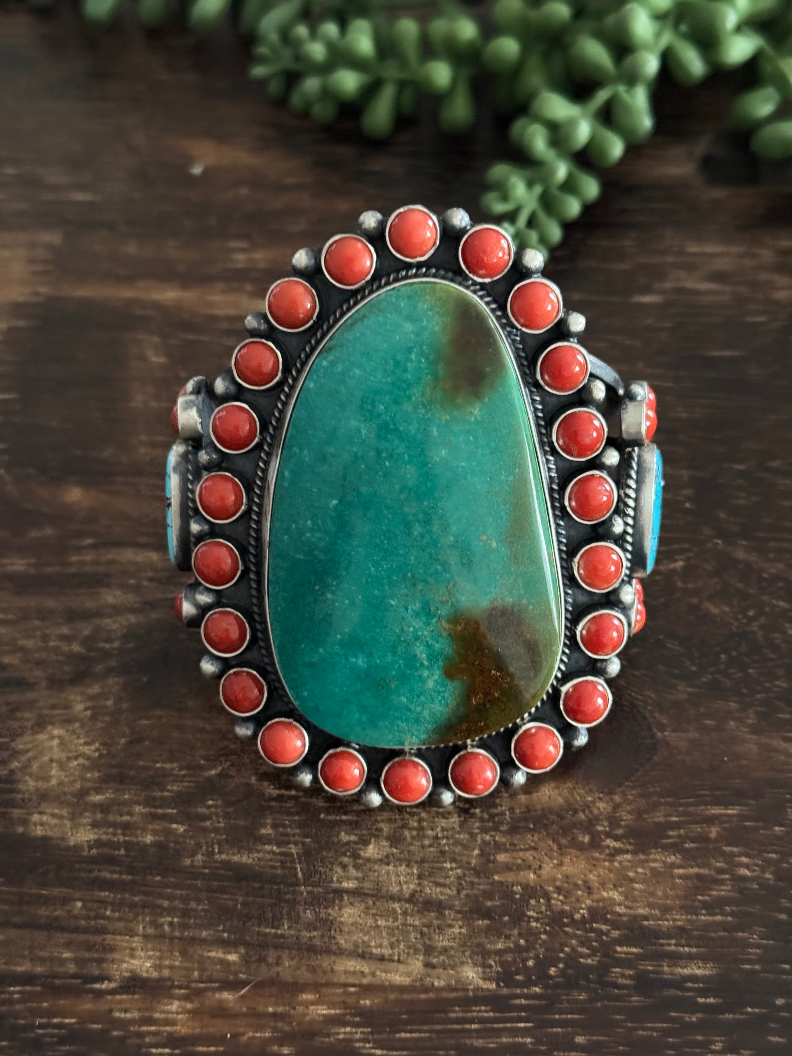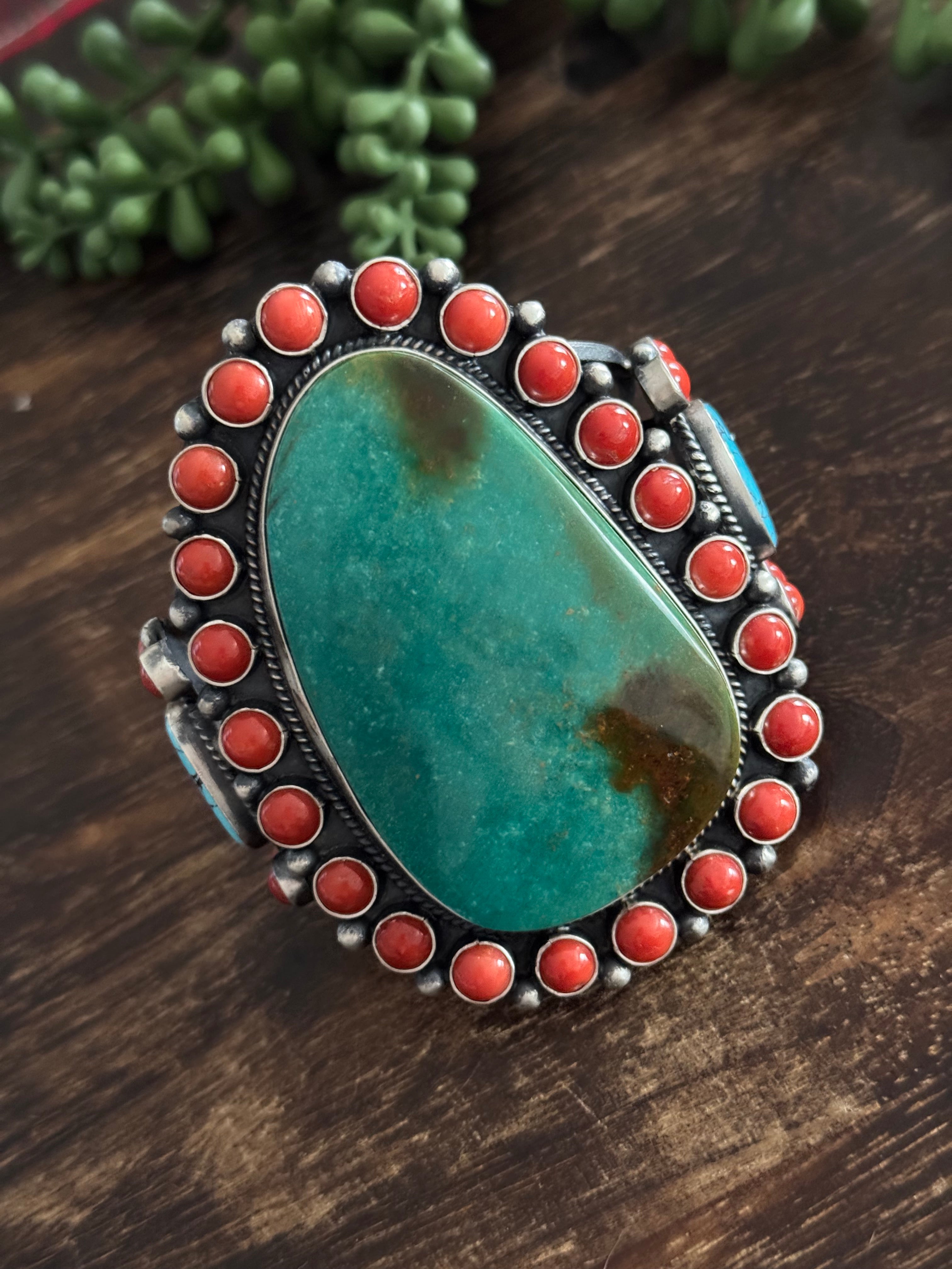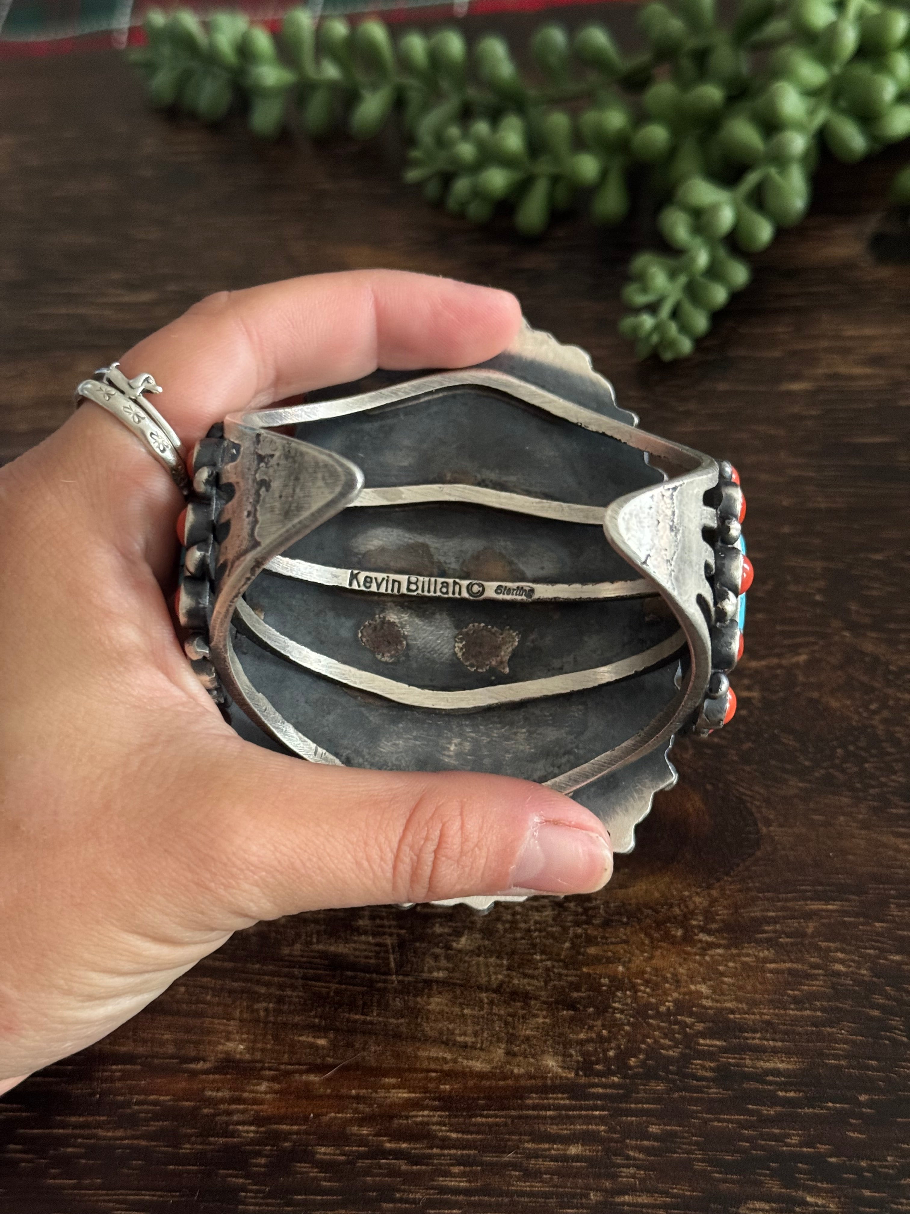 Kevin Billah Multi Stone & Sterling Silver Cluster Cuff Bracelet. It measures 2 5/8 inches wide with an inside circumference of 5 5/8 inches and a gap of 1 1/4 inches. Signed by artist and stamped sterling silver.