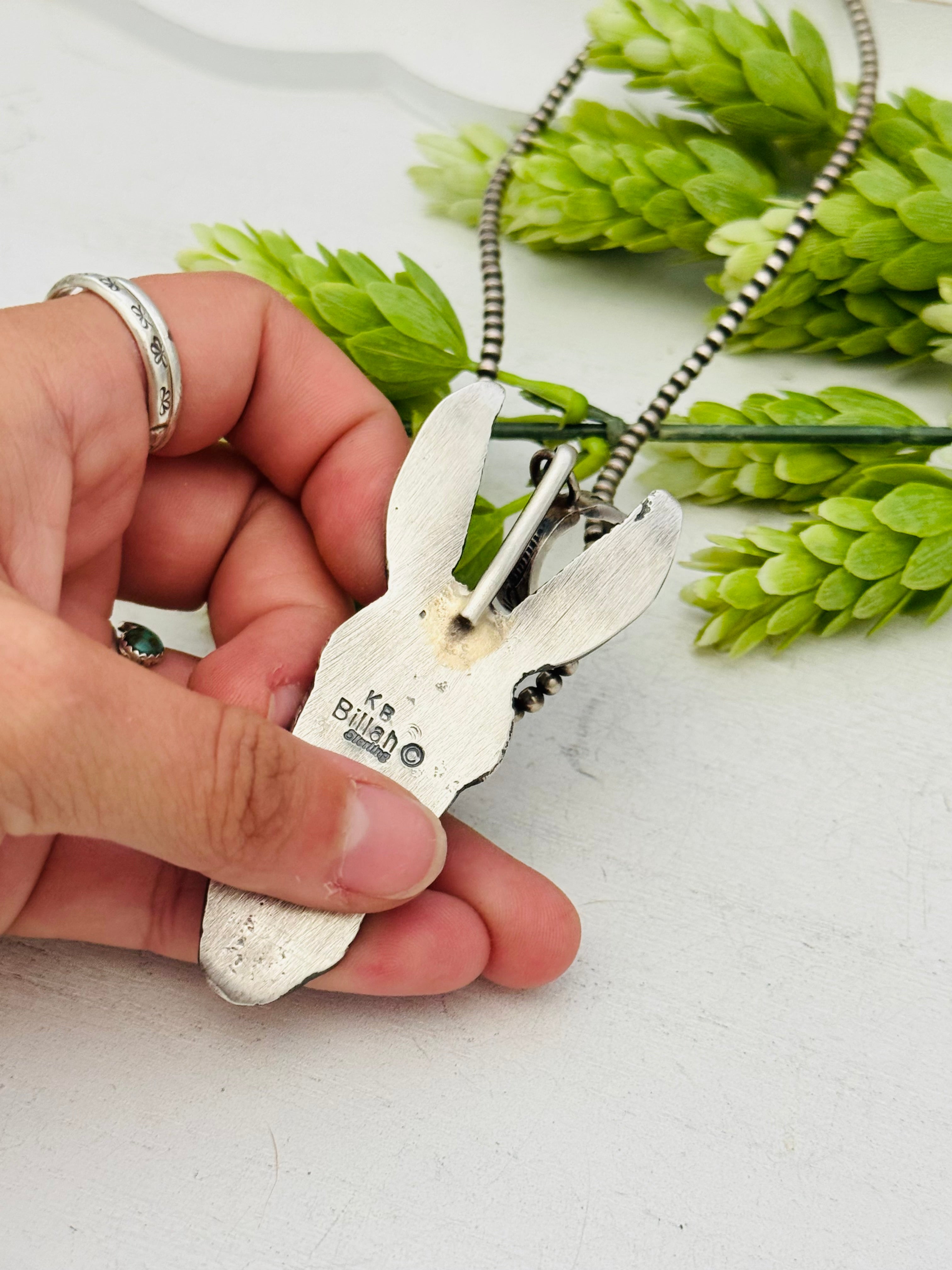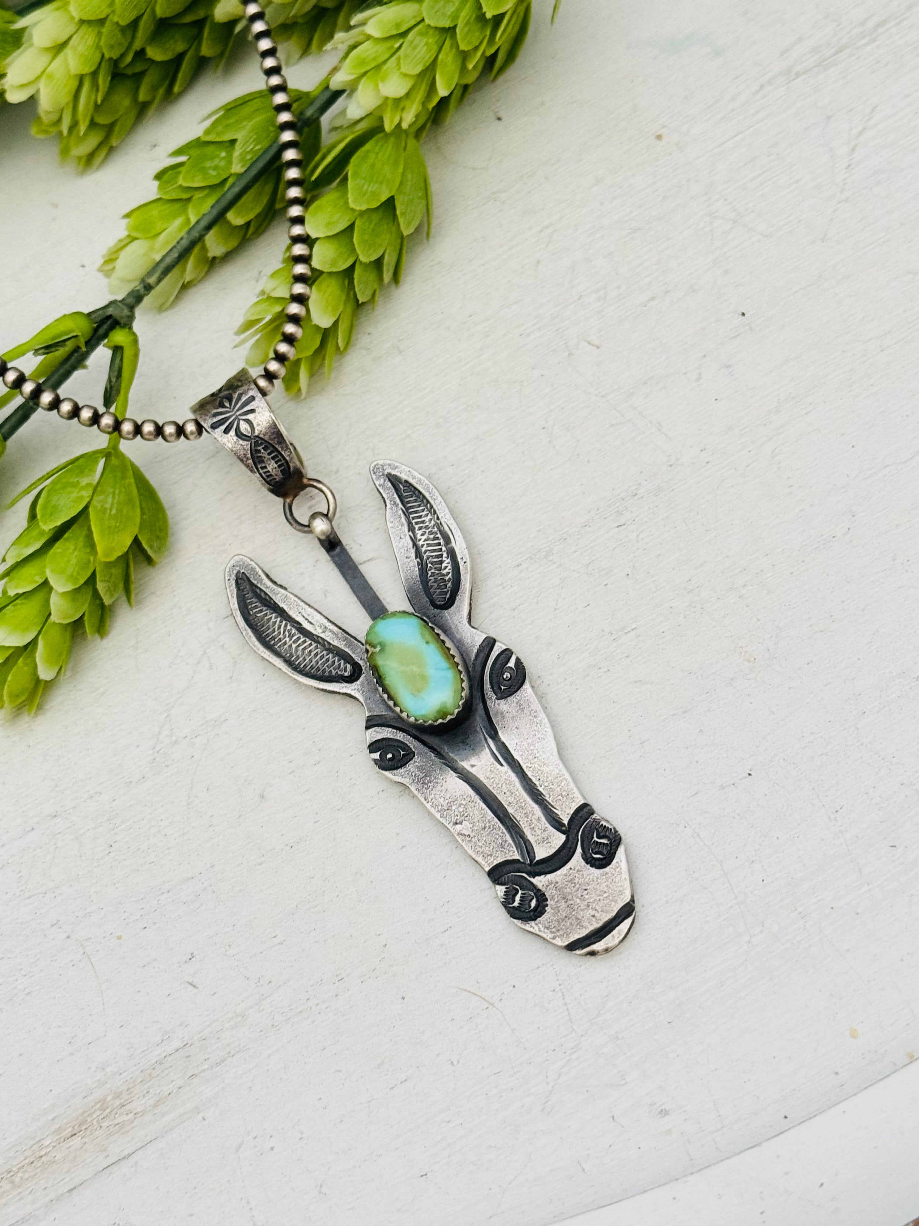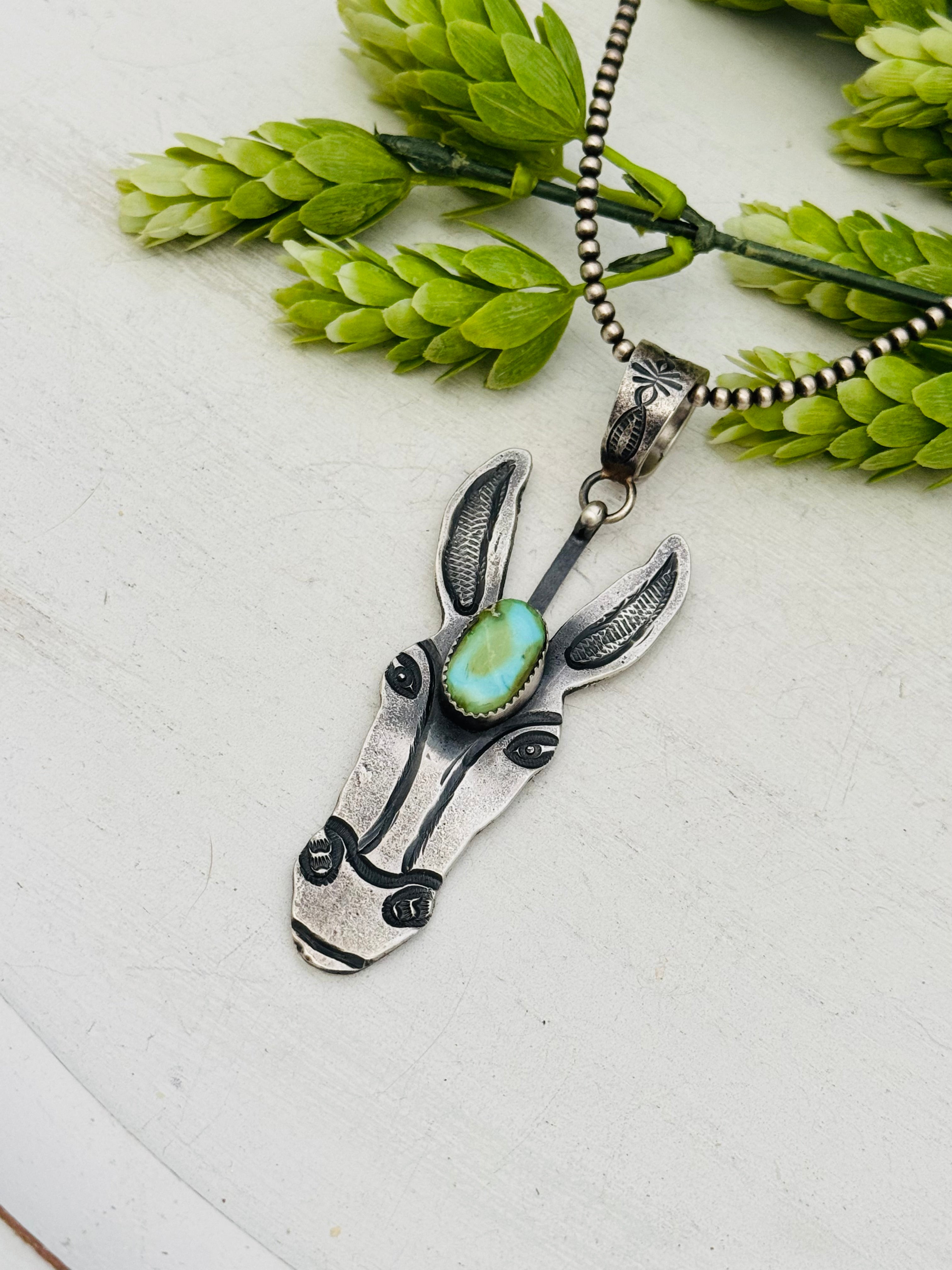 Kindale Billah Sonoran Mountain Turquoise & Sterling Silver Mule Pendant. It measures 3 3/4 inches long and 1 3/8 inches wide. Pendant Only!! Signed by the artist and stamped sterling silver.
