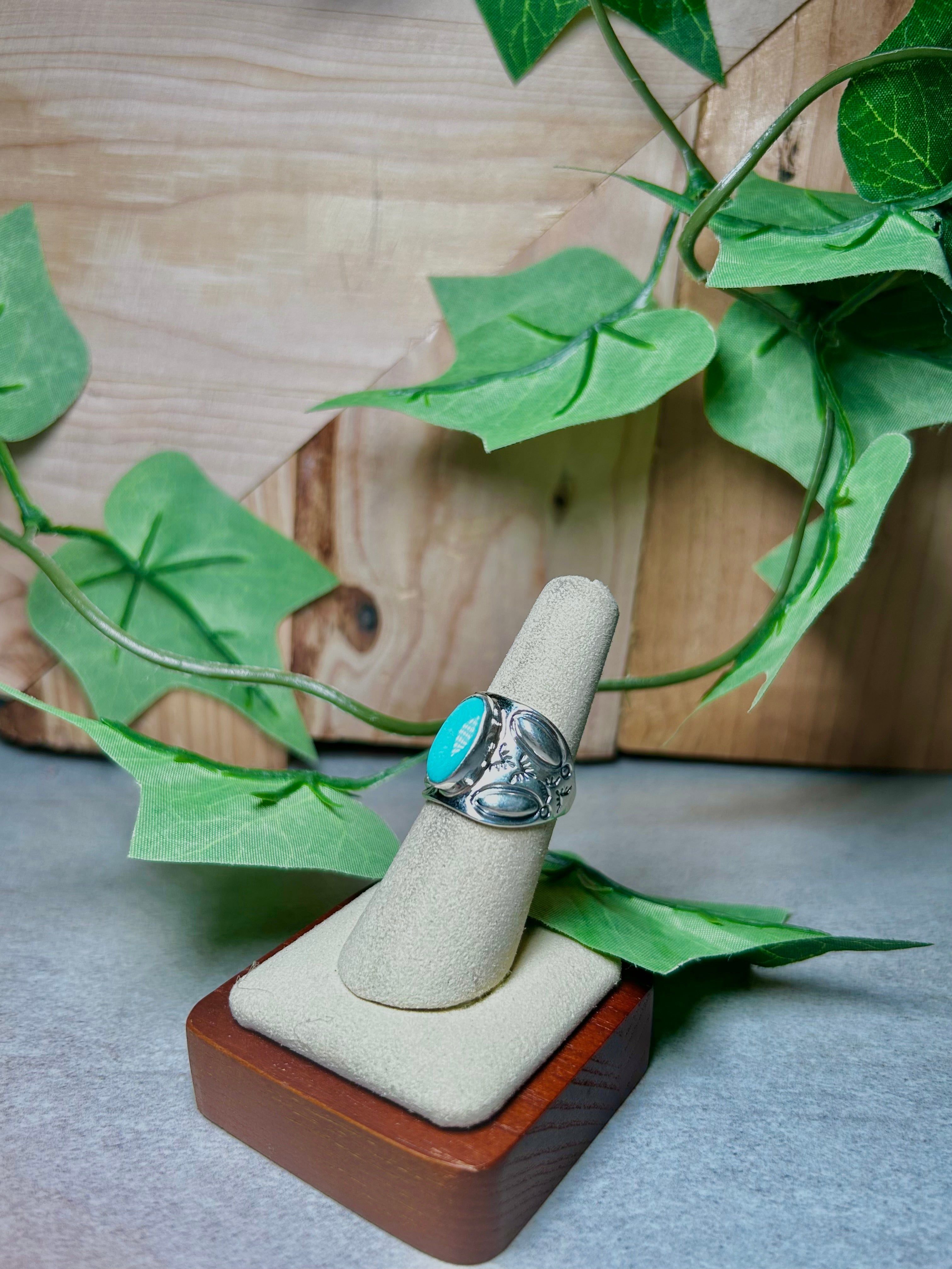 Kobe Martinez Kingman Turquoise & Sterling Silver Ring Size 7. It measures 5/8 of an inch long and 1/4 of an inch wide. Signed by the artist and stamped sterling silver.