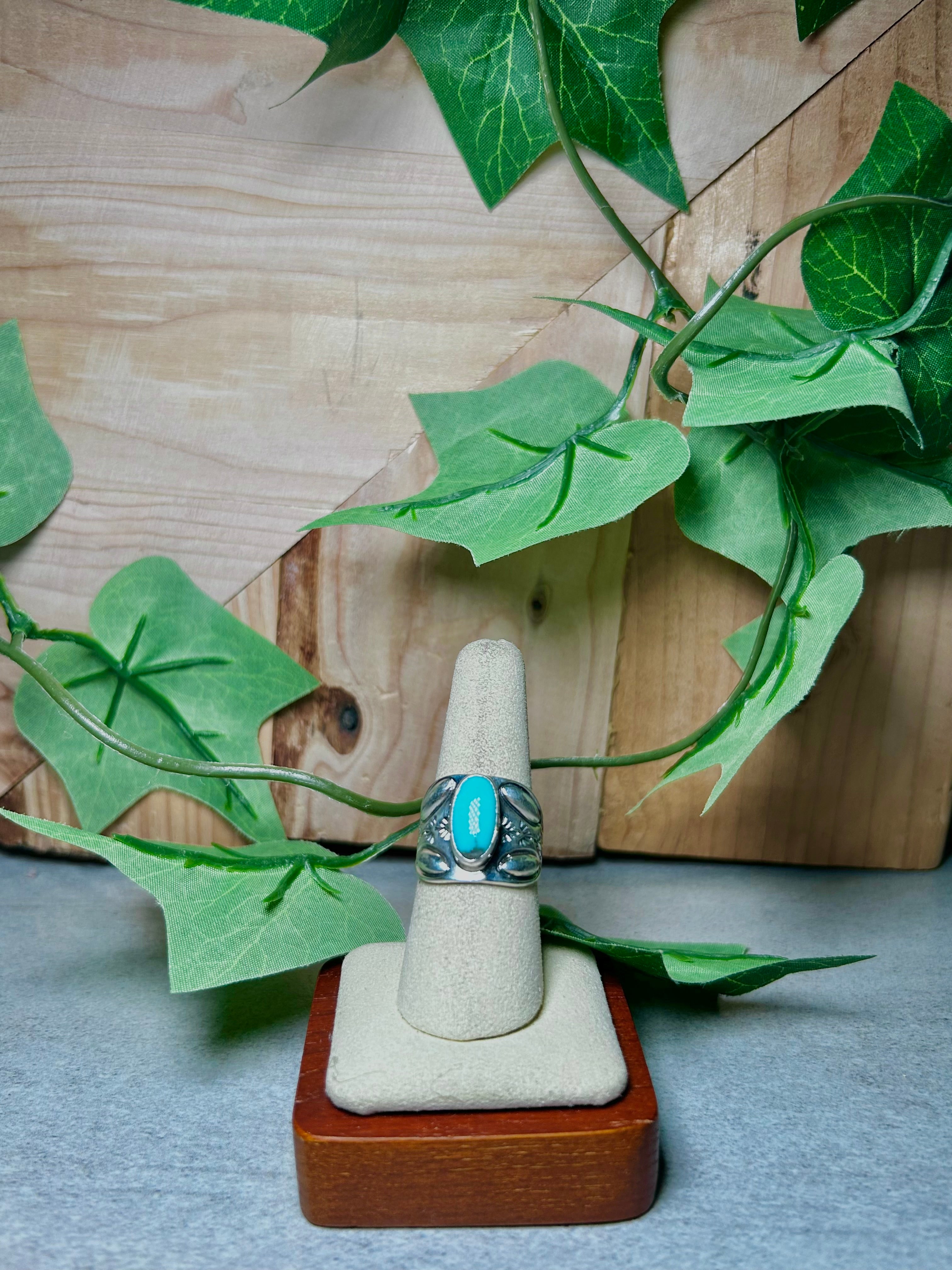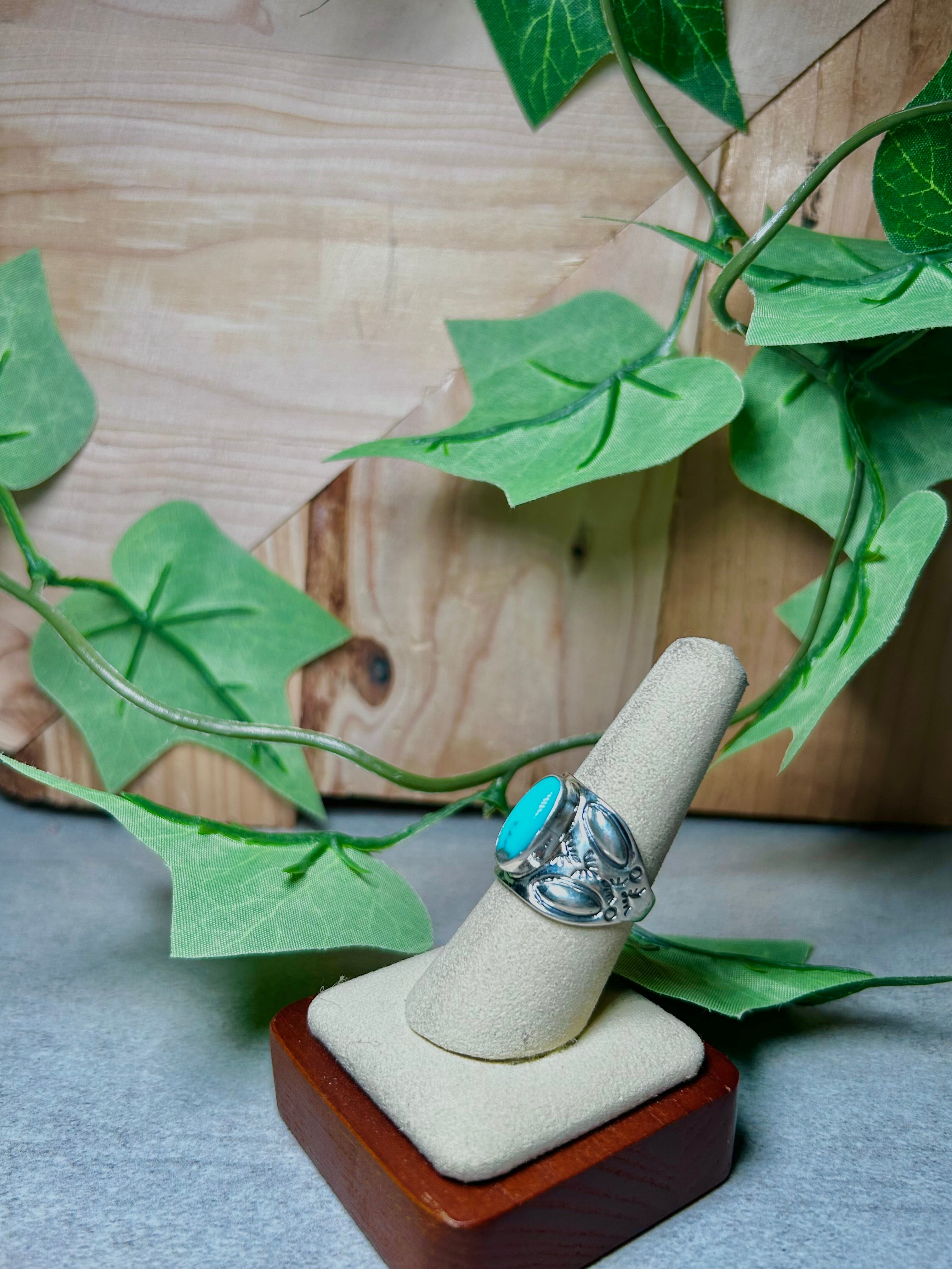 Kobe Martinez Kingman Turquoise & Sterling Silver Ring Size 8. It measures 5/8 of an inch long and 1/4 of an inch wide. Signed by the artist and stamped sterling silver.