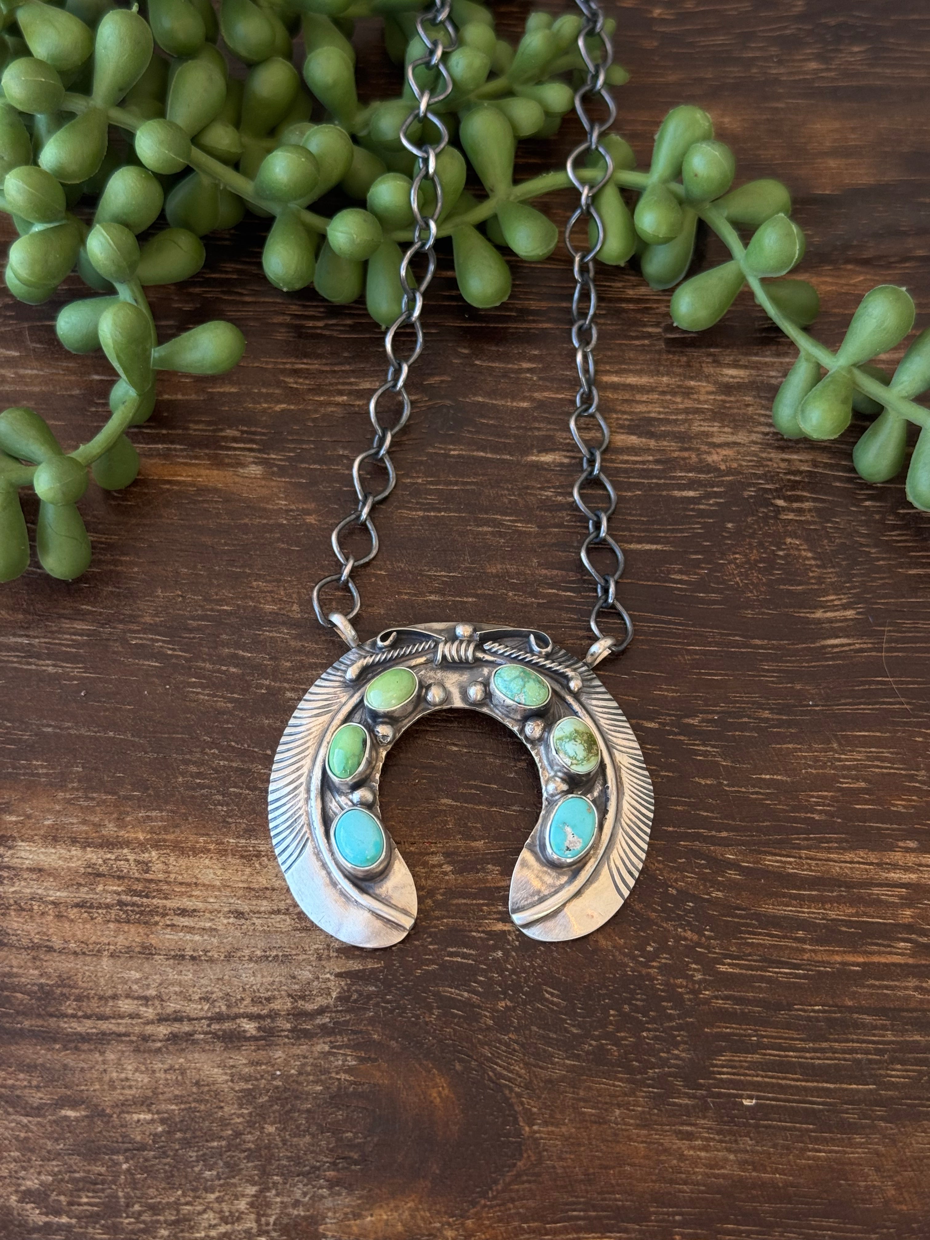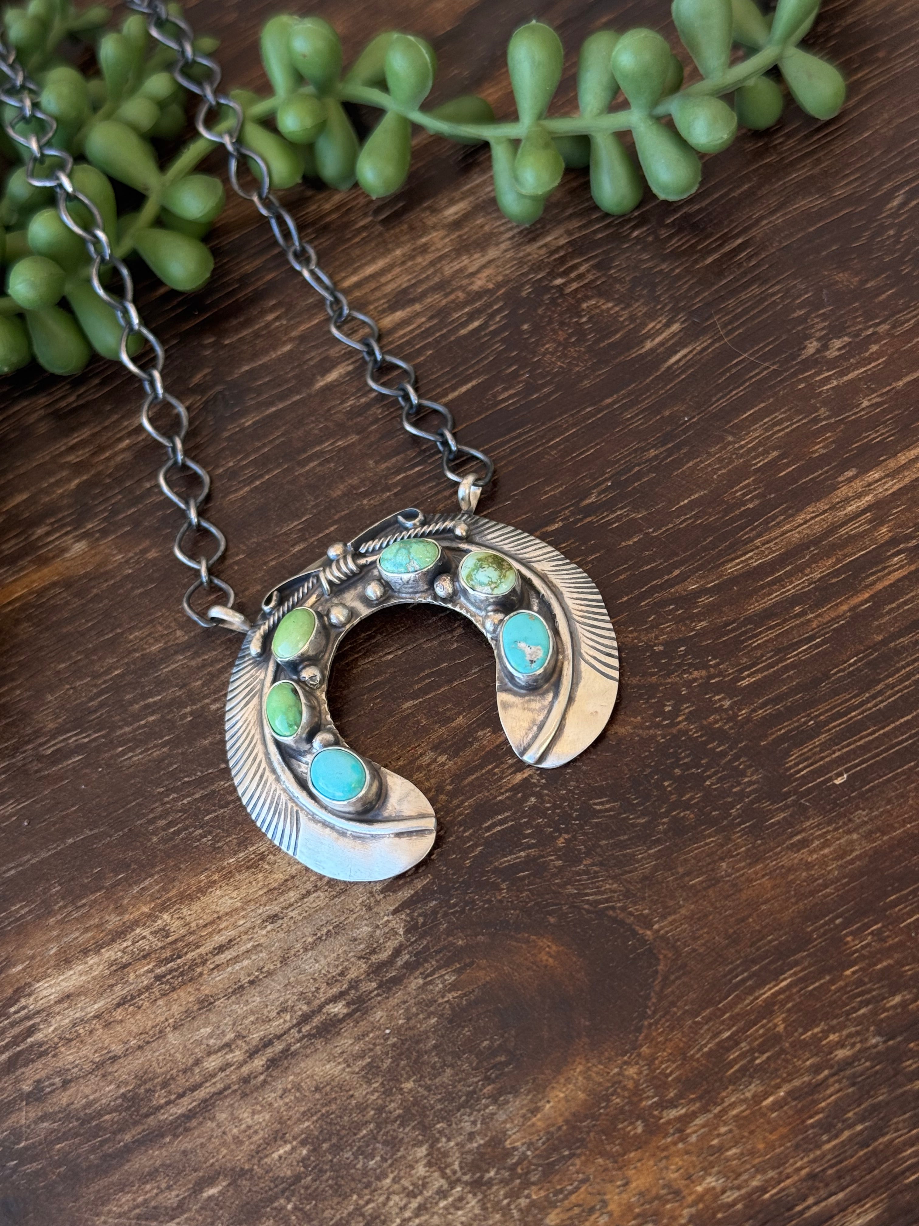 Kobe Martinez Sonoran Mountain Turquoise & Sterling Silver Necklace. The necklaces measures 20 1/2 inches long while the chain by itself measures 17 inches long. Signed by the artist and stamped sterling silver. Stones will vary due to natural stones.