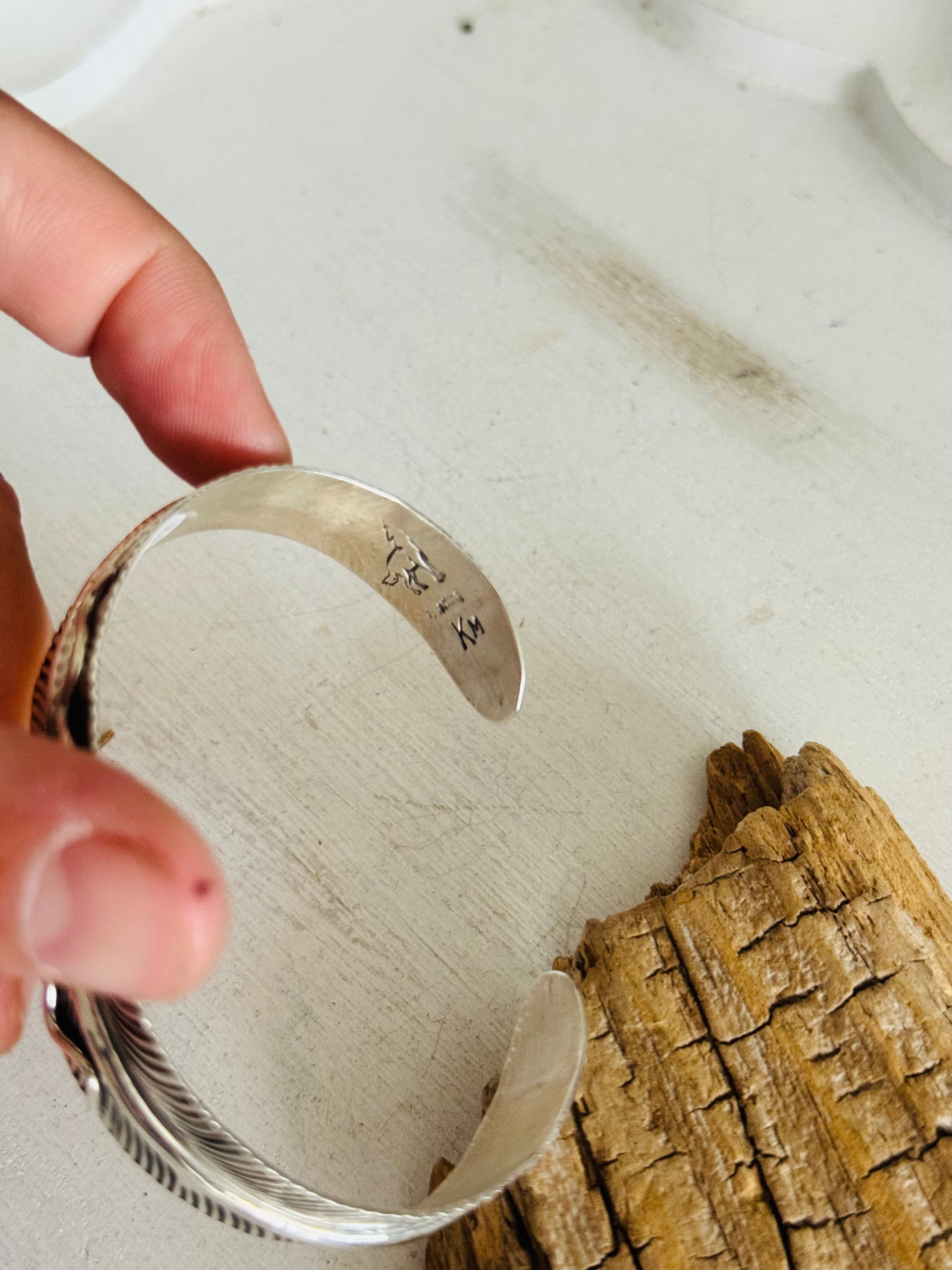 Koby Martinez Sonoran Mountain Turquoise & Sterling Silver Feather Cuff Bracelet. It measures 3/4 of an inch wide with an inside circumference of 5 7/8 inches and a gap of 1 inch. Signed by the artist and stamped sterling silver.