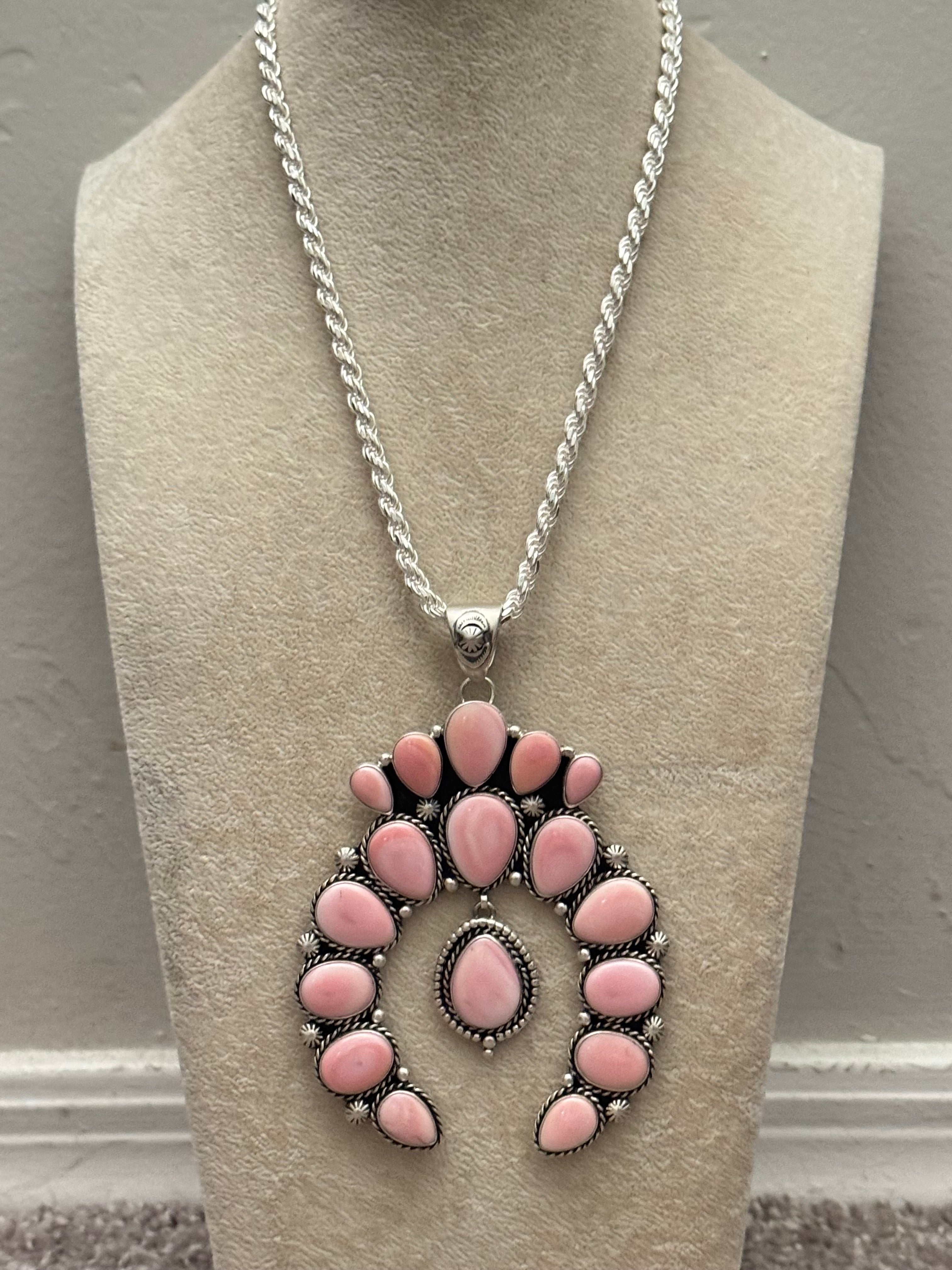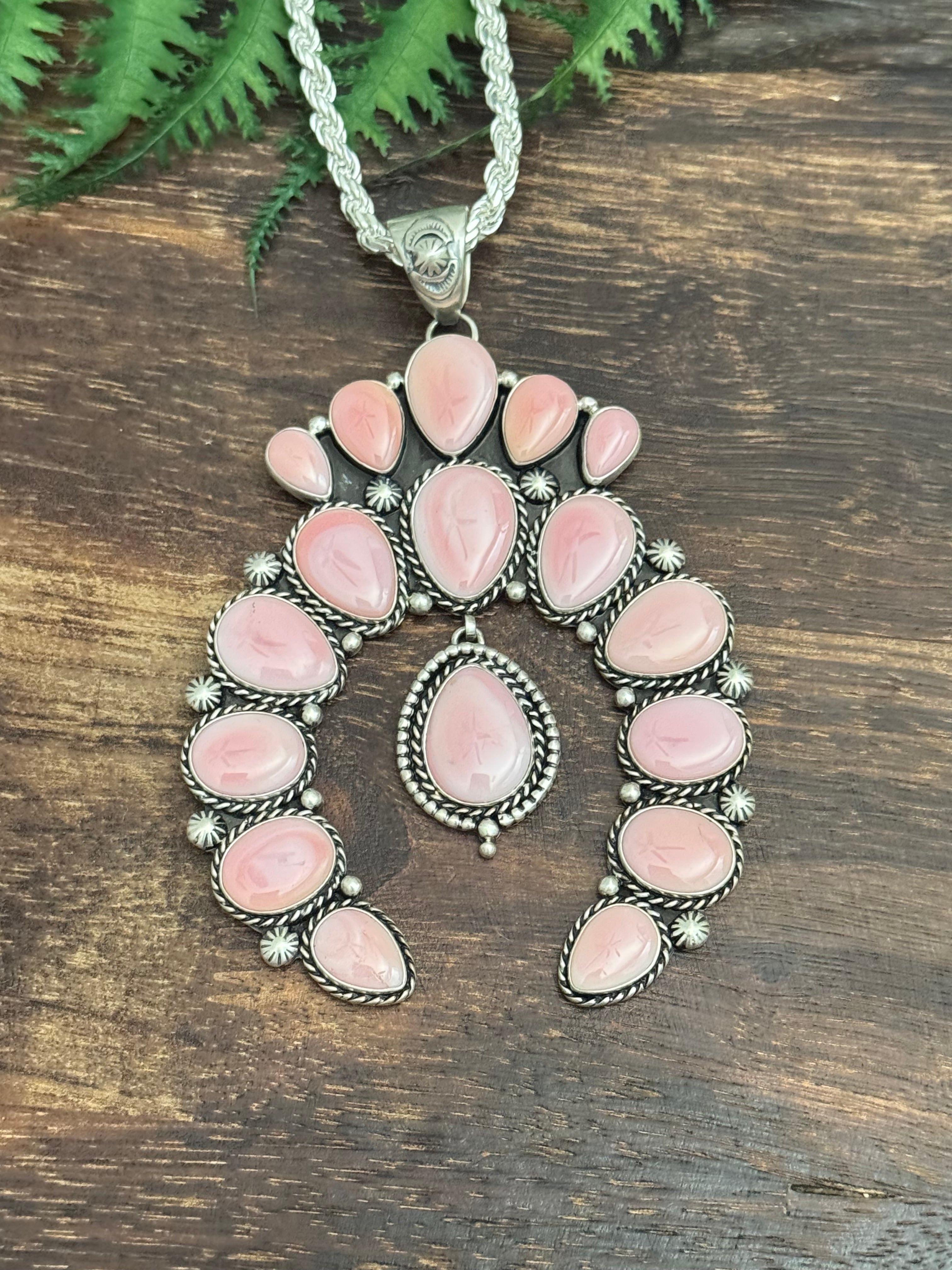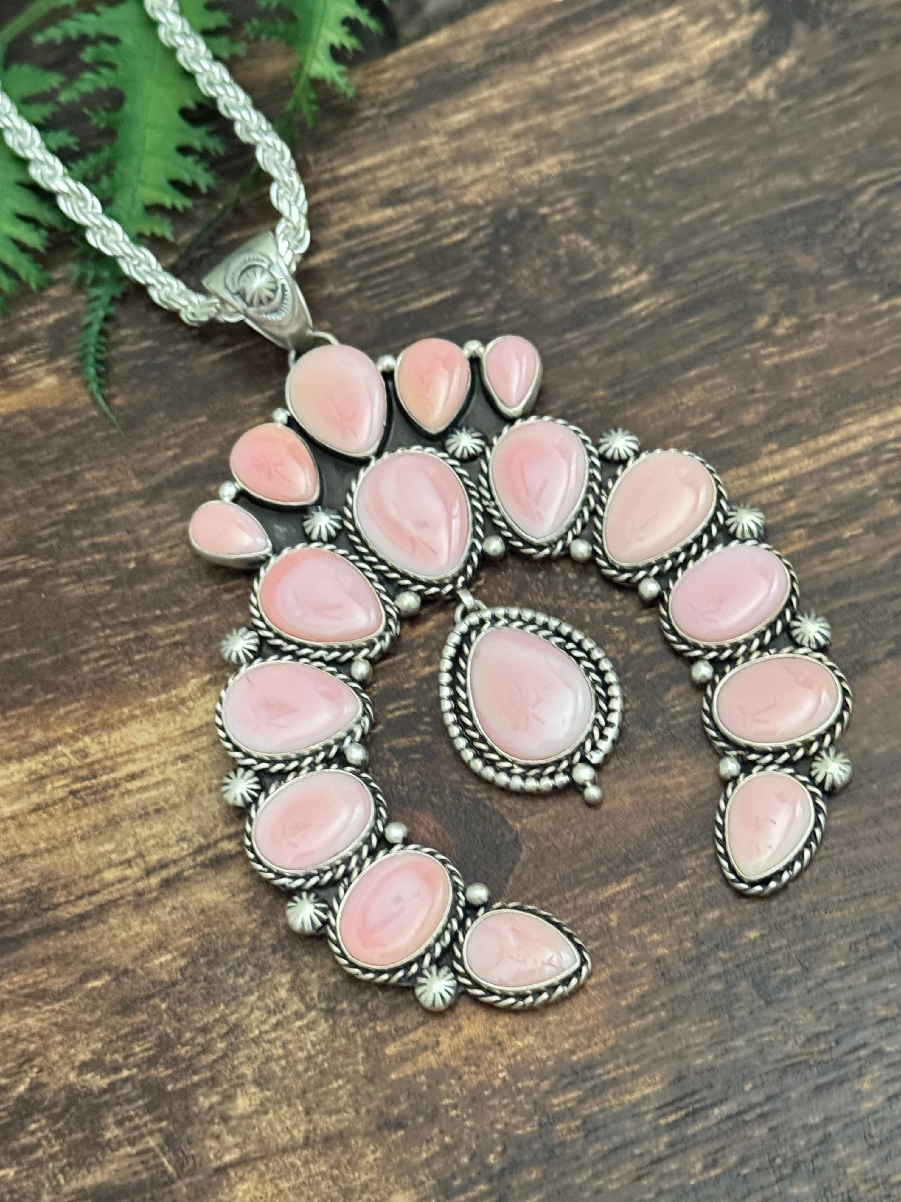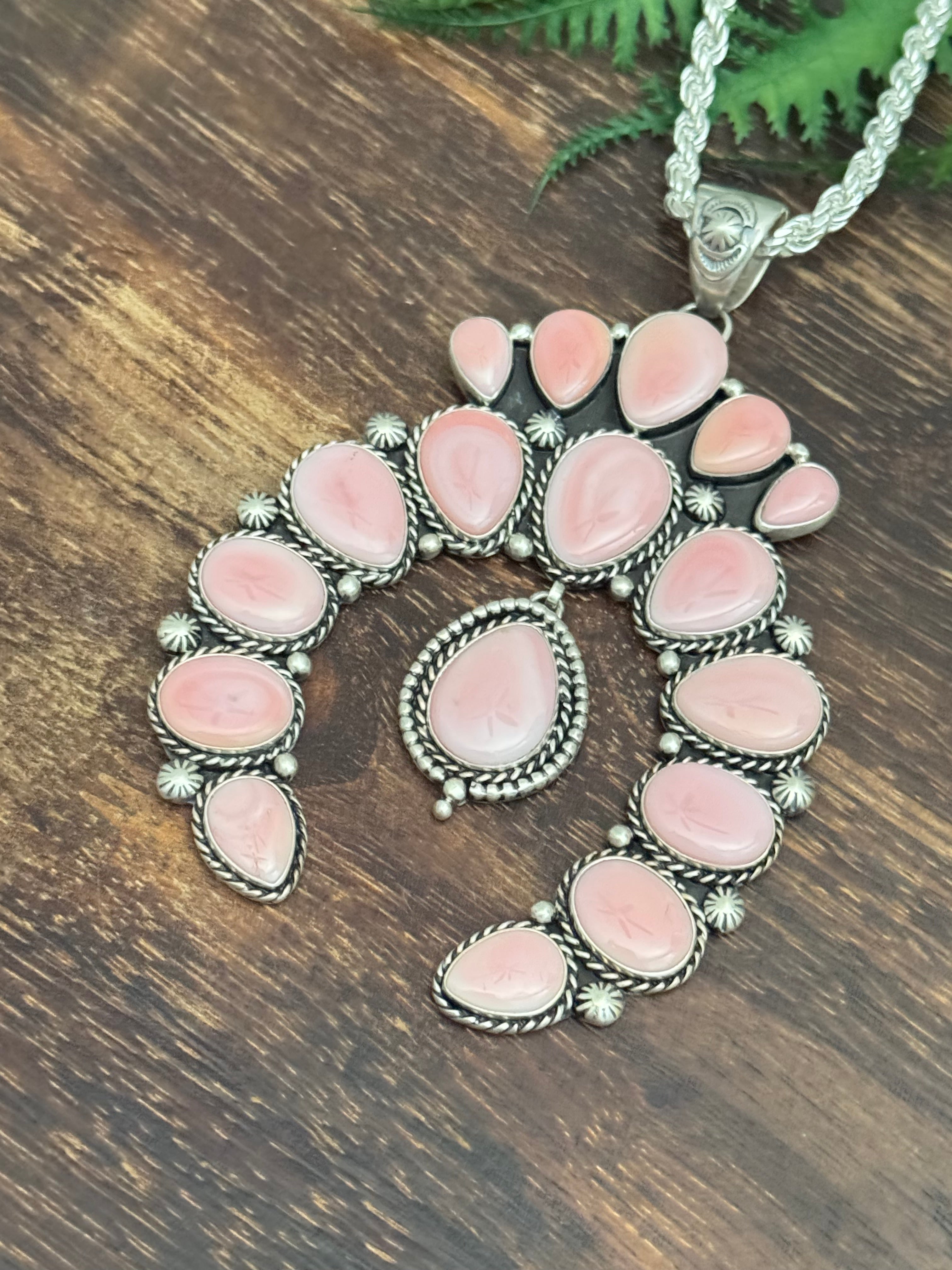 Larry Kaye Pink Conch & Sterling Silver Cluster Naja Pendant. It measures 4 3/8 inches long & 3 1/8 inches wide. Signed by artist and stamped sterling silver. Pendant Only!