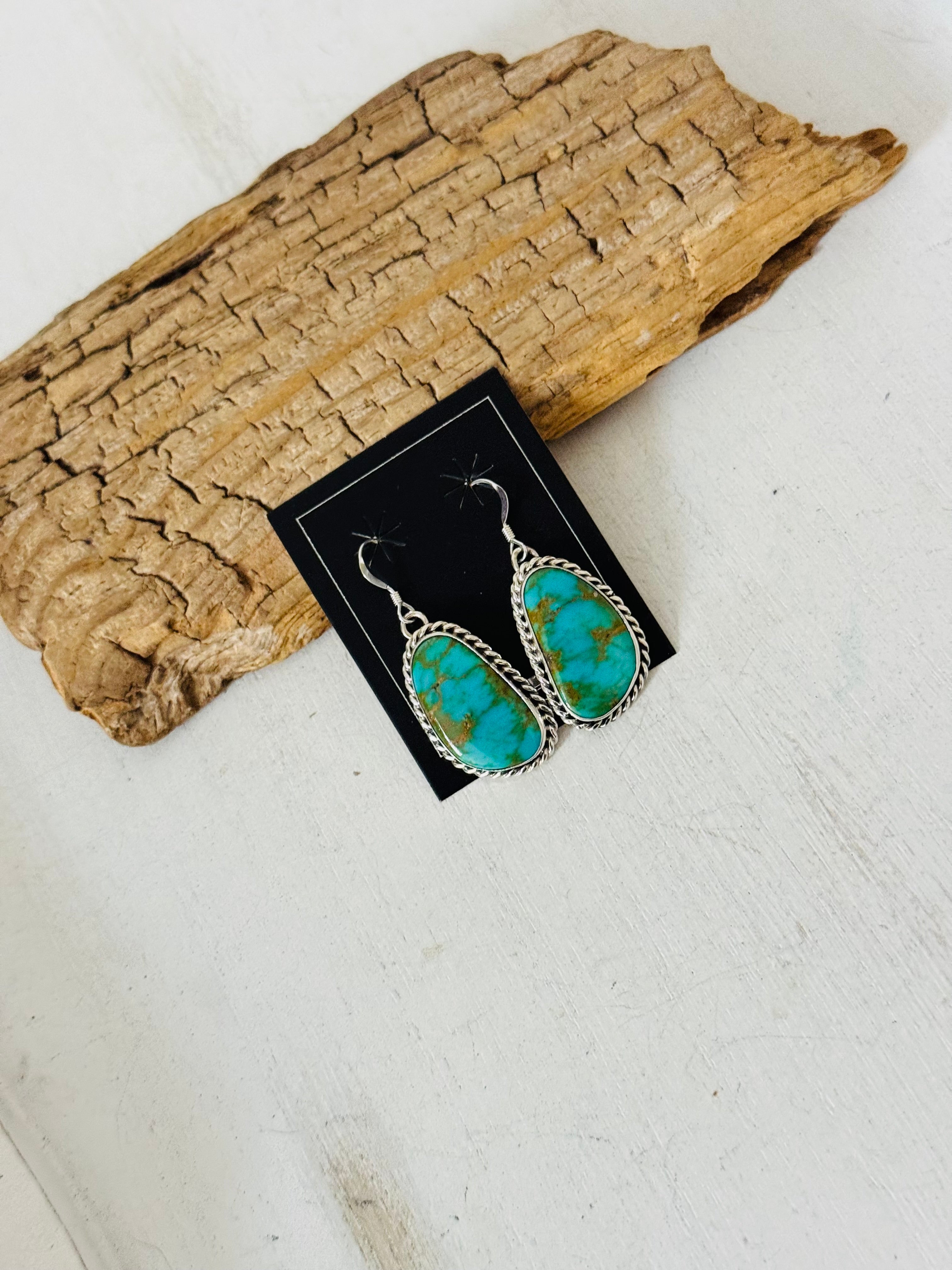 Larry Kaye Kingman Turquoise & Sterling Silver Dangle Earrings. They measure 1 5/8 inches long and 5/8 of an inch wide. Signed by the artist and stamped sterling silver.