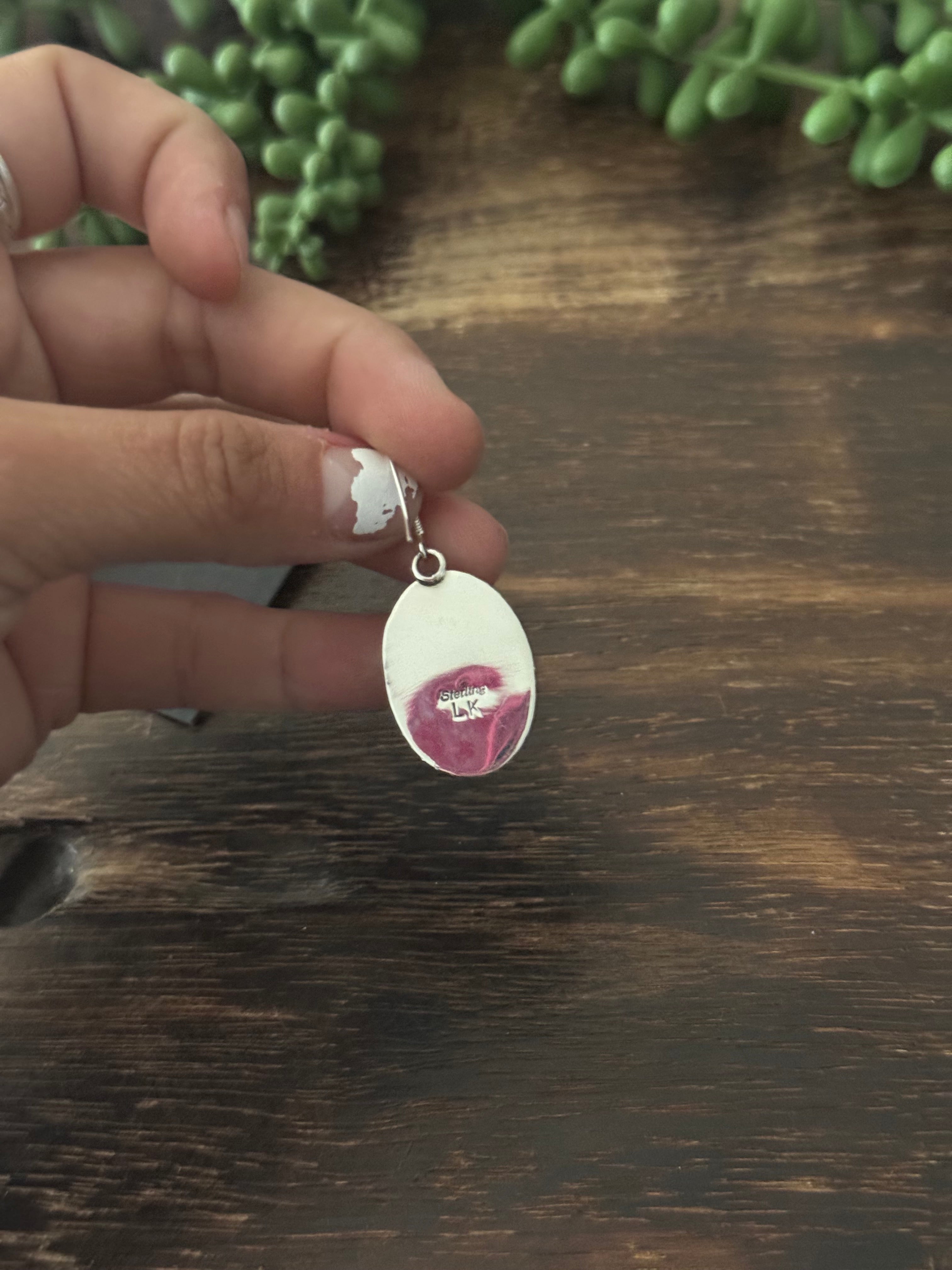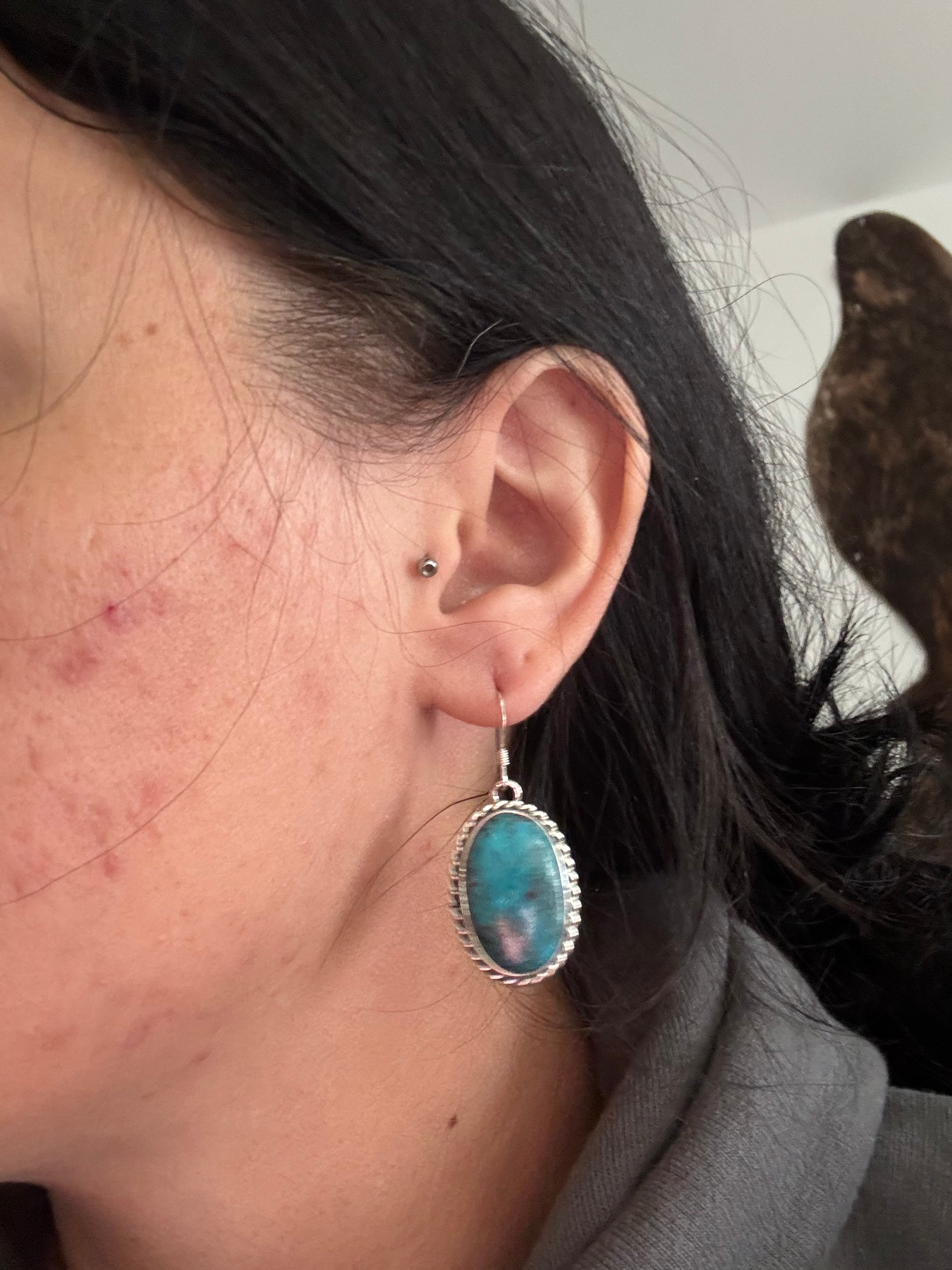 Larry Kaye Kingman Turquoise & Sterling Silver Dangle Earrings. They measure 1 5/8 inches long and 3/4 of an inch wide. Signed by the artist and stamped sterling silver.
