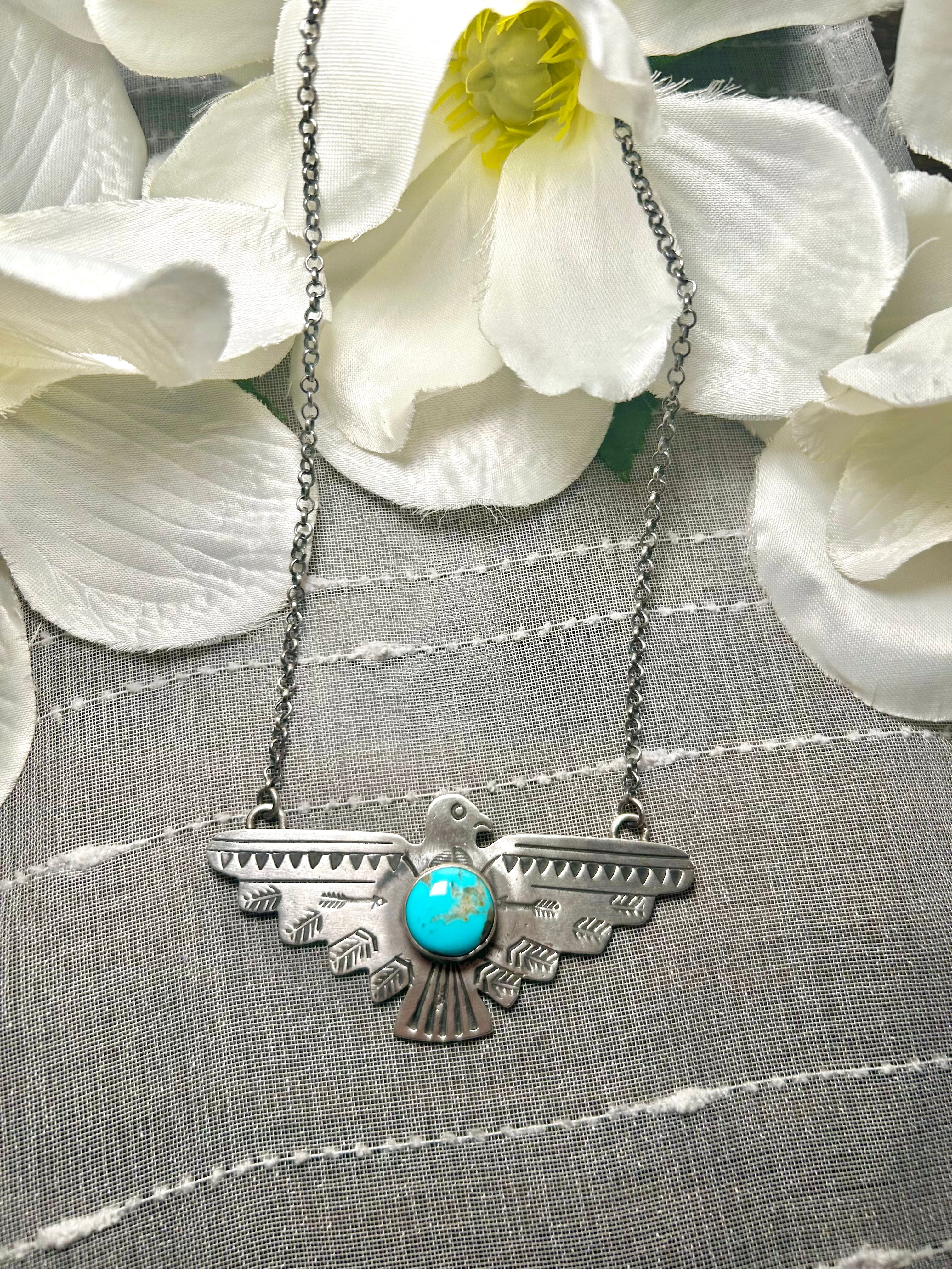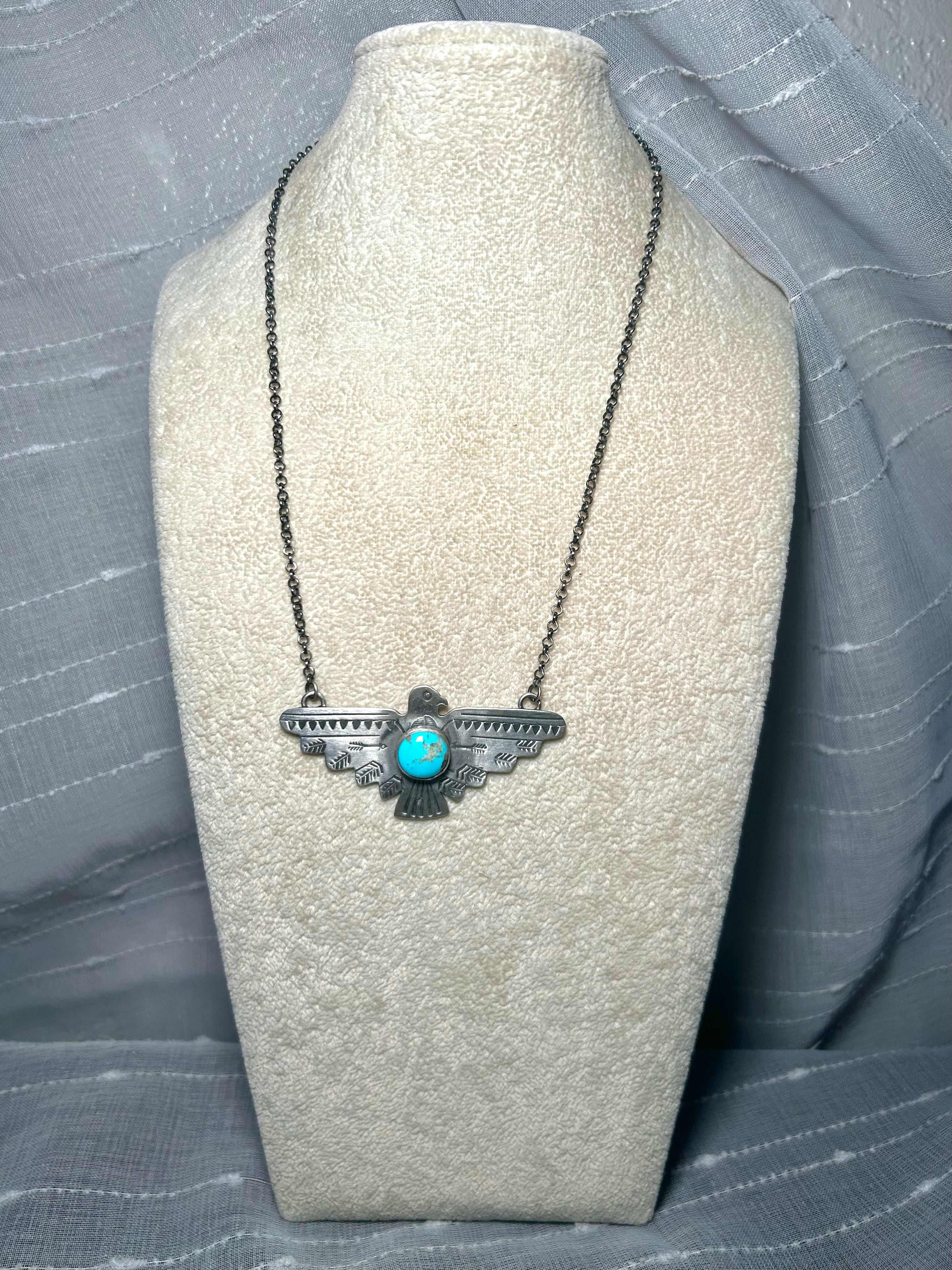 Russell Sam Royston Turquoise & Sterling Silver Necklace. It measures 21 inches long with hang while the chain measures 19 inches long. Signed by the artist and stamped sterling silver.