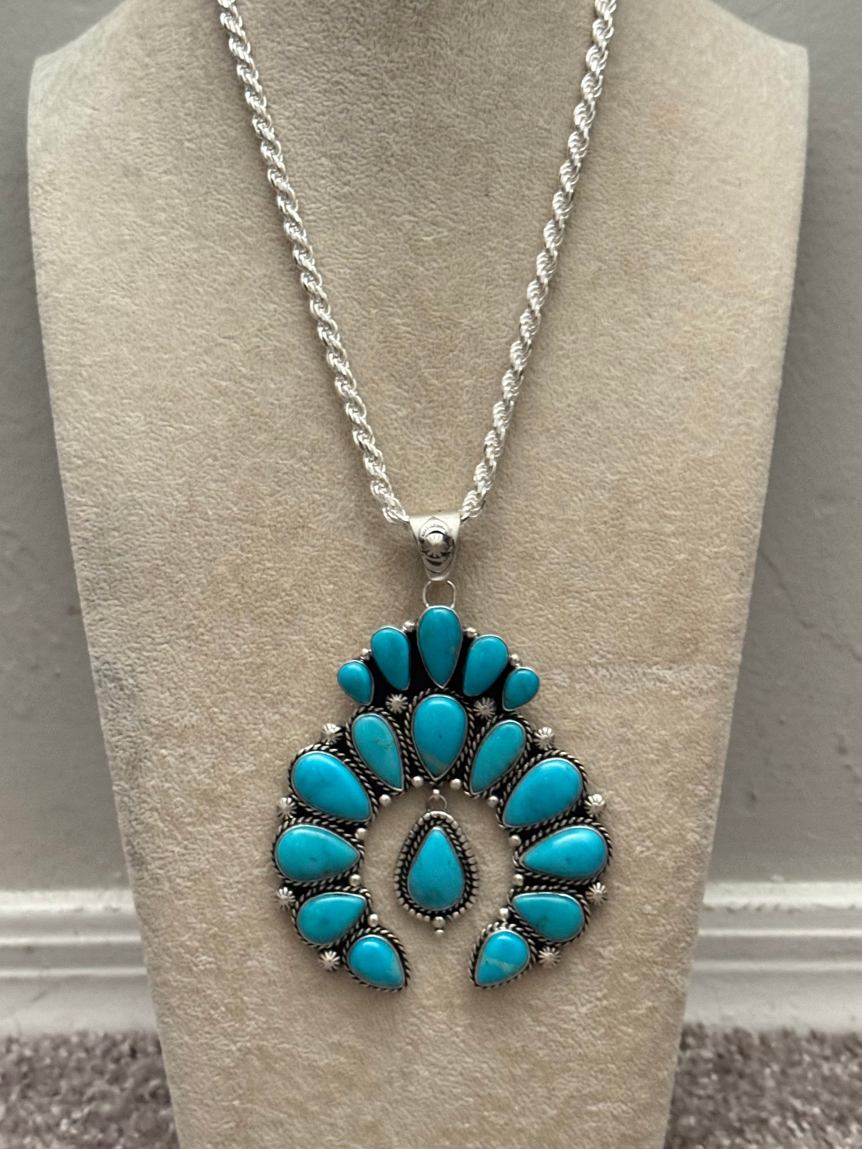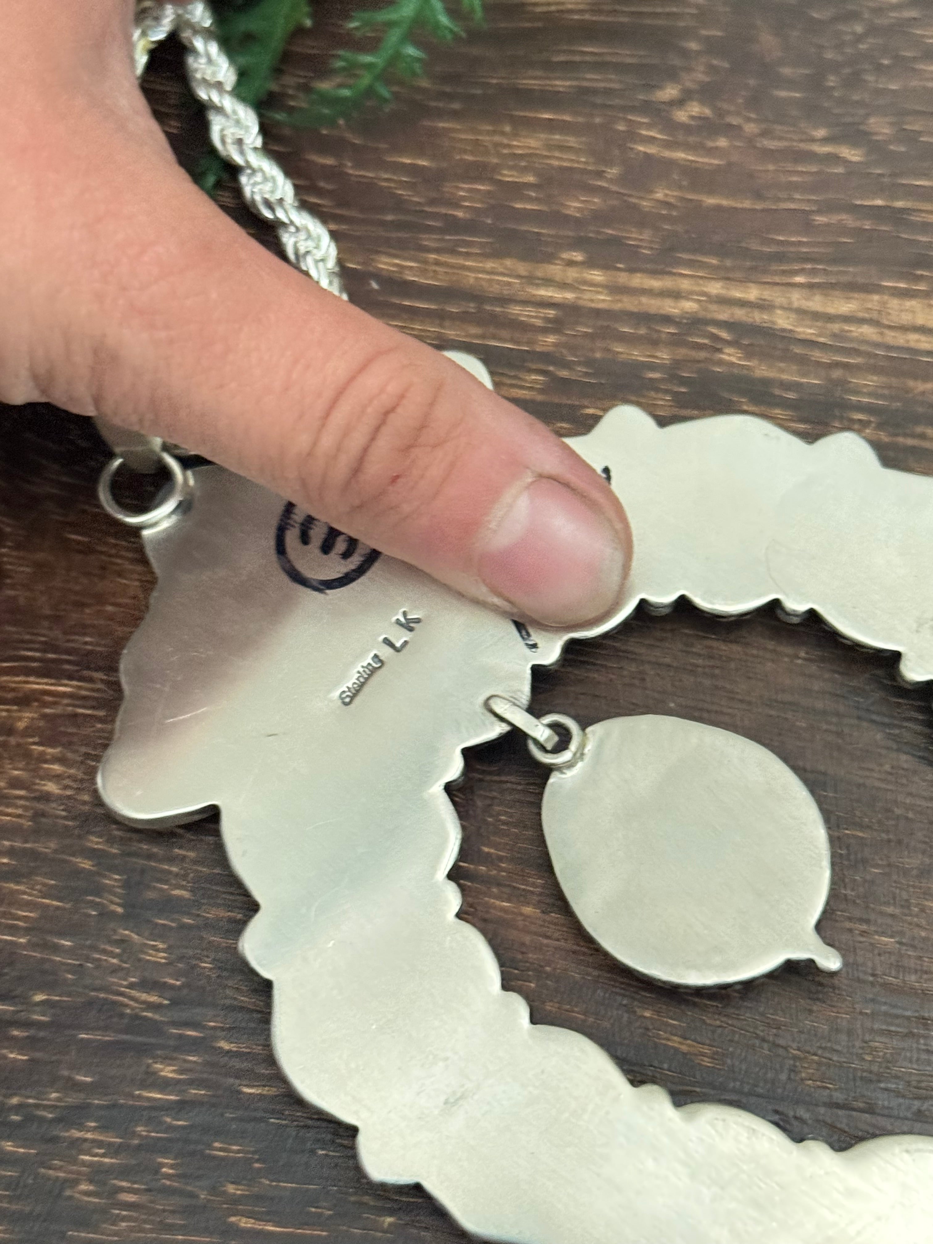 Larry Kaye Kingman Turquoise & Sterling Silver Cluster Naja Pendant. It measures 4 3/8 inches long & 3 1/8 inches wide. Signed by artist and stamped sterling silver. Pendant Only!