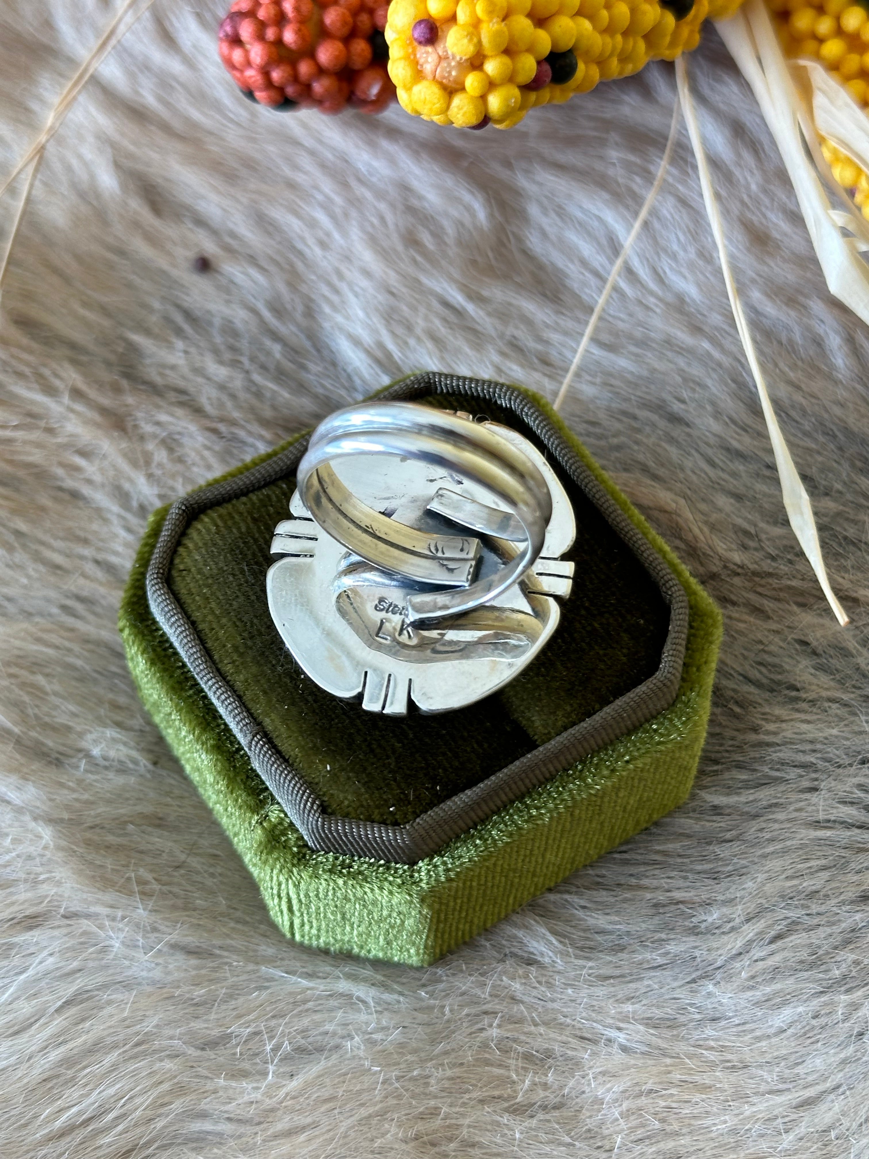 Beautiful ring. Larry Kaye Spiny Oyster & Sterling Silver Adjustable Ring. It measures 1 1/4 inches long and 1 1/8 inches wide. Signed by the artist and stamped sterling silver.