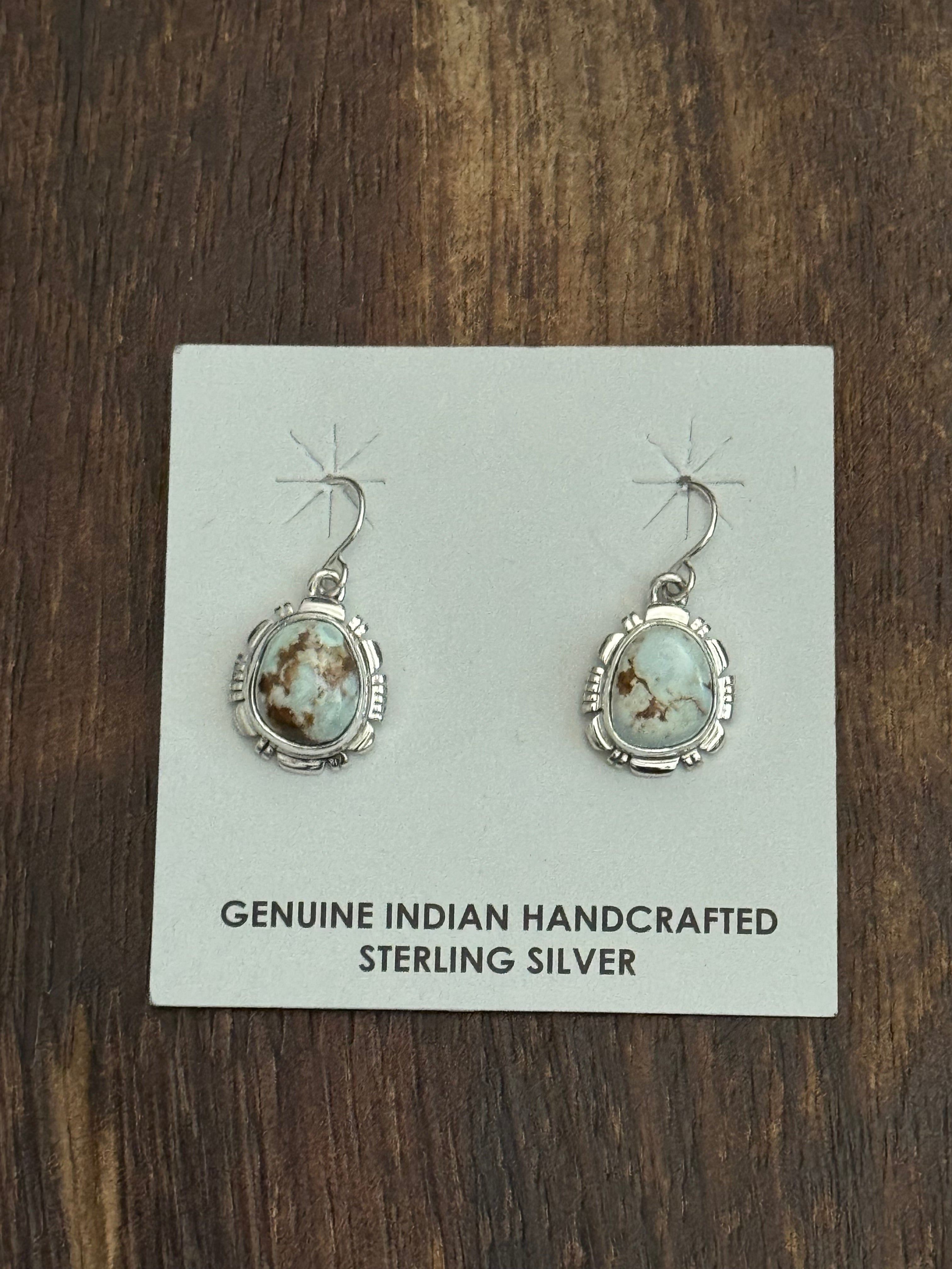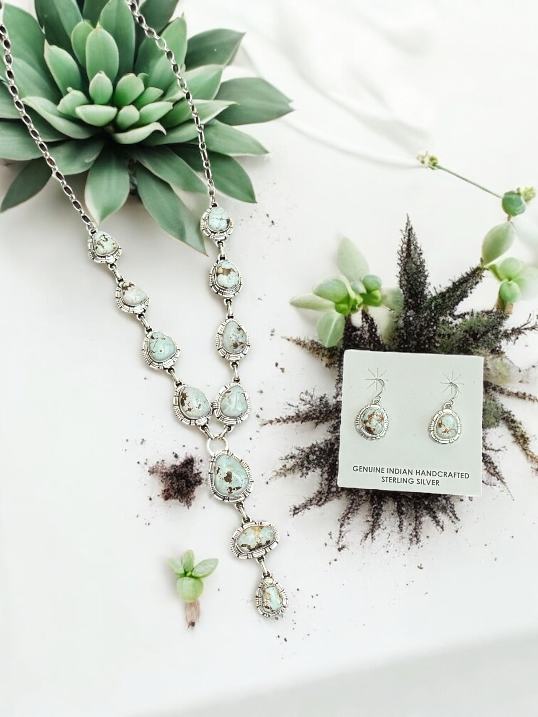 Beautiful Necklace and Earring set. Larry Moses Yazzie Dry Creek Turquoise & Sterling Silver Necklace Set. It measures 30 inches long with hang while the chain measures 24 inches long. Signed by the artist and stamped sterling silver.