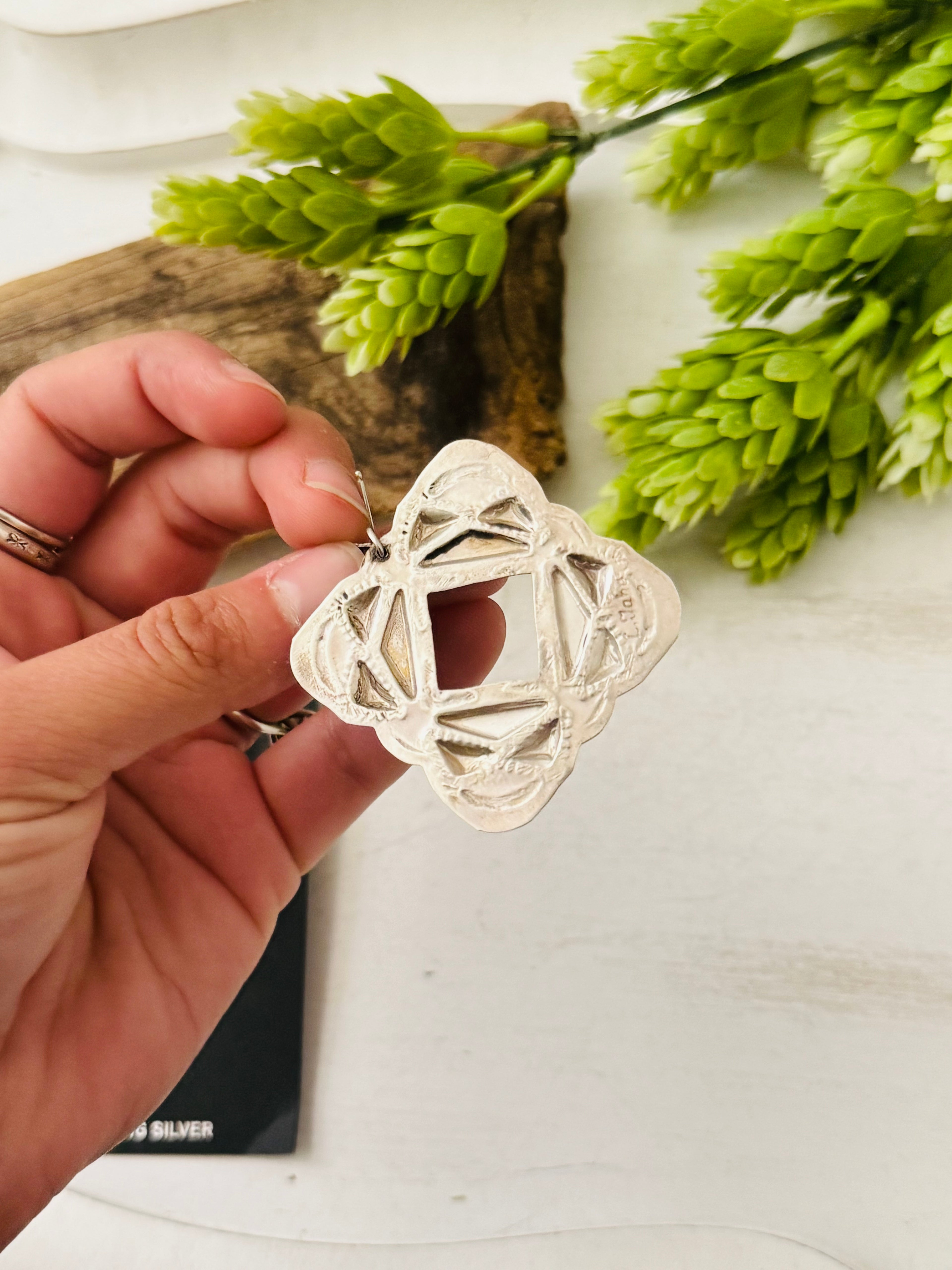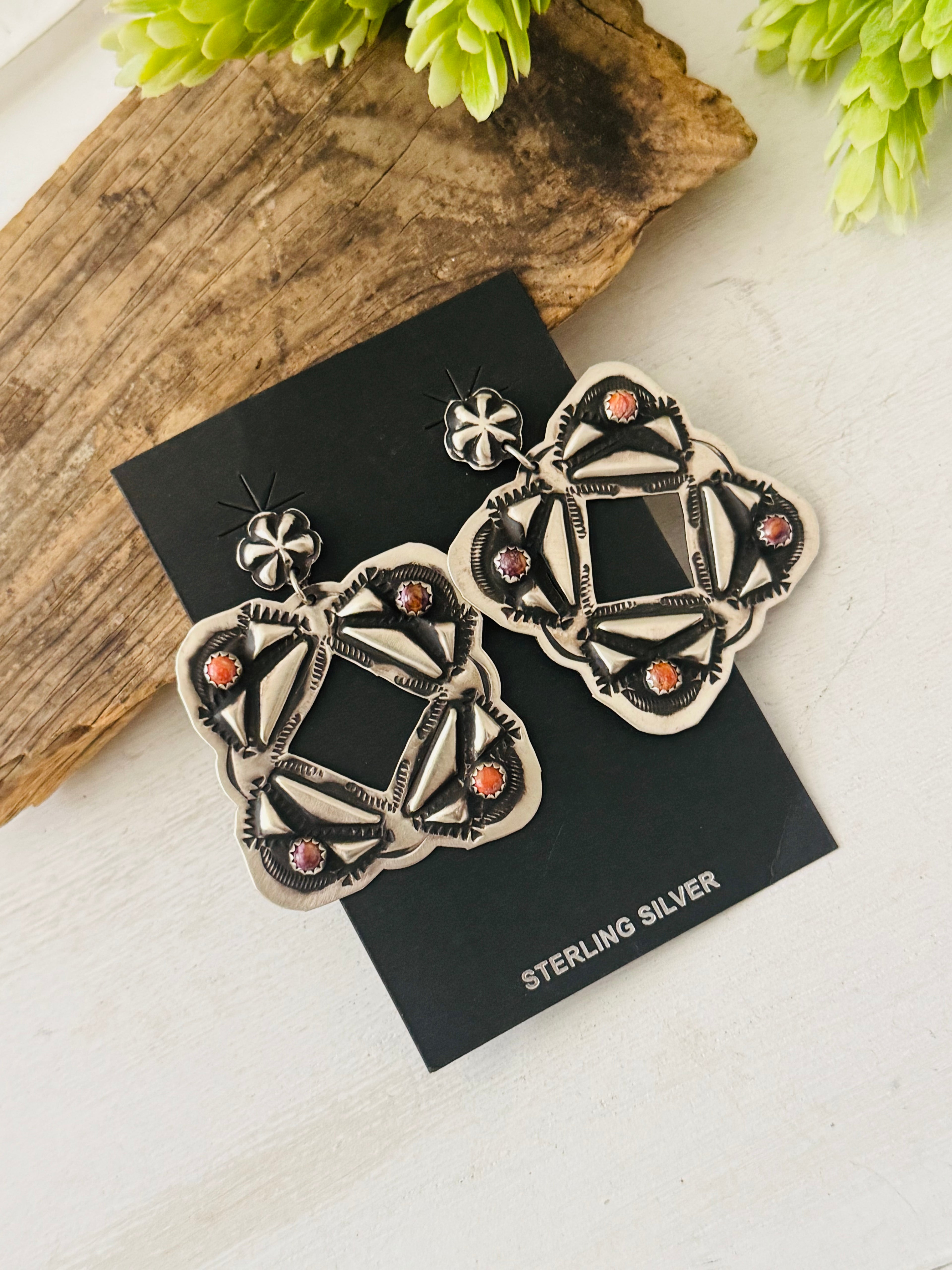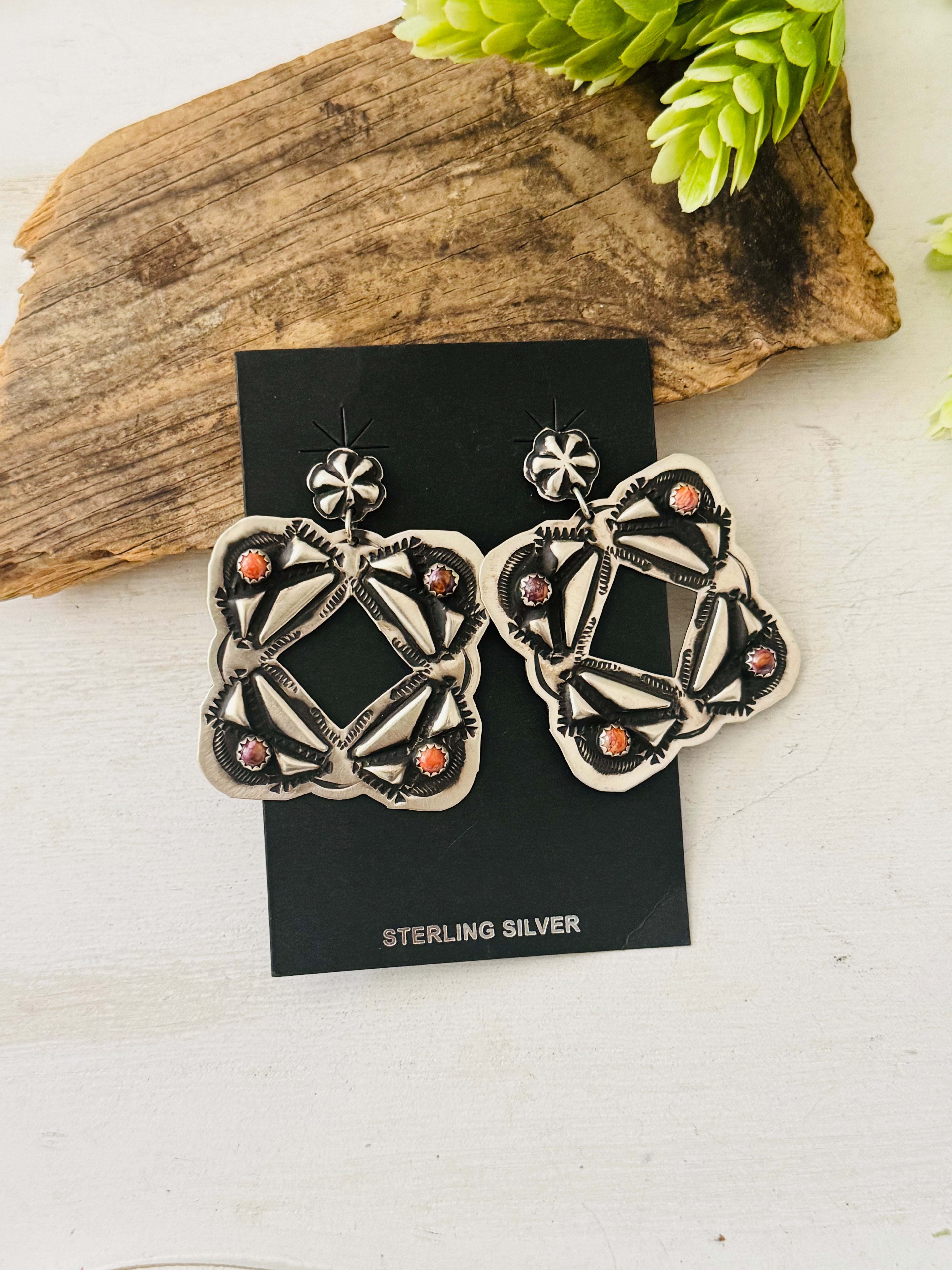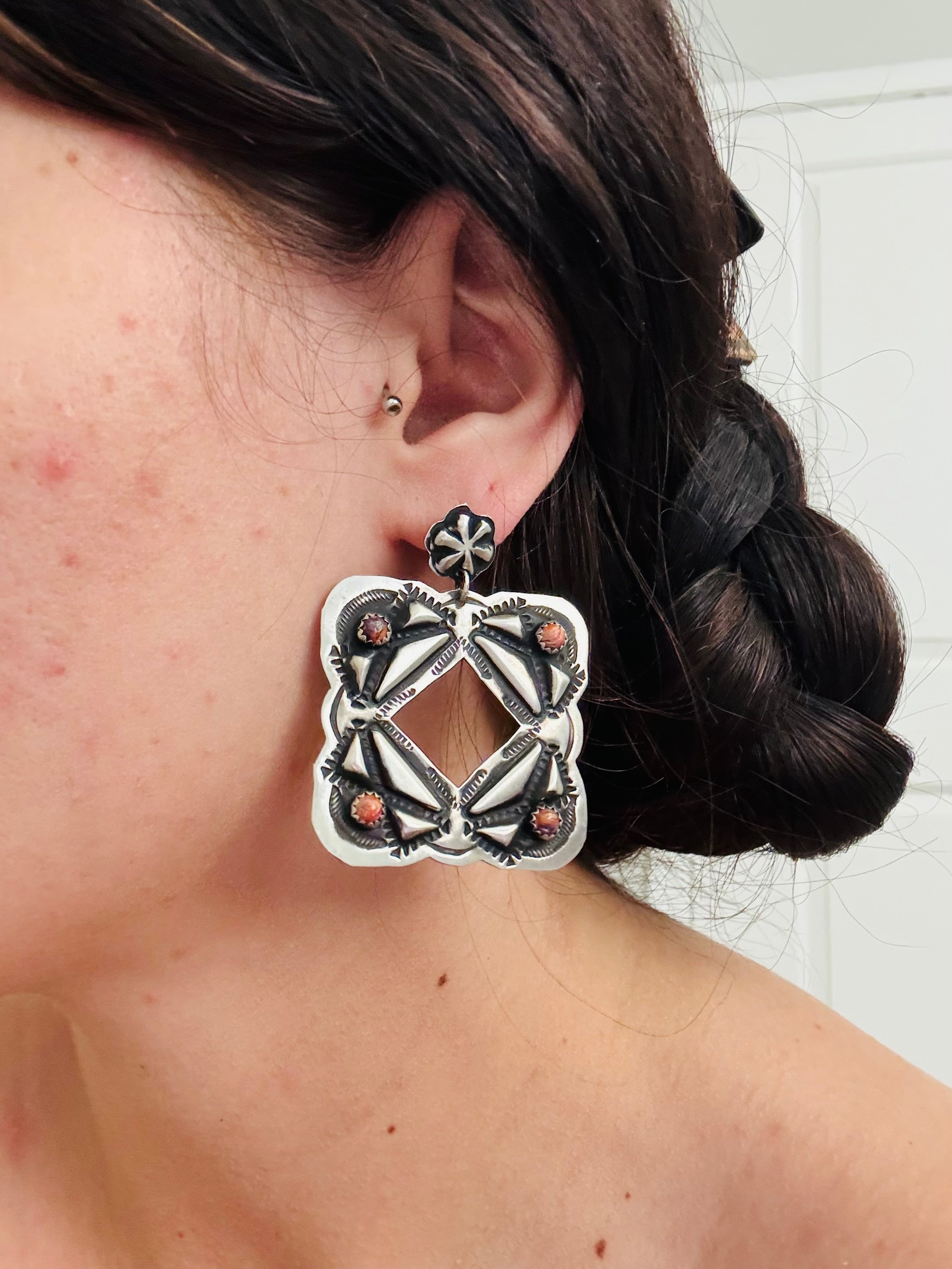 Leander Tahe Spiny Oys & Sterling Silver Concho Post Dangle Earrings. It measures 2 1/8 inches long and just under 1 5/8 inches wide. Signed by the artist and stamped sterling silver.