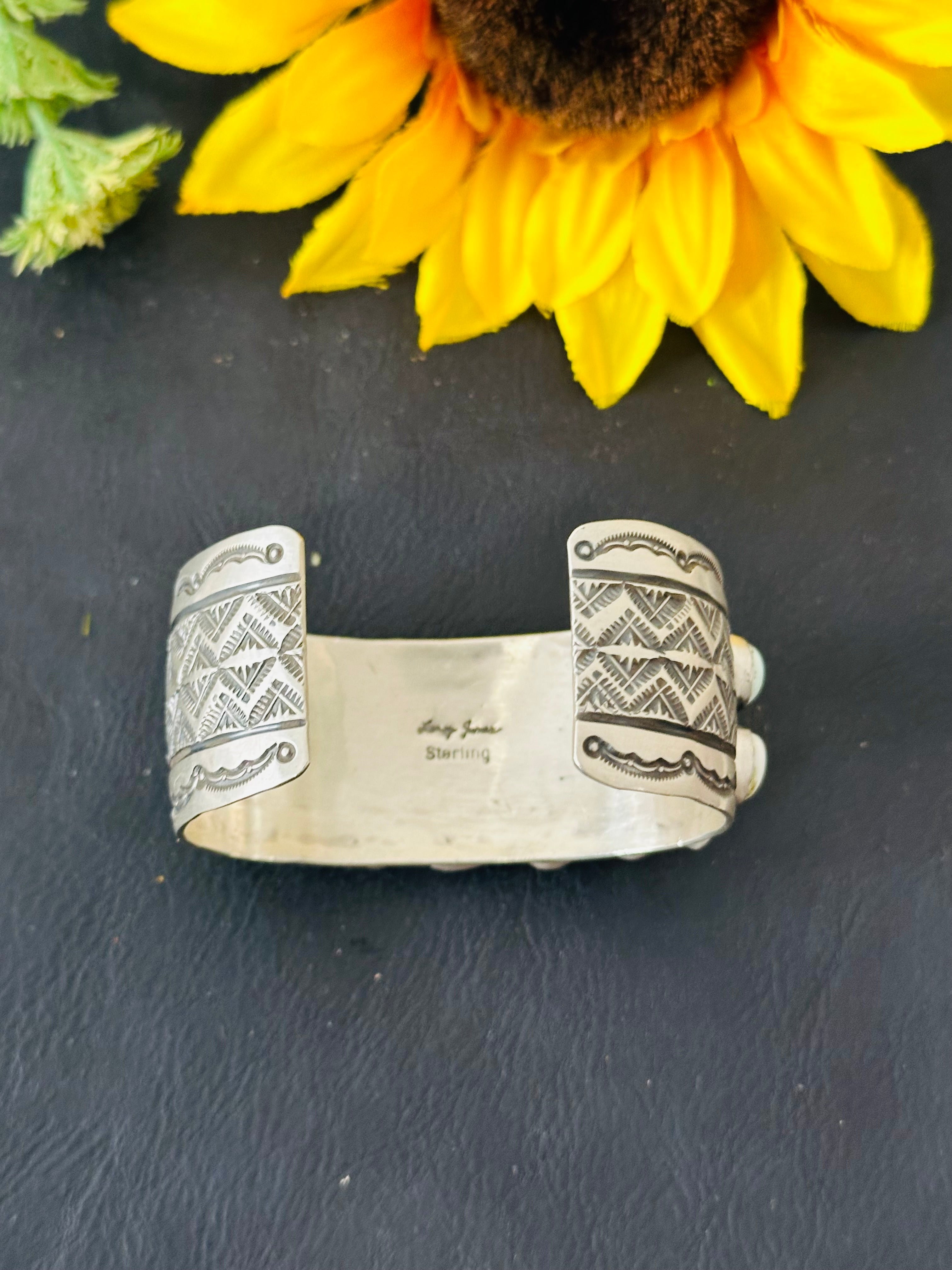LeRoy James Palomino Variscite & Sterling Silver Cuff Bracelet. It measures 1 1/4 inches wide with an inside circumference of 5 5/8 inches and a gap of 1 1/8 inches. Signed by artist and stamped sterling silver.