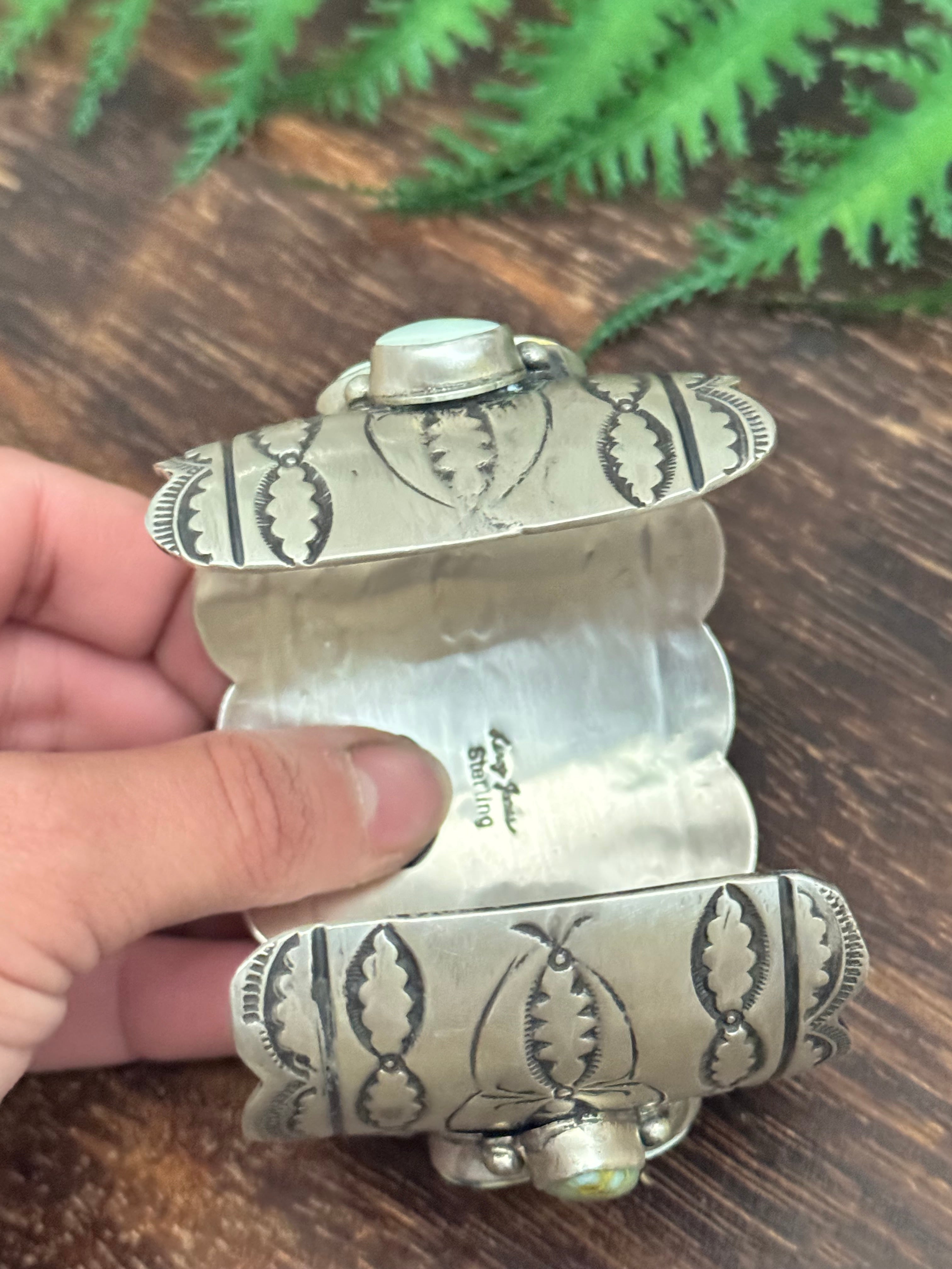 LeRoy James Palomino Variscite & Sterling Silver Cuff Bracelet. It measures 2 1/4 inches wide with an inside circumference of 6 inches and a gap of 1 1/4 inches. Signed by artist and stamped sterling silver.