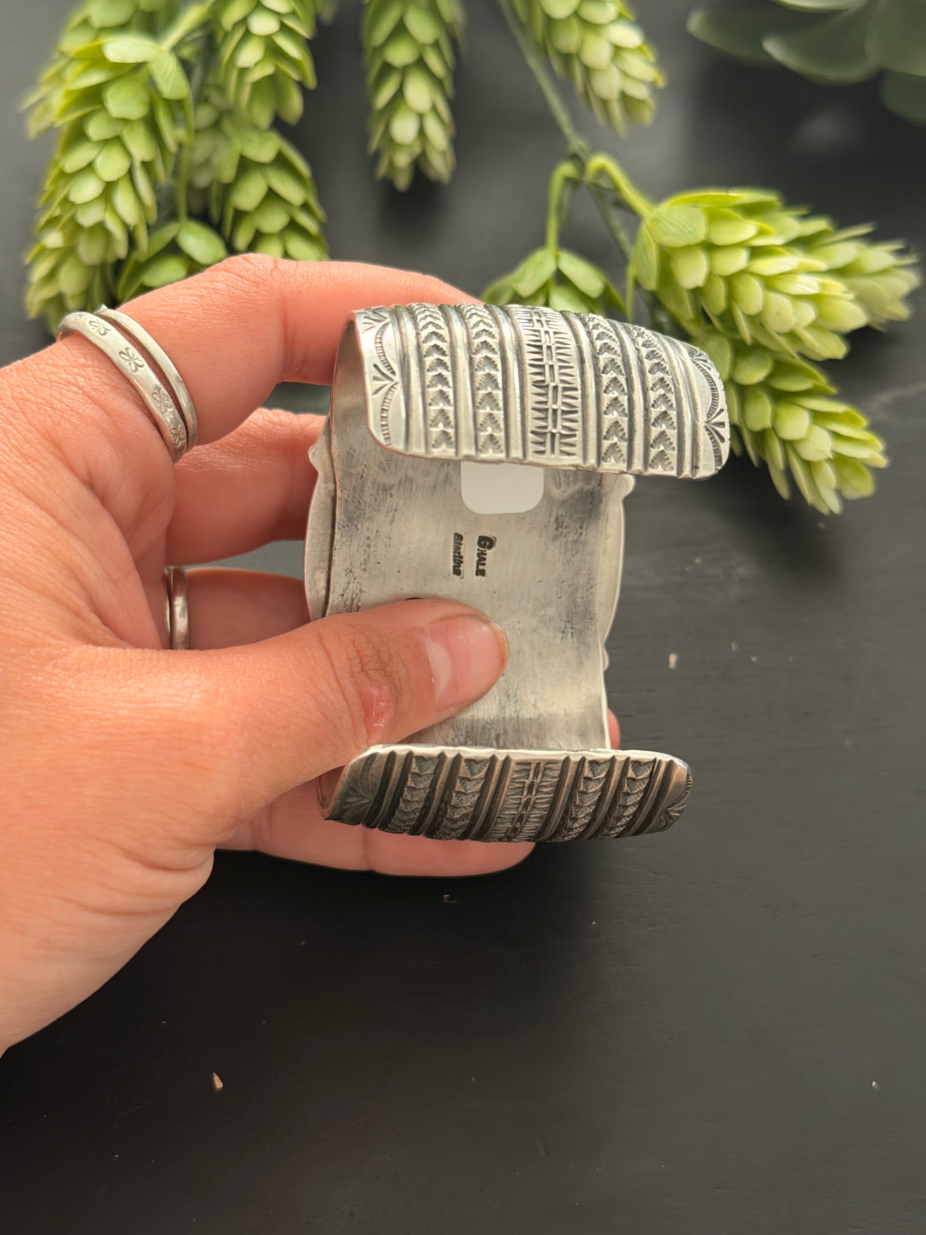 Garett Hale Royston Turquoise & Sterling Silver Cuff Bracelet. It measures 1 3/4 inches wide with an inside circumference of 5 3/8 inches and a gap of 1 1/4 inches. Signed by the artist and stamped sterling silver.