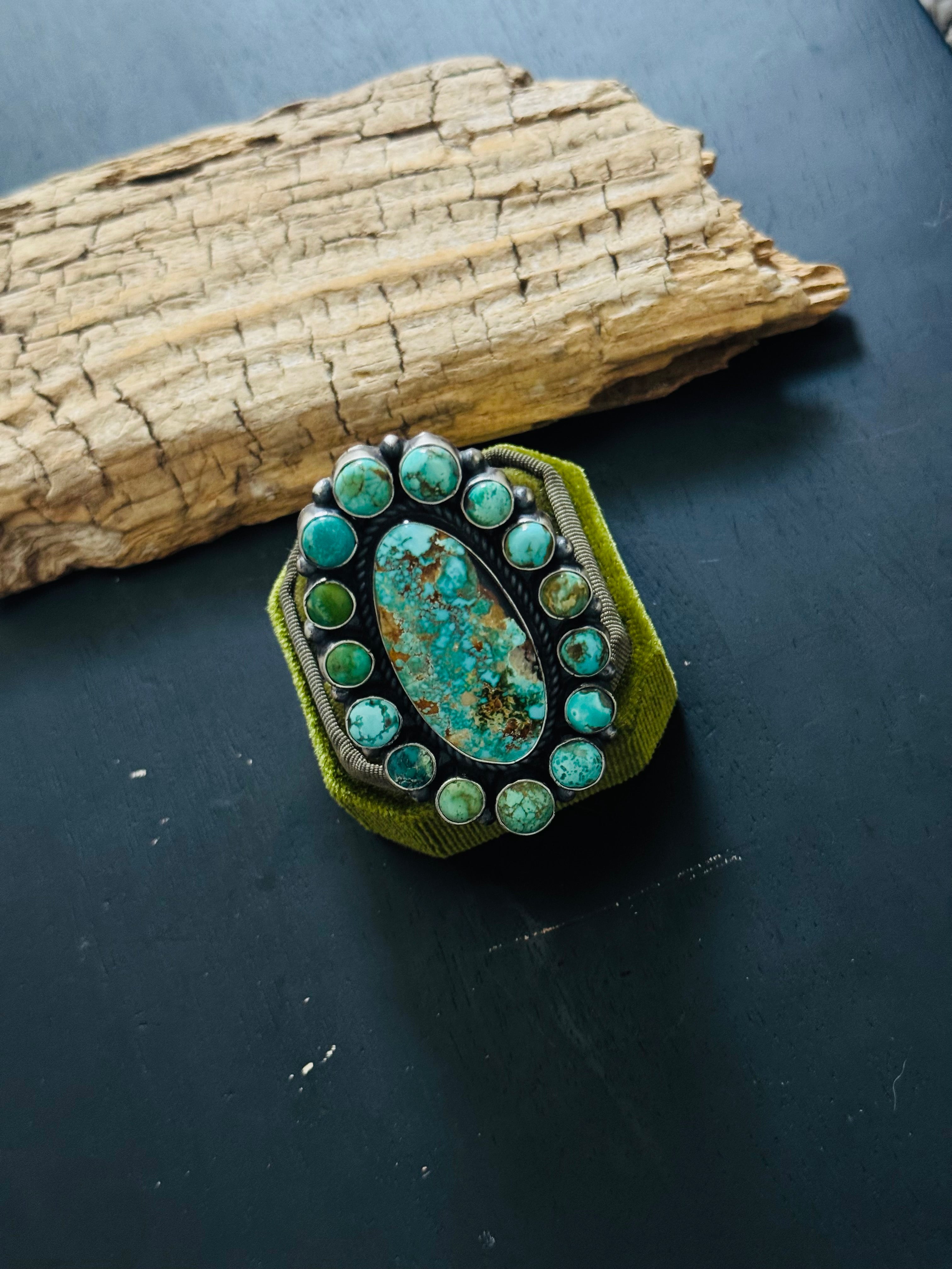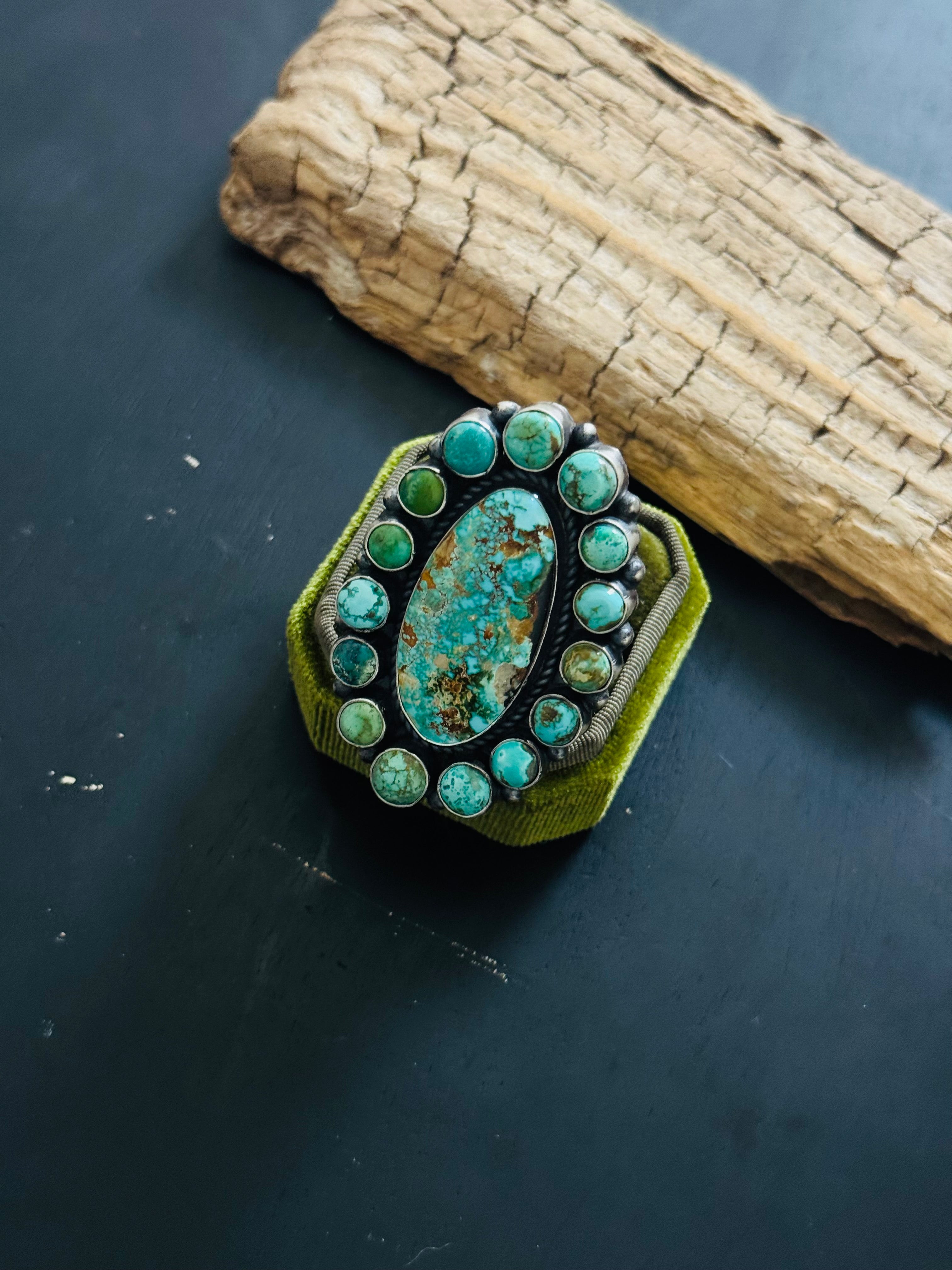 Amos Jake Mixed Turquoise & Sterling Silver Adjustable Cluster Ring. It measures 2 1/4 inches long and 1 1/2 inches wide. Signed by the artist and stamped sterling silver.